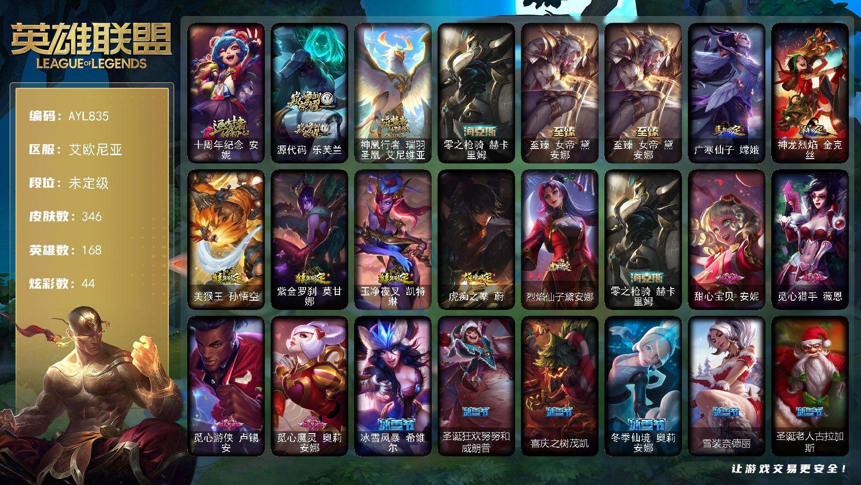 [17482220]未定级段位-168英雄-346皮肤-44炫彩-2终极-5神话-84限定-35传说-81史诗 【神话皮肤】:十周年纪念安妮,源代码乐芙兰,神凰行者瑞羽圣凰艾尼维亚,零之枪骑赫卡里姆,至臻女帝黛安娜 【热门头像】:卡特琳娜的匕首头像,爱情之歌头像 【至臻皮肤】:至臻女帝黛安娜 【臻彩皮肤】:霸天巨兽雪崩墨菲特 【年限皮肤】:广寒仙子嫦娥,神龙烈焰金克丝,美猴王孙悟空,紫金罗刹莫甘娜,玉净夜叉凯特琳,虎痴之拳蔚,烈焰仙子黛安娜 【海克斯皮肤】:零之枪骑赫卡里姆 【情人节限定】:甜心宝贝安妮,觅心猎手薇恩,觅心游侠卢锡安,觅心魔灵奥莉安娜 【冰雪限定】:冰雪风暴希维尔,圣诞狂欢努努和威朗普,喜庆之树茂凯,冬季仙境奥莉安娜,雪装奈德丽,圣诞老人古拉加斯,魄罗骑士瑟庄妮,雪球也能爆炸吉格斯,寒冬精灵璐璐,冰雪节格雷福斯 【终极皮肤】:DJ娑娜,灵魂守卫乌迪尔 【限定皮肤】:冰原狙击凯特琳,卧虎藏龙贾克斯,地底世界崔斯特,冠军之刃锐雯,冠军典狱长锤石,冠军之矛卡莉丝塔,冠军之刃锐雯2016,冠军掠夺者卡兹克,Fnatic古拉加斯,Fnatic迦娜,Fnatic嘉文四世,Fnatic库奇,暗杀星奥莉安娜,暗杀星伊泽瑞尔,SKTT1劫,SKTT1李青,SSW辛吉德,SSW图奇,SSW泰隆,SSW雷恩加尔,SSW锤石,SKTT1阿利斯塔,SKTT1阿兹尔,SKTT1卡莉丝塔,SKTT1雷克顿,SKTT1瑞兹,SKTT1伊莉丝,SKTT1扎克,SSG嘉文四世,iG菲奥娜,iG艾瑞莉娅,iG卡蜜尔,iG卡莎,iG乐芙兰,iG洛,电玩女神厄运小姐,电玩勇者锐雯,电玩女神阿狸,胜利女神莫甘娜,胜利女神希维尔,胜利之树茂凯,胜利枪神格雷福斯,胜利女神奥莉安娜,胜利之剑亚托克斯,胜利枪神卢锡安,南瓜头费德提克,灵魂收割者索拉卡,魅惑女巫奈德丽,糖果使徒费德提克,泳池派对厄运小姐,泳池派对菲奥娜,泳池派对格雷福斯,泳池派对雷克顿,泳池派对李青,女猎手希维尔,野兽猎人德莱文,创战纪希维尔,永恒之森乐芙兰,勇者阿狸,电玩战魂赫卡里姆,红桃杰克崔斯特,防暴天使凯尔,惊悚派对阿木木 【传说皮肤】:魔幻卡牌崔斯特,战地机甲厄加特,邪鸦魅影乐芙兰,血石领主弗拉基米尔,源计划林易,恶魔男爵瑞兹,霸天零式赛恩,驯龙炮手崔丝塔娜,合金巨兽努努和威朗普,源计划联合艾希,鬼魂新娘莫甘娜,绅士科加斯,律政大亨蒙多,冰霜之