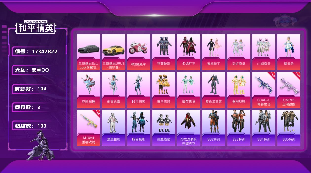 [17342822]安卓 手Q-13粉装-3特效枪-3载具-2粉色飞行器-39803热力值-3王牌印记-104套装-100枪皮