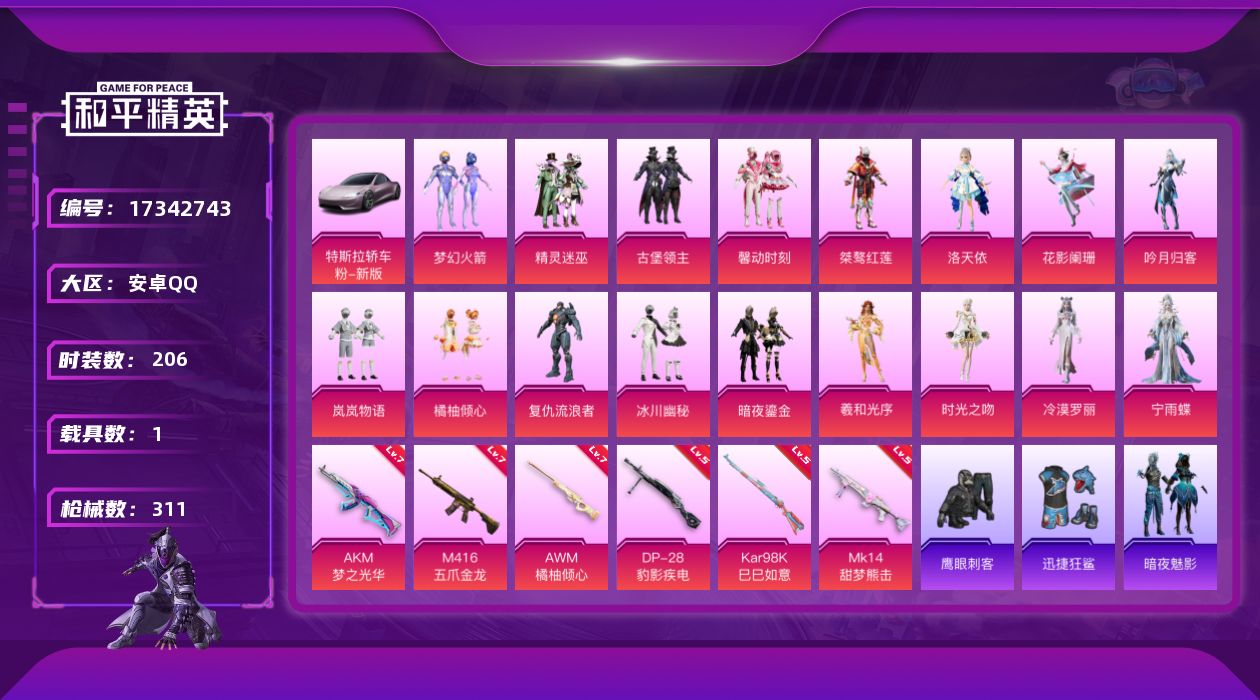 [17342743]安卓 手Q-17粉装-6特效枪-1载具-5粉色飞行器-99957热力值-11王牌印记-206套装-311枪皮