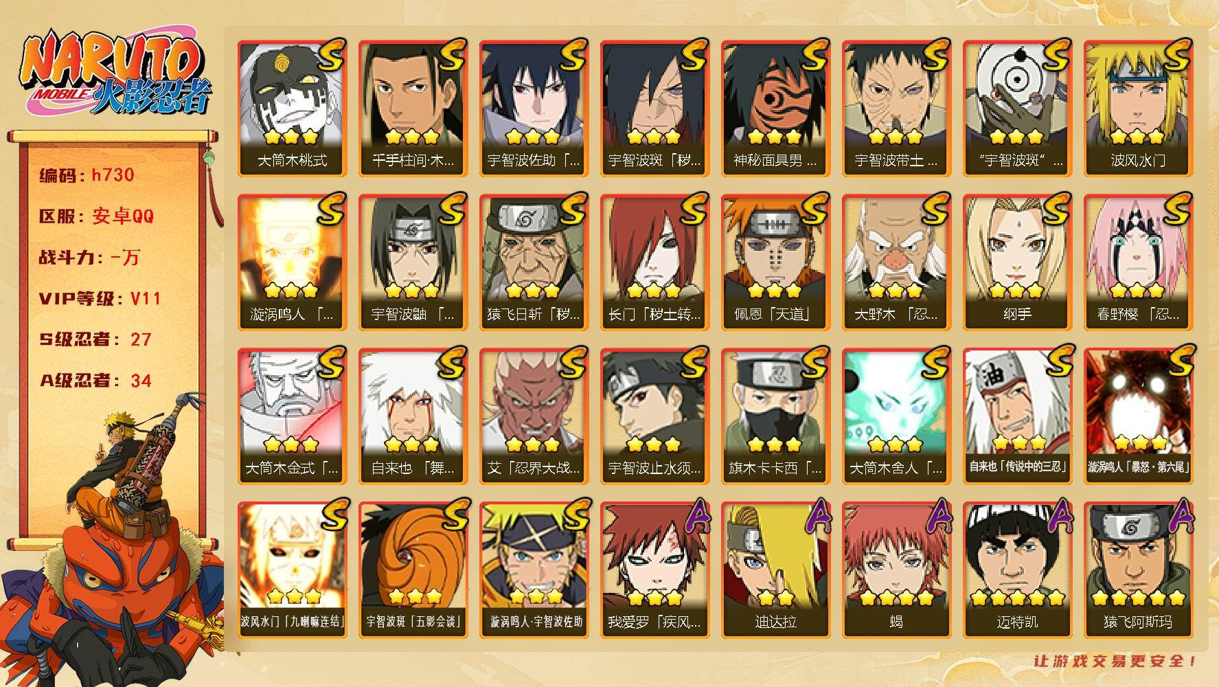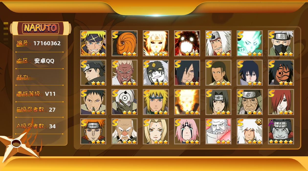[17160362] VIP11,1291W战力,S忍27个,A忍34个,点券1425,金币23000