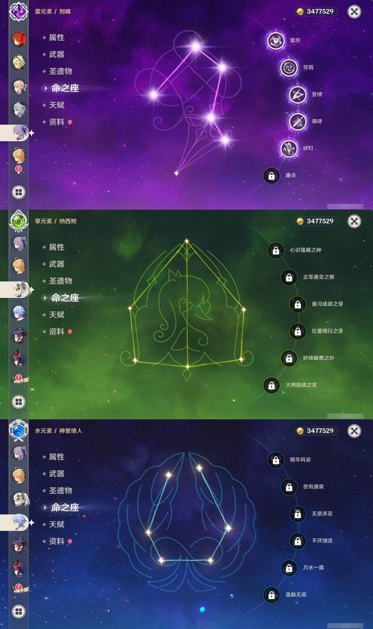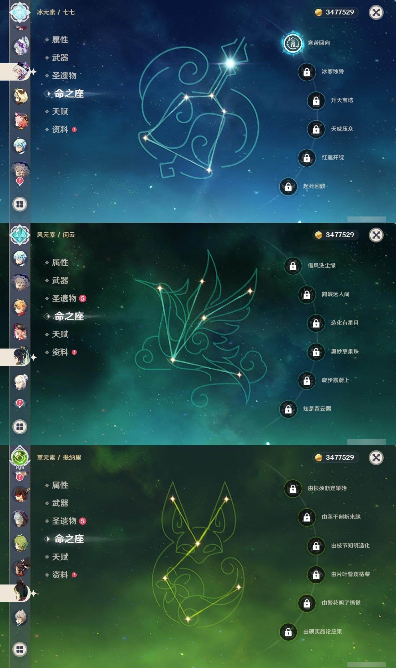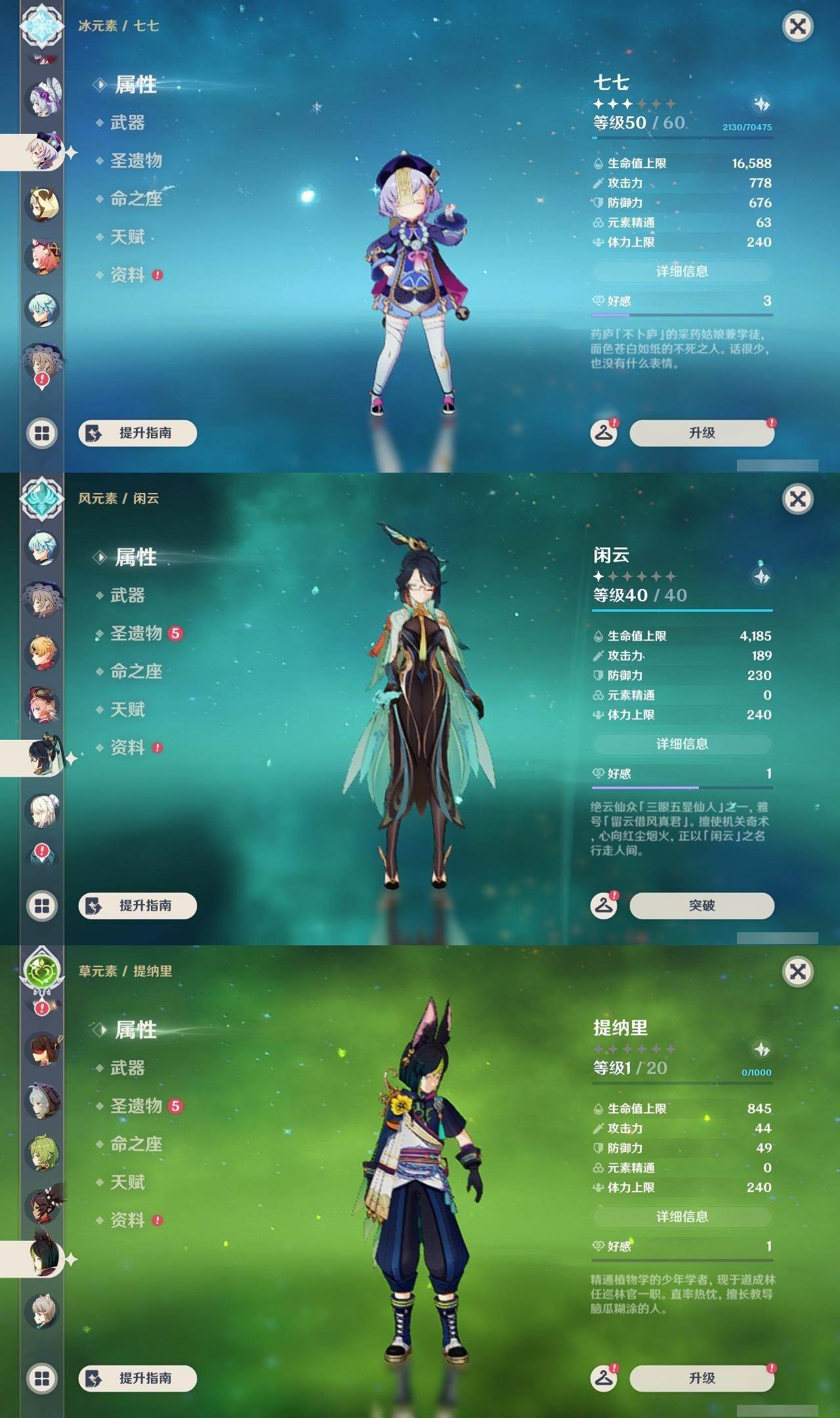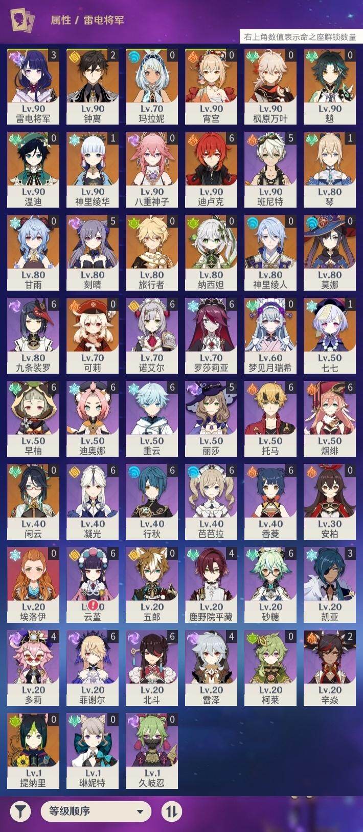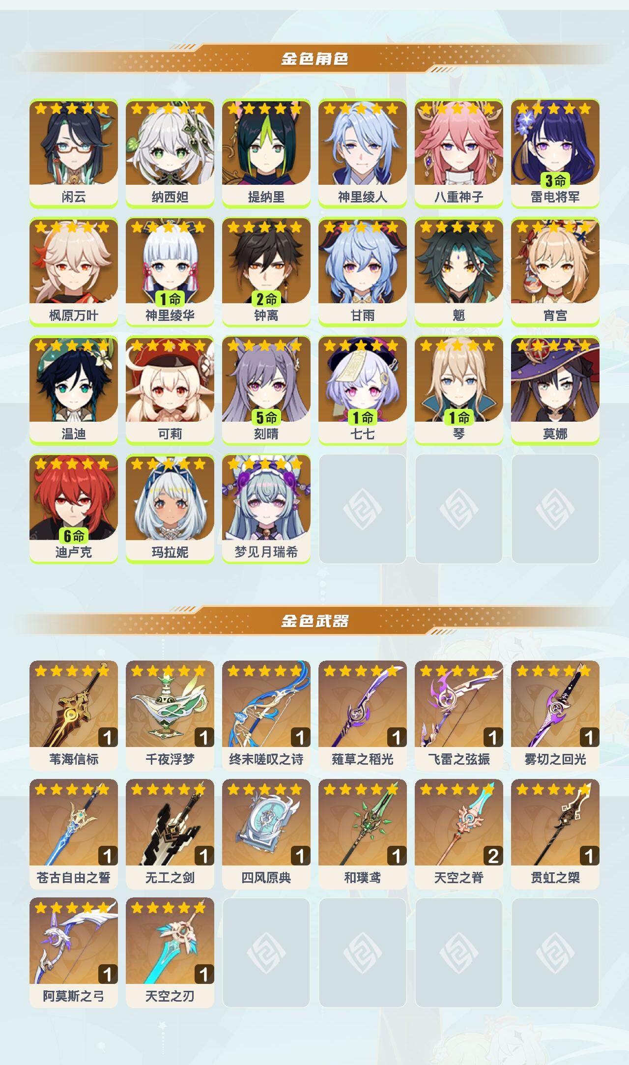 0命闲云,0命纳西妲,0命提纳里,0命神里绫人,0命八重神子,3命雷电将军,0命枫原万叶,1命神里绫华,2命钟离,0命甘雨,0命魈,0命宵宫,0命温迪,0命可莉,5命刻晴,1命七七,1命琴,0命莫娜,满命迪卢克,0命玛拉妮,0命梦见月瑞希,精1苇海信标,精1千夜浮梦,精1终末嗟叹之诗,精1薙草之稻光,精1飞雷之弦振,精1雾切之回光,精1苍古自由之誓,精1无工之剑,精1四风原典,精1和璞鸢,精2天空之脊,精1贯虹之槊,精1阿莫斯之弓,精1天空之刃