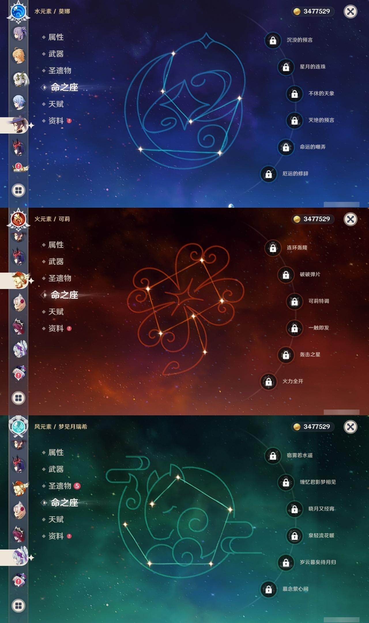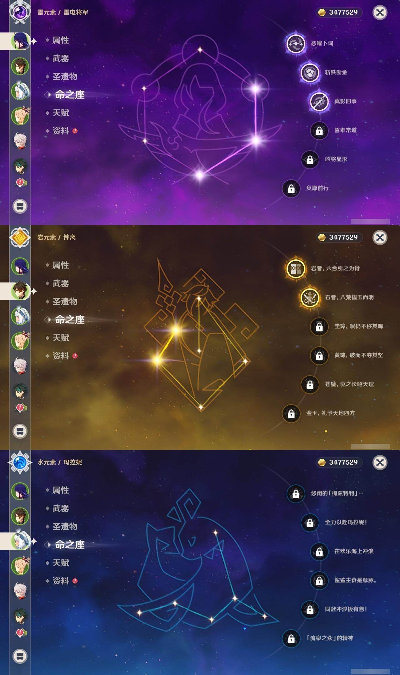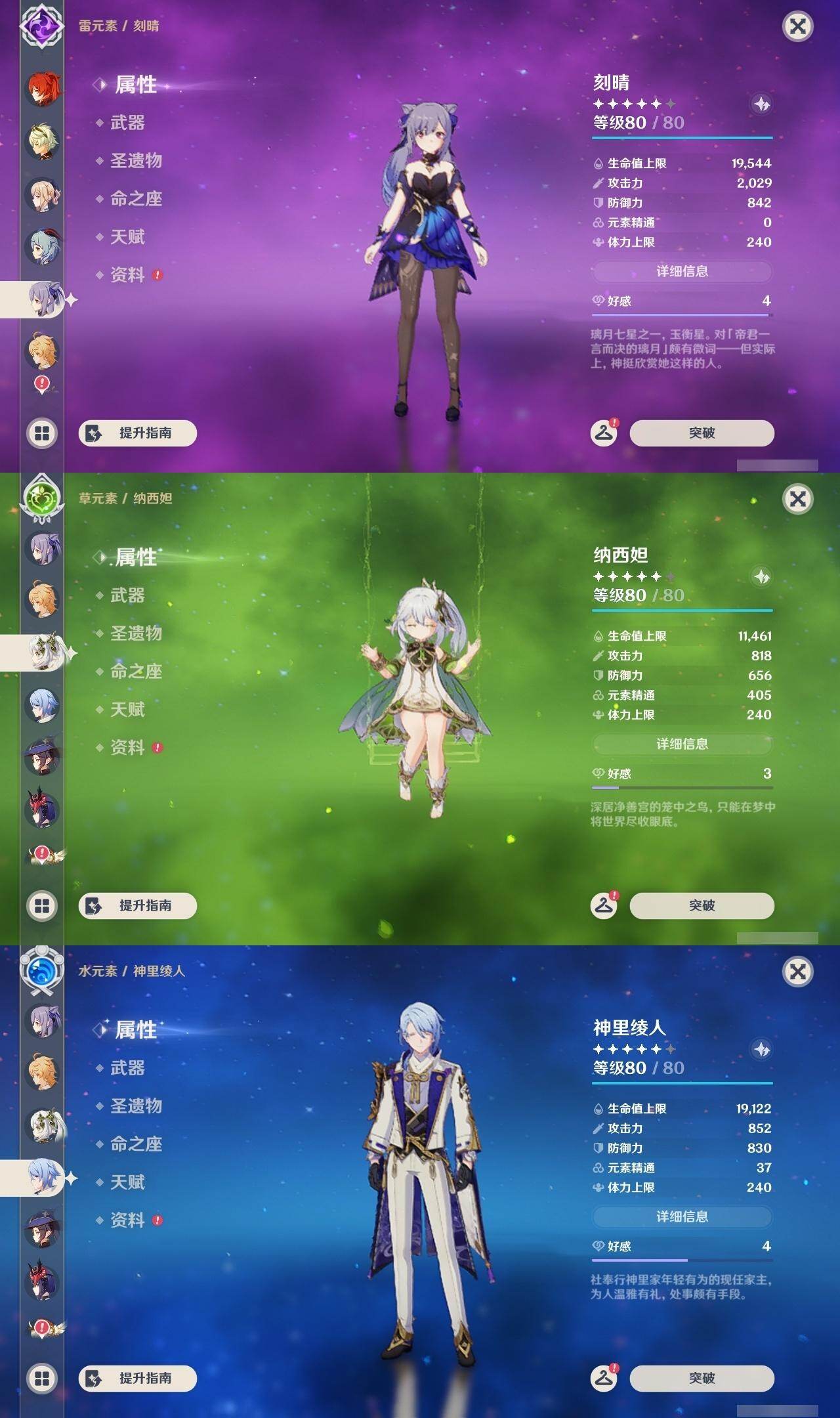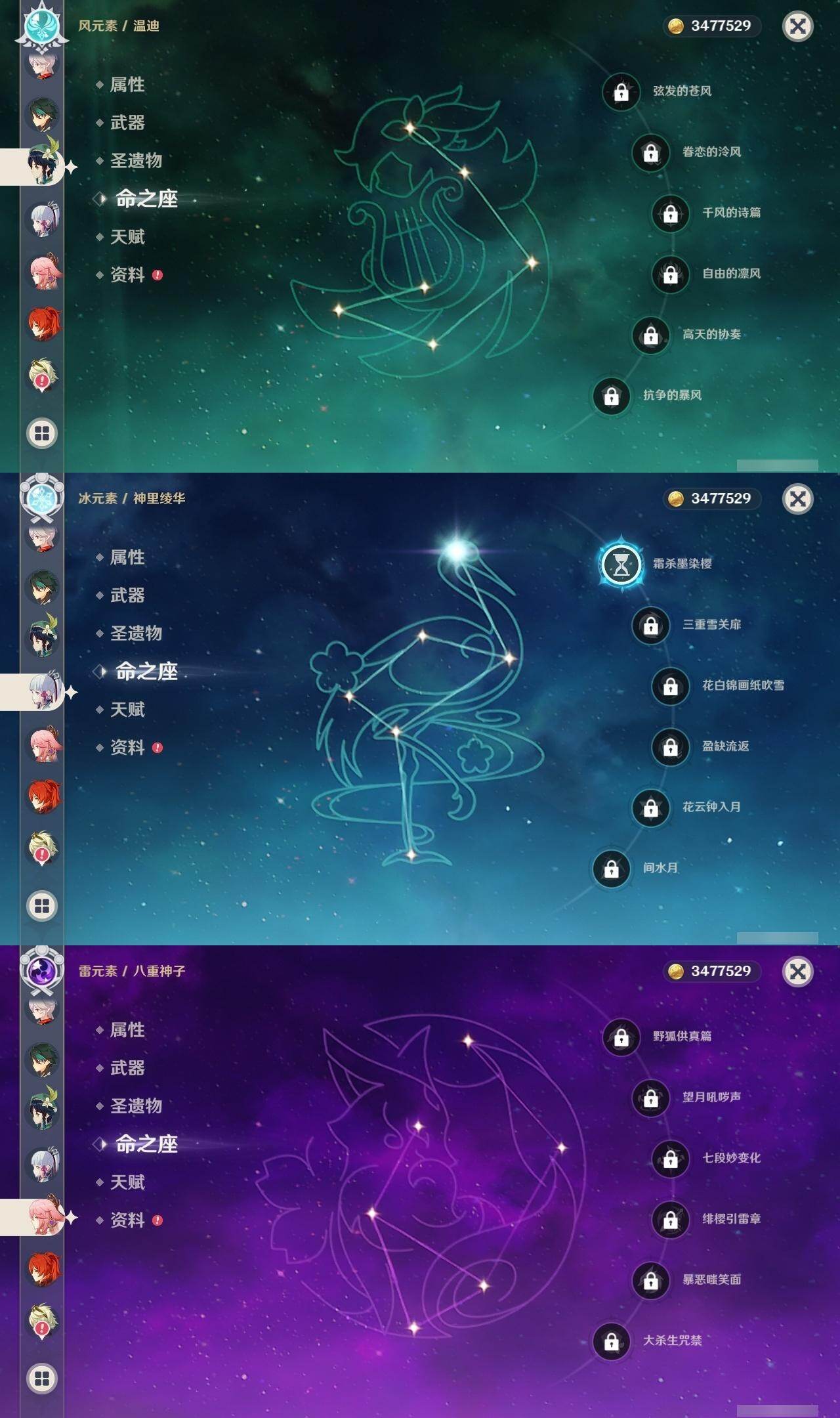 0命闲云,0命纳西妲,0命提纳里,0命神里绫人,0命八重神子,3命雷电将军,0命枫原万叶,1命神里绫华,2命钟离,0命甘雨,0命魈,0命宵宫,0命温迪,0命可莉,5命刻晴,1命七七,1命琴,0命莫娜,满命迪卢克,0命玛拉妮,0命梦见月瑞希,精1苇海信标,精1千夜浮梦,精1终末嗟叹之诗,精1薙草之稻光,精1飞雷之弦振,精1雾切之回光,精1苍古自由之誓,精1无工之剑,精1四风原典,精1和璞鸢,精2天空之脊,精1贯虹之槊,精1阿莫斯之弓,精1天空之刃