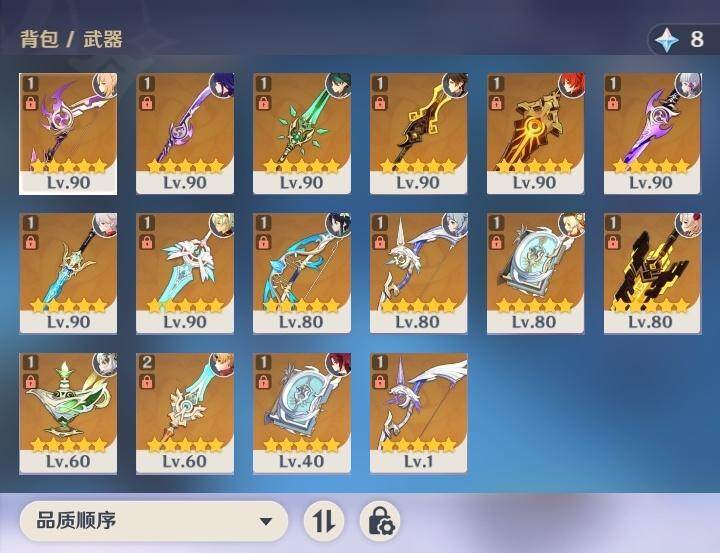 飞雷之弦阵,薙草之稻光,和璞鸢,贯虹之槊,苍古自由之誓,天空之刃,终末嗟叹之诗,阿莫斯之弓,四风原典,无工之剑,天空之脊