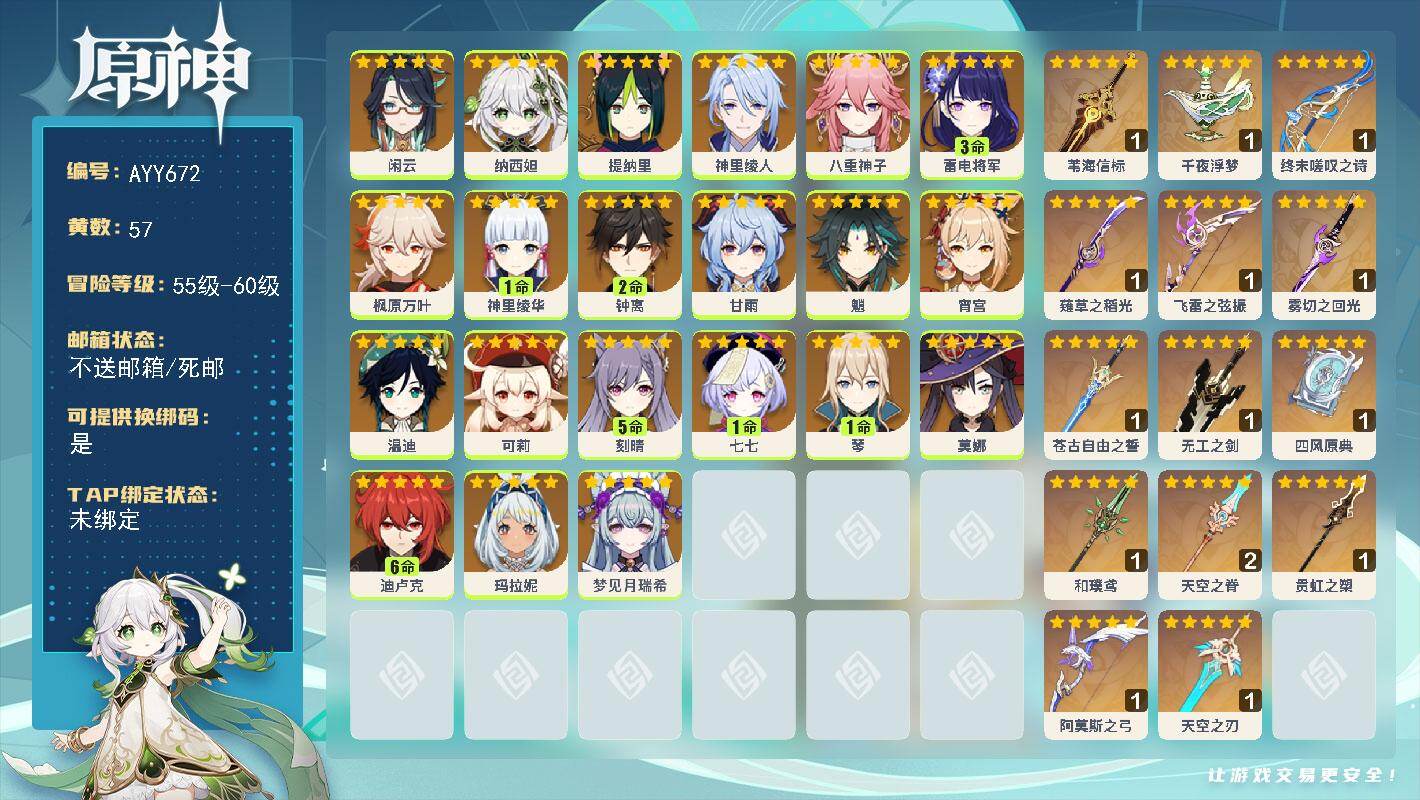 [17482680]57级/57黄/男主/21个五星角色/16个五星武器 0命闲云,0命纳西妲,0命提纳里,0命神里绫人,0命八重神子,3命雷电将军,0命枫原万叶,1命神里绫华,2命钟离,0命甘雨,0命魈,0命宵宫,0命温迪,0命可莉,5命刻晴,1命七七,1命琴,0命莫娜,满命迪卢克,0命玛拉妮,0命梦见月瑞希,精1苇海信标,精1千夜浮梦,精1终末嗟叹之诗,精1薙草之稻光,精1飞雷之弦振,精1雾切之回光,精1苍古自由之誓,精1无工之剑,精1四风原典,精1和璞鸢,精2天空之脊,精1贯虹之槊,精1阿莫斯之弓,精1天空之刃
