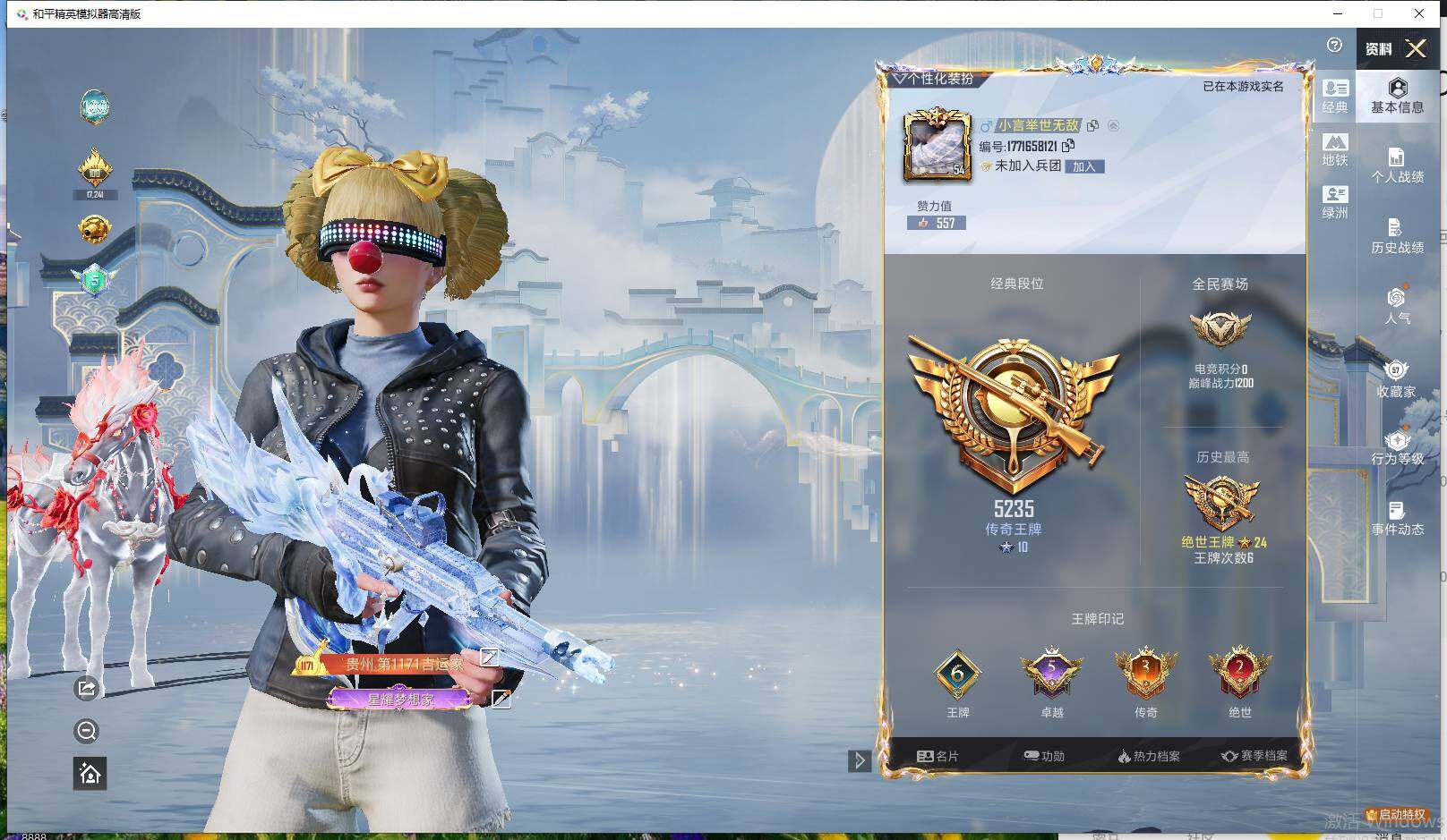 - [11994487]可二次 可修改实名 排位资格:有 1传说角色 1传说武器 2王者武器 28V武器 1V角色 3皮肤 可排位 武器:麒麟刺-百战金芒,9A91-烈火,barrett-金色蔷薇,炼狱-百战金芒,烟雾弹-雷暴,王者白虎,烟雾弹-雷霆,机械迷城-穹宇,M4A1-千变,M4A1-黑龙,王者雷怒,Barrett-毁灭,M4A1-雷神,轻型军用手斧-再燃火线,死亡之眼,AK47-火麒麟,M4A1-黑骑士,M4A1-青龙,M200-幻神,AWM-天龙,传说光耀,王者之决-觉醒版,M4A1-玫瑰精灵,加特林-炼狱,AN94-超新星,沙鹰-修罗,M4A1-再燃火线