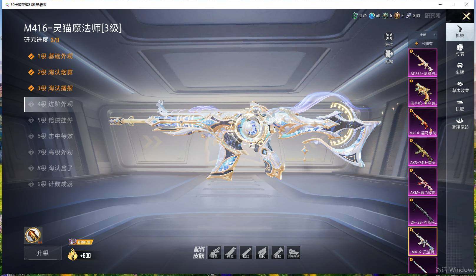 【粉色枪皮等级】:AKM-暮色玫影(三级),M416-灵猫魔法师(三级),GROZA-精灵之光(三级),AUG-星梦奇缘(六级),ACE32-萌骑漫游(一级),AKS-74U-森灵之息(五级),Kar98K-巳巳如意(五级),Mk14-福马献瑞(五级),DP-28-豹影疾电(五级),MG3-洛神天依(一级),信号枪-金乌曜日(一级)