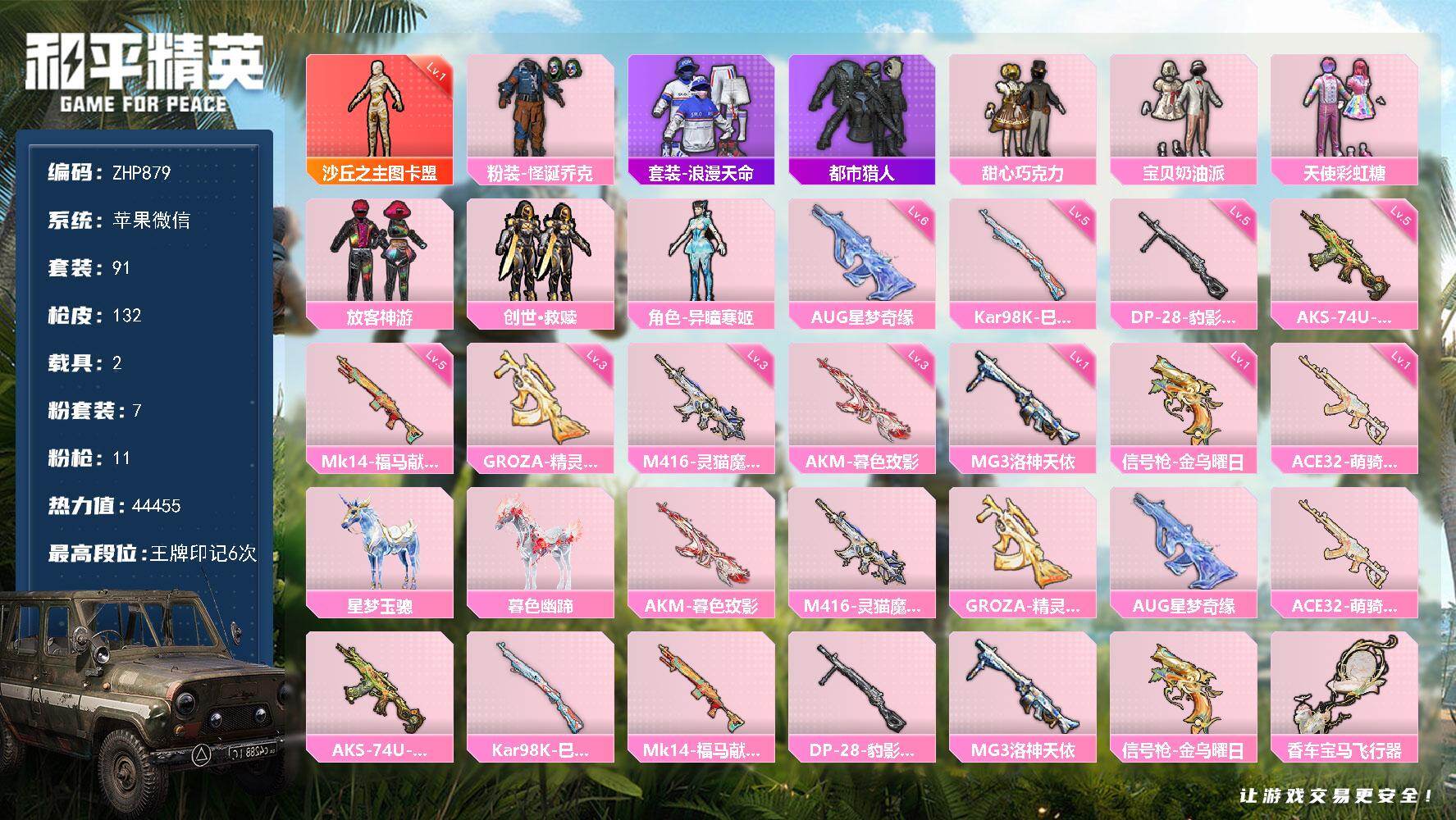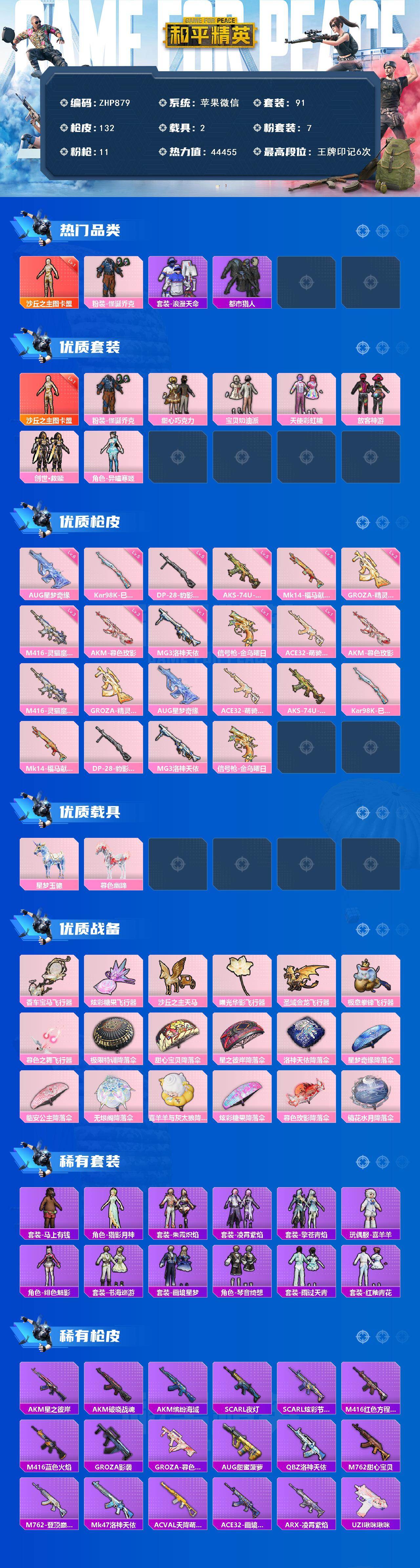 - [11105696]13粉装 11特效枪 5载具 19印记 可二次 可修改实名 身法装备:暗影哥特(红眼罩),2号机款机体服(红螳螂),巡查员衣服(绝对防御上衣) 热门装扮:2号机款机体服(红螳螂),巡查员衣服(绝对防御上衣),天使彩虹糖,数码大师,炙焰红王,天禅智恒,酣梦娃娃,暗星紫秘,炙焰牛王,彩虹甜喵,旋转彩虹,暗夜鎏金,歌者泠鸢,创世·救赎,兔兔白日梦,恶魔喵喵,大橘为重,恒星战甲,迅捷狂鲨,呆萌铁蟹,深海小丑鱼,东方飞龙,好奇恐龙,暗夜魅影 载具:冰辰御座(神秘蓝),合金龙骨(蓝),兰博基尼Estoque(银翼灰),擎天重拳,杜卡迪 Panigale V4(杜卡迪红) 稀有枪皮:Kar98K-巳巳如意,Mk14精灵梦叶罗丽,M416暖熊萌萌,AKM梦之光华,SCAR-L童趣迷兔,SLR暗夜玫瑰,UMP45恐龙拽拽,M16A4垂柳戏鸭,GROZA旋转彩虹,AUG超新星,MG3酷泡奶龙 七级特效枪:七级UMP45-恐龙拽拽 六级特效枪:六级SCAR-L-童趣迷兔,六级MG3-酷泡奶龙 五级特效枪:五级Mk14-精灵梦叶罗丽,五级Kar98K-巳巳如意,五级AKM-梦之光华,五级AUG-超新星,五级M416-暖熊萌萌 四级特效枪:四级GROZA-旋转彩虹 三级特效枪:三级SLR-暗夜玫瑰,三级M16A4-垂柳戏鸭 紫色装扮:孙悟空,SS21特训,照水倚天,萌趣咩咩,田园牧歌,轻风白浪,和煦暖阳,SS22特训,莱茵河畔,暖心熊熊,娇憨猪猪,SS20特训,浑天鲲鹏,甜心亚梦,虚音幻奏,猎梦纪元,梦幻奶油,酸甜橘柚,俏皮奶喵,夏雨游龙,粉团憨憨,SS2特训,SS3特训,SS5特训,伏击者,摩登艾咪,妙红点点,灵蜜圈圈,幻彩翩翩,SS23特训,SS30特训套装,SS31特训套装,SS33特训套装,军械专家,SS14特训,萌趣颜团子,SS15特训,暗夜傀儡,逆风勇士,SS12特训,镭射皇者,银白舞王,SS13特训,英勇保护者,糖果砰砰,冰暴轰轰,异彩先驱,缤纷焰火,SS18特训,豚鼠丹丹,雪兔飞飞,风铃甜诗,飞驰魅影,音速流光,极速竞梦,SS19特训,军刀雅典娜,魔力冰咖,SS16特训,明日香款战斗服,真理款战斗服,电音精灵,瑞龙福将,团圆交子,醒狮腾龙,SS17特训,炫光向阳,跃动心情,荷畔雨呱,蓝彩潮人,蓝色守护者,虎虎生威吉莉,街头潮人,迅猛虎鲸,迎春赐吉,野性山猫,福星高照,空投萌叽