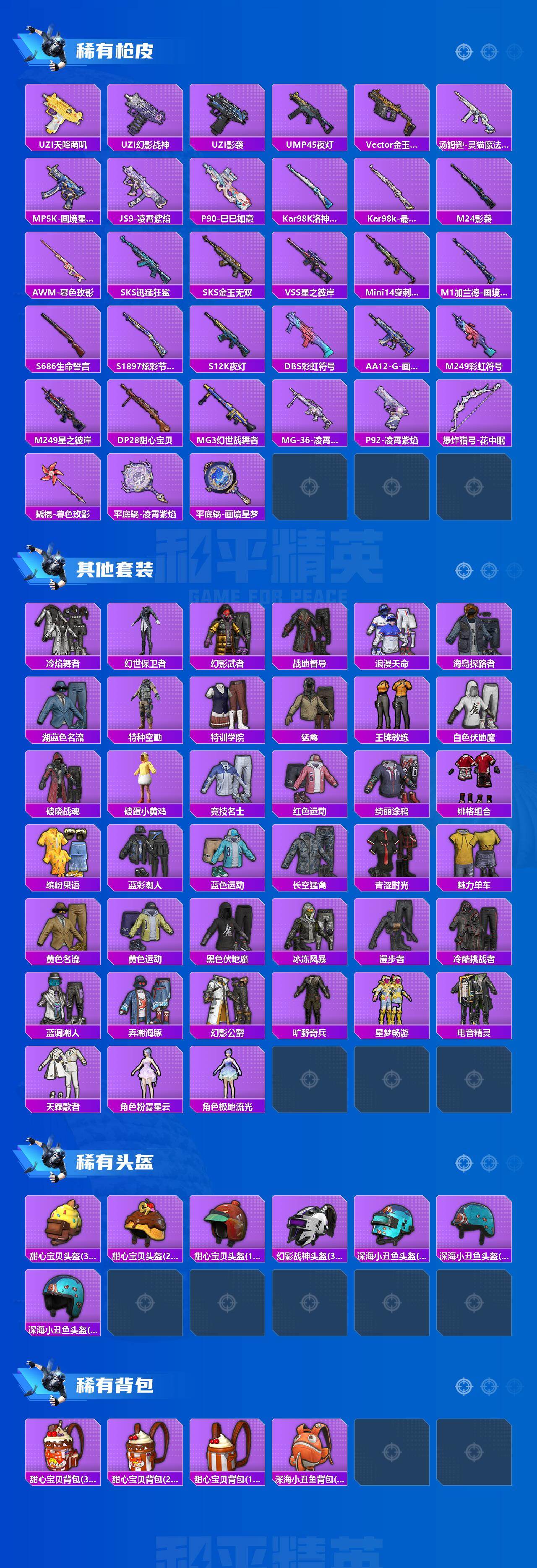 【稀有枪皮】:AUG-冰晶雪宝,AKM-星之彼岸,AKM-破晓战魂,AKM-缤纷海域,SCAR-L-夜灯,SCAR-L-炫彩节奏,M416-红色方程式,M416-蓝色火焰,GROZA-影袭,GROZA-暮色玫影,AUG-甜蜜菠萝,QBZ-洛神天依,M762-甜心宝贝,M762-登顶巅峰,Mk47-洛神天依,AC-VAL-天降萌叽,ACE32-画境星梦,ARX-凌霄紫焰,UZI-啾咪啾咪,UZI-天