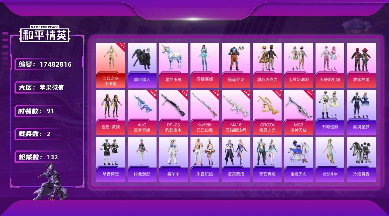 - PX_2057804- 苹果手Q-8王牌印记-有战神框-15粉装-12特效枪-1载具-83380热力值-146套装-215枪皮-2卓越印记-2传奇印记 【15粉装】,梦幻火箭,宝贝奶油派,千面幻镜,洛天依,彩虹甜喵,草莓生巧,暗夜玫瑰,复仇流浪者,月影灵韵,银红美神,馨动时刻,冰川幽秘,暗夜鎏金,星之彼岸,烟云彩露 【12特效枪】AKM-星际浪客-5级 M16A4-垂柳戏鸭-2级 SCAR-L-桃