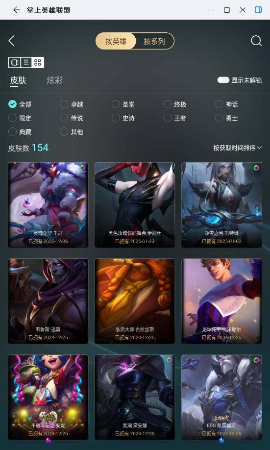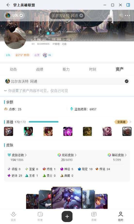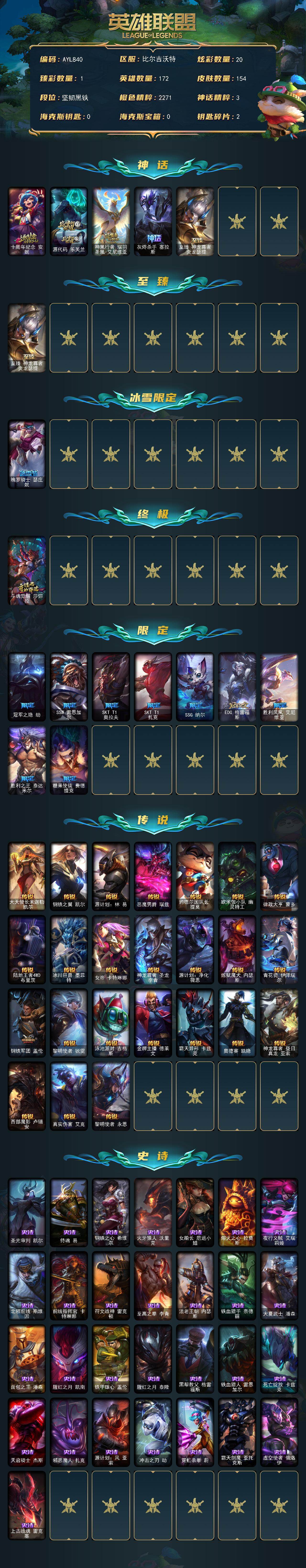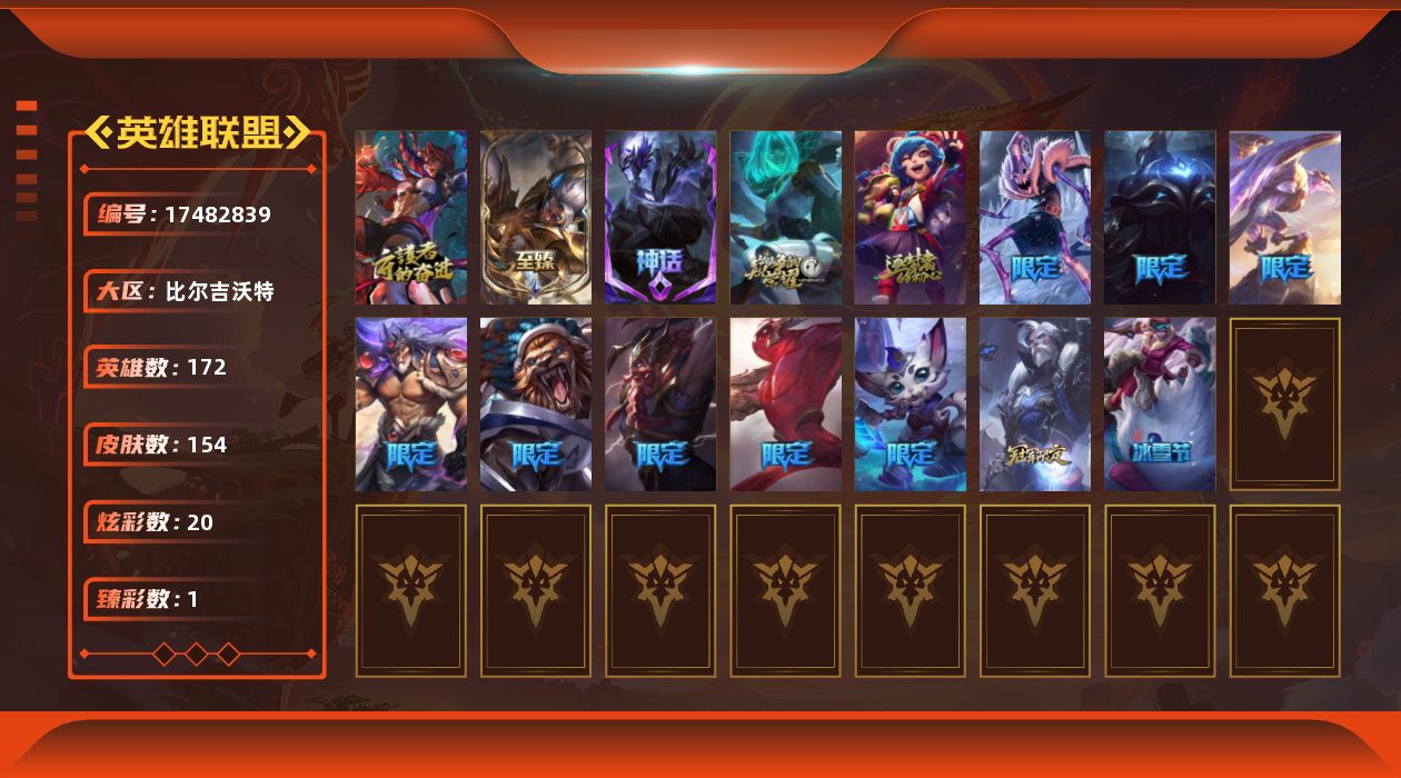 [17482839]未定级段位-172英雄-154皮肤-20炫彩-1终极-5神话-10限定-24传说-29史诗