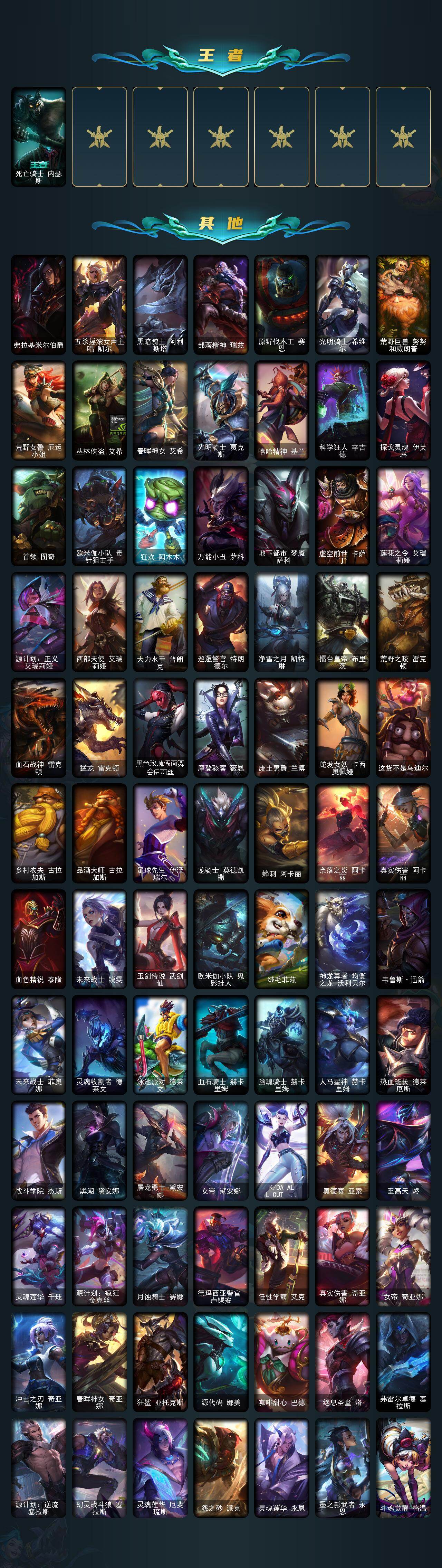 【限定皮肤】:冠军之隐劫,SSW雷恩加尔,SKTT1奥拉夫,SKTT1扎克,SSG纳尔,EDG格雷福斯,胜利凤凰艾尼维亚,胜利之王泰达米尔,糖果使徒费德提克
