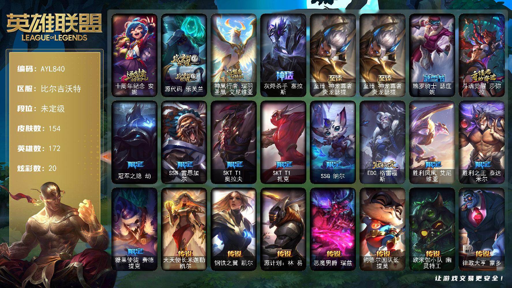 [17482839]未定级段位-172英雄-154皮肤-20炫彩-1终极-5神话-10限定-24传说-29史诗 【神话皮肤】:十周年纪念安妮,源代码乐芙兰,神凰行者瑞羽圣凰艾尼维亚,灰烬杀手塞拉斯,至臻神龙尊者炎龙瑟提 【至臻皮肤】:至臻神龙尊者炎龙瑟提 【臻彩皮肤】:魔女阿卡丽虚荣 【冰雪限定】:魄罗骑士瑟庄妮 【终极皮肤】:斗魂觉醒莎弥拉 【限定皮肤】:冠军之隐劫,SSW雷恩加尔,SKTT1奥拉夫,SKTT1扎克,SSG纳尔,EDG格雷福斯,胜利凤凰艾尼维亚,胜利之王泰达米尔,糖果使徒费德提克 【传说皮肤】:大天使长米迦勒凯尔,钢铁之翼凯尔,源计划林易,恶魔男爵瑞兹,约德尔国队长提莫,欧米伽小队幽灵特工,律政大亨蒙多,陆地王者4WD布里茨,冰川巨兽墨菲特,女帝卡特琳娜,神龙尊者圣龙李青,源计划净化薇恩,炼狱魔犬内瑟斯,青花瓷伊泽瑞尔,钢铁军团盖伦,黎明使者锐雯,泳池派对吉格斯,金牌主播德莱文,霸天异形卡兹克,奥德赛凯隐,神龙尊者昼日真龙亚索,西部魔影卢锡安,真实伤害艾克,黎明使者永恩 【史诗皮肤】:圣光审判凯尔,侍魂易,钢铁之心希维尔,火牙狼人沃里克,女船长厄运小姐,熔火之心拉莫斯,夜行义贼艾瑞莉娅,北领前线斯维因,前线指挥官卡特琳娜,符文战神雷克顿,至高之拳李青,法老王朝内瑟斯,铁血猎手奈德丽,大夏武士潘森,面包之王潘森,腥红之月凯南,铁甲雄心盖伦,腥红之月泰隆,黑帮教父格雷福斯,铁血猎人雷恩加尔,死亡绽放卡兹克,天启骑士杰斯,邪恶魔人扎克,源计划风亚索,冲击之刃劫,霓虹杀拳蔚,霸天剑魔亚托克斯,虚空使者俄洛伊,上古战魂雷克塞 【王者皮肤】:死亡骑士内瑟斯 【其他皮肤1】:弗拉基米尔伯爵,五杀摇滚女声主唱凯尔,黑暗骑士阿利斯塔,部落精神瑞兹,原野伐木工赛恩,光明骑士希维尔,荒野巨兽努努和威朗普,荒野女警厄运小姐,丛林侠盗艾希,春晖神女艾希,光明骑士贾克斯,嘻哈精神基兰,科学狂人辛吉德,探戈灵魂伊芙琳,首领图奇,欧米伽小队毒针狙击手,狂欢阿木木,万能小丑萨科,地下都市梦魇萨科,虚空前世卡萨丁,莲花之令艾瑞莉娅,源计划正义艾瑞莉娅,西部天使艾瑞莉娅,大力水手普朗克,巡逻警官特朗德尔,净雪之月凯特琳,擂台皇帝布里茨,荒野之咬雷克顿,血石战神雷克顿,猛龙雷克顿,黑色玫瑰假面舞会伊莉丝,摩登骇客薇恩,废土男爵兰博,蛇发女妖卡西奥佩娅,这货不是乌迪尔,乡村农夫古拉加斯,品酒大师古拉加斯,足