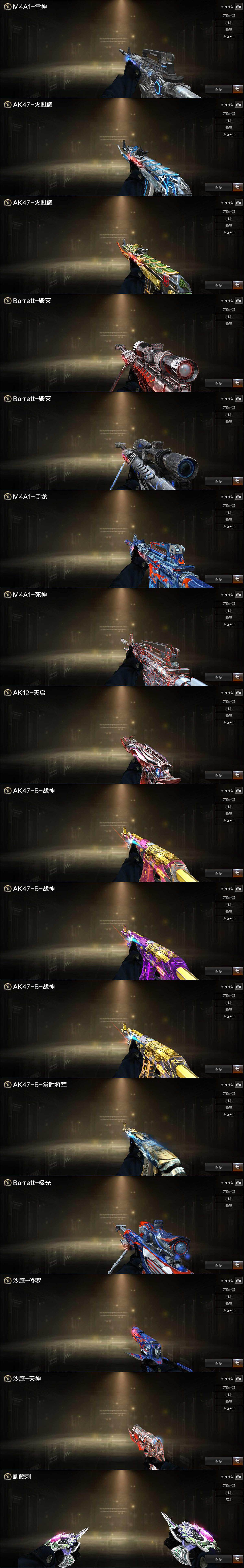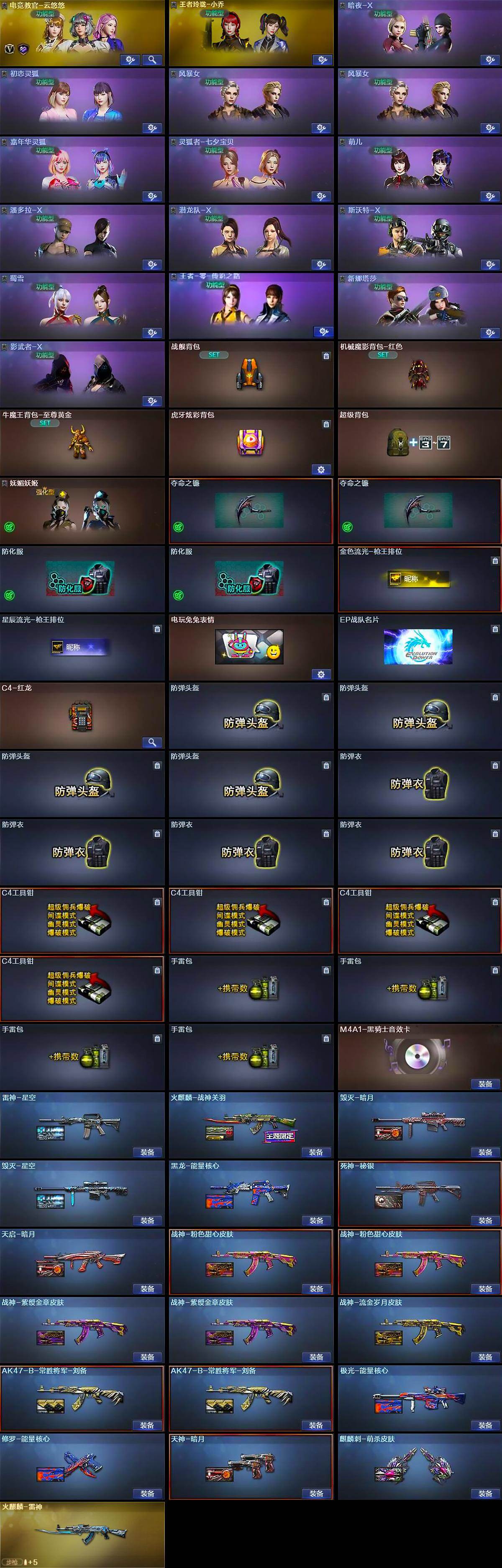 - [16844544]黑龙江区-18V-1王者-1炫金 【热门武器】:M200-幻神,死亡之眼,M4A1-黑骑士,汤姆逊-烈龙*5 【王者炫金武器】:王者之武,炫金毁灭 【皮肤】:M200-幻神-黄忠皮肤,M4A1-战神赵云,毁灭-战神张飞,黑龙-能量核心,黑骑士-战神马超 【角色】:战地猎狐,奇洋探员,暗夜-X,电竞少女,芳心审判者,风暴女,0号玩家,灵狐者-X,潘多拉-X,青霞仙子,蛇姬,维纳斯,雪莉杨 【人偶武器】:迷你牛牛 【暴走生化】:死亡之眼,超级对讲机 【英雄级武器】:AK47-火麒麟,AK47-麒麟,M4A1-雷神,M4A1-黑骑士,QBZ03-天罚,AWM-天龙,Barrett-毁灭,M200-幻神,汤姆逊-烈龙*5,AA-12-雷霆,屠龙,龙啸,手雷-热带奇洋 【道具】:CFS限定背包,超级背包,女皇终结者-魔龙之吻,救世主-黑桃战神,黄金生化钩,绿色巨人,灵魂忍者,迷雾幽灵,生化弹匣,夺命之镰,防化服*3,枪王排位28赛季金色流光,枪王排位29赛季金色流光,EP战队名片,EP战队喷图,EP战队击杀图标,C4-再燃火线,防弹头盔*6,防弹衣*6,C4工具钳*7,手雷包*6 【特殊枪械】:1黑骑士,5烈龙