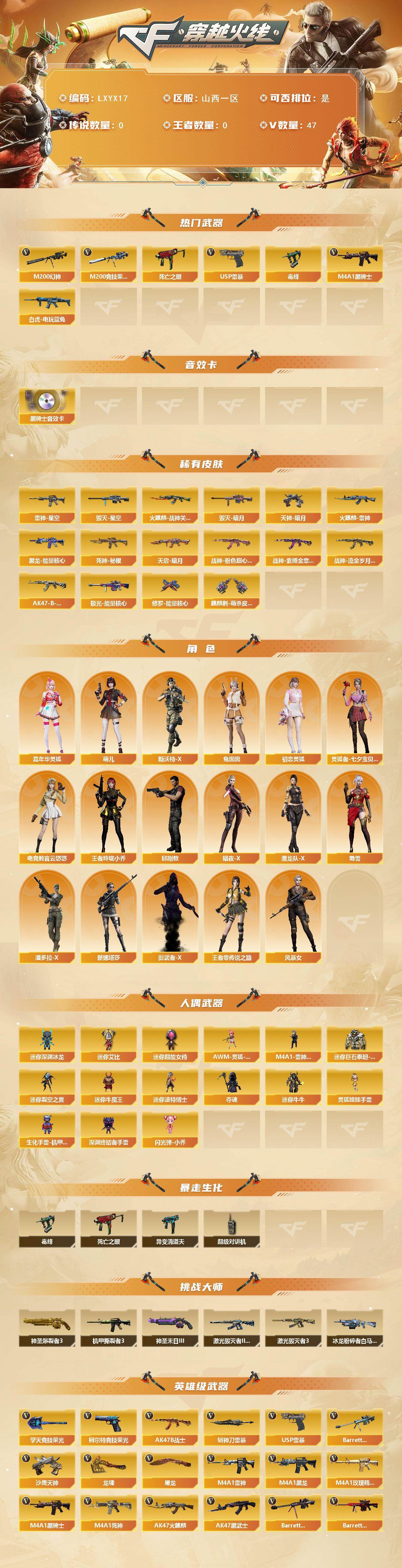 - [16477972]江西一区-64V-7王者-2炫金 【传说角色】:传说星骇 【热门武器】:QBZ03-金色蔷薇,M200-幻神,M4A1-黑骑士,RPK-盘龙,加特林-炼狱,羊驼玩偶,COP 357-幻灵*2,沙鹰-修罗,金刚伞 【王者炫金武器】:炫金千变,炫金超新星,王者之魄闪光弹 【音效卡】:M200-幻神音效卡,AK47-火麒麟音效卡,M4A1-雷神音效卡,M4A1-黑骑士音效卡,绝迹语音包,Barrett-碧霄极光音效卡,炼狱-百战金芒-庆典舞曲音效卡,沙鹰-修罗-盛典舞曲音效卡 【皮肤】:幻神-周瑜皮肤,雷神-烈虎皮肤,M4A1-再燃火线,雷神-神秘按键 皮肤,火麒麟-盘古,毁灭-黑大圣皮肤,毁灭-风暴*2,M4A1-千变-孔明皮肤,战神-粉色甜心皮肤,战神-紫绶金章皮肤,AK47-B-常胜将军-曹操,AK47-B-常胜将军-刘备*2,AK47-B-常胜将军-孙权,极光-能量核心,修罗-能量核心,屠龙-春桃 皮肤,轻型军用手斧-再燃火线 【角色】:影豹,王者-葵-貂蝉,王者涂鸦,蛇隐宗,修道士,电竞少女,虎妞,嘉年华灵狐,兰-海滩派对,兰妹妹,0号玩家,龙儿,潘多拉-X,蛇姬,蜀雪 【人偶武器】:迷你深渊冰龙,迷你波特博士,夺魂,迷你牛牛,生化手雷-机甲核心*2,深渊终结者手雷,闪光弹-小乔,闪光弹-貂蝉,高爆手雷-大乔,迷你艾比 【暴走生化】:超级对讲机 【挑战大师】:冰龙粉碎者-白马银枪,机甲撕裂者III 【英雄级武器】:AK47-火麒麟,M4A1-雷神,M4A1-黑骑士,QBZ03-金色蔷薇,烈火-动感闪耀,AK-47-猩红传说,王者冰魄-觉醒版,王者火魄-觉醒版,黑骑士-海王,AK47-B-常胜将军,Barrett-毁灭,AWM-裁决,M200-幻神,RPK-盘龙,加特林-炼狱,炼狱-百战金芒,沙鹰-修罗,沙鹰-天神*3,COP 357-幻灵*2,Anaconda-玄豹,王者之魂-觉醒版,王者之灵-觉醒版,屠龙*4,龙啸,麒麟刺,幻灵之锋,麒麟刺-百战金芒,王者之锋-觉醒版,丛林匕首-玄豹,高爆手雷-幻灵*7,高爆手雷-古蛇迷踪,闪光弹-幻灵*8,烟雾弹-幻灵*7,烟雾弹-竞技荣光,烟雾弹-古蛇迷踪,烟雾弹-玄豹*2,M4A1-赤狱骑士,M4A1-苍鸣雷神 【道具】:BS战队炫彩背包,CFS限定背包,云山科技背包,百战金芒炫彩背包,超级背包*2,女皇终结者-魔龙之