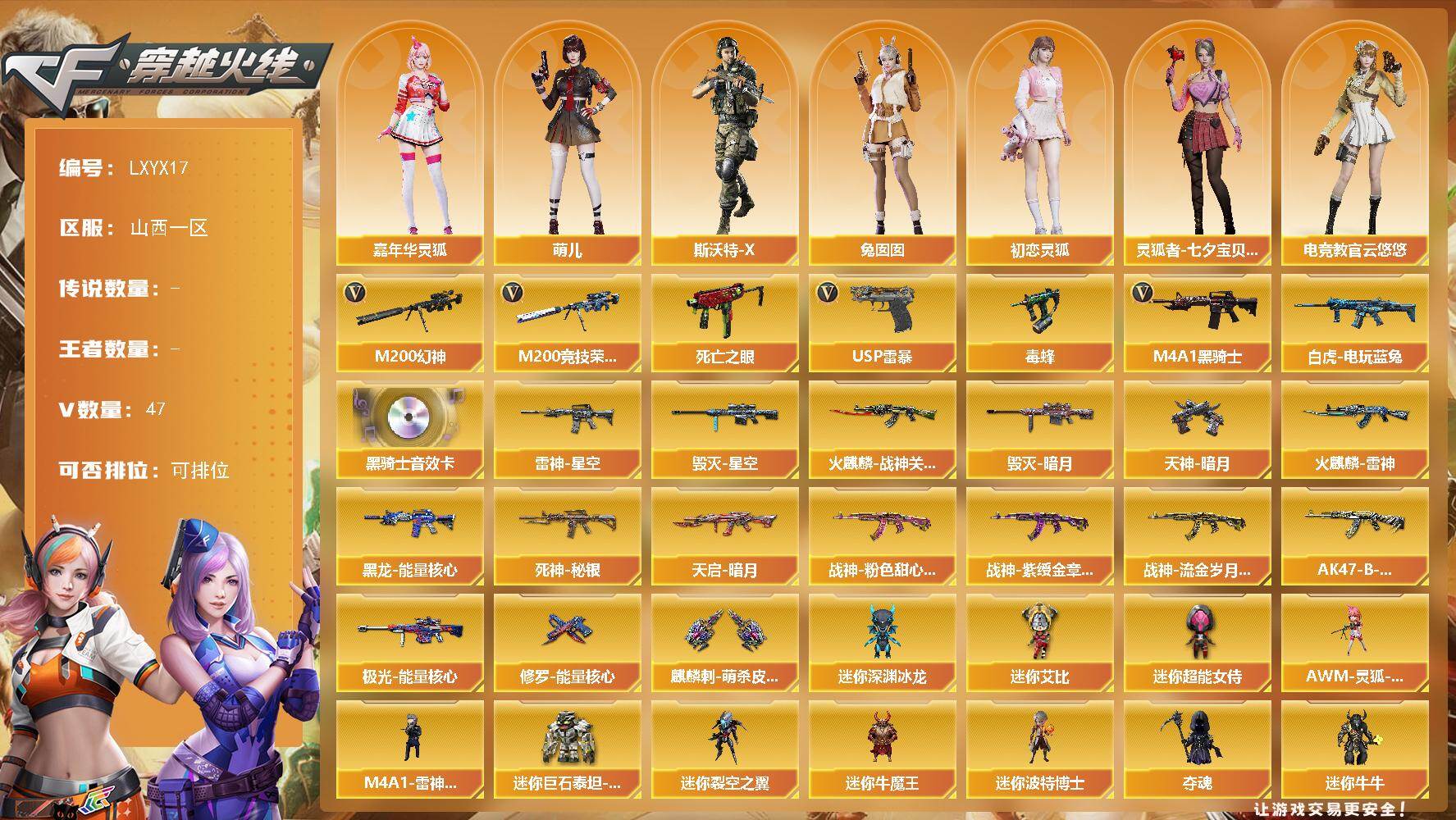 [17483478]【LXYX17】黄瓜会8黄7-46V/100级/元帅/1英雄/M200-幻神/M200-竞技荣光/死亡之眼/白虎-电玩蓝兔/毒蜂/M4A1-黑骑士/USP雷暴/M4A1-黑骑士音效卡/雷神-星空/火麒麟-雷神/火麒麟-战神关羽/毁灭-暗月/毁灭-星空/黑龙-能量核心/死神-秘银/天启-暗月/战神-粉色甜心皮肤/战神-紫绶金章皮肤/战神-流金岁月皮肤/AK47-B-常胜将军-刘备/极光-能量核心/修罗-能量核心/天神-暗月/麒麟刺-萌杀皮肤/电竞教官-云悠悠/王者玲珑-小乔/暗夜-X/初恋灵狐/风暴女/嘉年华灵狐/灵狐者-七夕宝贝/萌儿/潘多拉-X/潜龙队-X/邱刚敖/斯沃特-X/蜀雪/兔囡囡/王者-零-传说之路/新娜塔莎/影武者-X/M4A1-雷神-精英刀锋/AWM-灵狐-15周年嘉年华/迷你深渊冰龙/迷你裂空之翼/迷你牛魔王/迷你波特博士/夺魂/迷你牛牛/生化手雷-机甲核心/深渊终结者手雷/闪光弹-小乔/迷你艾比/迷你超能女侍/迷你巨石泰坦-魔花研究所/灵狐娃娃手雷/异变清道夫/超级对讲机/神圣爆裂者/冰龙粉碎者-白马银枪/激光毁灭者III-白马银枪/激光毁灭者/机甲撕裂者/神圣爆裂者-末日/AK47-火麒麟/M4A1-黑龙/M4A1-雷神/M4A1-死神/AK47-黑武士/无影-神兵利器/M4A1-玫瑰精灵/AK-47-猩红传说/AK47-B-战神/黑骑士-海王/AK47-B-战士/Barrett-毁灭/Barrett-极光/AWM-裁决/沙鹰-天神/柯尔特-竞技荣光/屠龙/龙啸/擎天-竞技荣光/斩神刀-雷暴/高爆手雷-雷暴/高爆手雷-幻灵/高爆手雷-竞技荣光/闪光弹-雷暴/闪光弹-幻灵/闪光弹-竞技荣光/烟雾弹-雷暴/烟雾弹-竞技荣光/源-千变/源·火麒麟/魂·火麒麟-百城/御·火麒麟-平天大圣/源-黑龙/御·黑龙-龙太子/源·雷神/魂·雷神-维纳斯/魂-雷神-萌杀/魂·雷神-15周年嘉年华/御·雷神-机甲刑天/御·雷神-烈虎/M4A1-十二生肖·龙-雷神/雷神-赛博幻想/雷神-赛博朋克/御·雷神-小白龙/源·黑骑士/魂·黑骑士-现代金属/魂·黑骑士-幻能朋克/源·无影/魂-死神-机甲核心/源·AK47-黑武士/源·天启/源·超新星/御·超新星-圣诞/源·武圣/源·机械迷城/魂·龙血-锋芒破茧/魂·QBZ03-金色蔷薇-萌杀/源·猎神/源-极光/源·毁灭/魂·毁灭-青帝/