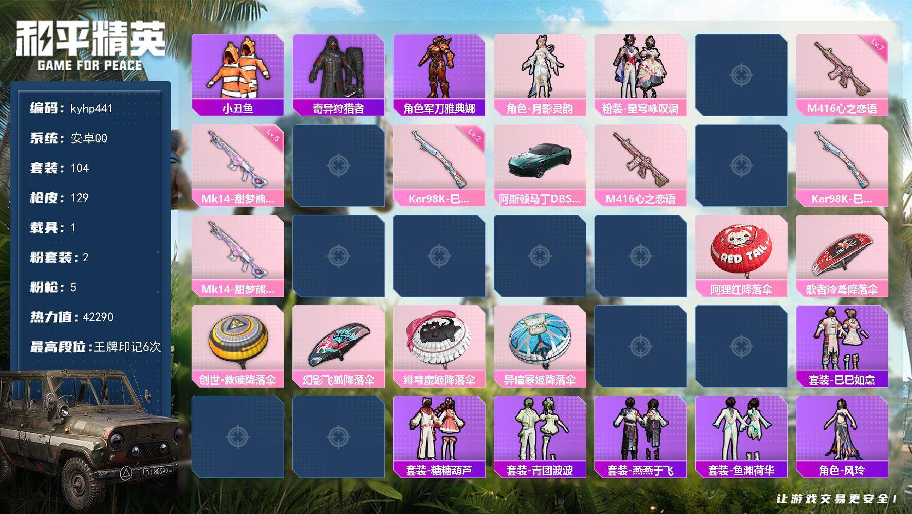 [17483837]安卓 手Q-2粉装-5特效枪-1载具-2粉色飞行器-42290热力值-6王牌印记-104套装-129枪皮 【热门品类】:套装-小丑鱼,套装-奇异狩猎者,角色-军刀雅典娜 【粉色套装】:角色-月影灵韵,粉装-星穹咏叹调 【粉色枪皮等级】:M416-心之恋语(七级),AKS-74U-森灵之息(五级),Kar98K-巳巳如意(二级),Mk14-甜梦熊击(五级),M249-绝对恒星(六级) 【粉色载具】:阿斯顿马丁DBS(绿) 【粉色枪皮】:M416-心之恋语,AKS-74U-森灵之息,Kar98K-巳巳如意,Mk14-甜梦熊击,M249-绝对恒星 【粉色飞行器】:绝对恒星飞行器,炫彩糖果飞行器 【粉色降落伞】:绝对恒星降落伞,阿狸红降落伞,歌者泠鸢降落伞,创世·救赎降落伞,幻影飞狐降落伞,绯穹魔姬降落伞,异瞳寒姬降落伞,极意拳锋降落伞,炫彩糖果降落伞 【稀有套装】:套装-巳巳如意,角色-超感刻度,角色-甜心蒙太奇,套装-雪国风尚,套装-炫彩糖果,套装-糖糖葫芦,套装-青团波波,套装-燕燕于飞,套装-鱼渊荷华,角色-风玲,套装-粉恋花,套装-紫幽梦,套装-蓝冰羽,套装-星影赞美诗,角色-紫俏灵猫 【稀有枪皮】:AUG-冰晶雪宝,AKM-阿狸红,AKM-龙的传人,M16A4-幻世战舞者,SCAR-L-夜灯,SCAR-L-怪兽之王,SCAR-L-炫彩节奏,SCAR-L-玉兔迎春,M416-糯团青竹,AUG-天降萌叽,AUG-耀粉歌者,AUG-绝对恒星,QBZ-彩虹符号,M762-镭射皇者,AC-VAL-天降萌叽,蜜獾-天降萌叽,UZI-啾咪啾咪,UZI-天降萌叽,UMP45-夜灯,UMP45-蓝色火焰,UMP45-极意拳锋,Vector-彩虹符号,Vector-治愈之星,Vector-生命誓言,汤姆逊-炫彩节奏,P90-巳巳如意,Kar98K-王子的夏天,Kar98K-红色方程式,M24-治愈之星,Mini14-阿狸红,SLR-四圣焕新,S686-生命誓言,S686-巳巳如意,S1897-炫彩节奏,S12K-垂柳戏鸭,S12K-夜灯,S12K-幻世战舞者,M249-四圣焕新,M249-彩虹符号,DP-28-原初圣火,MG3-幻世战舞者,突击盾牌-绝对恒星,破片手榴弹-巳巳如意 【其他套装】:套装-SS20特训,套装-SS21特训,套装-SS22特训,套装-SS26特训,套装-
