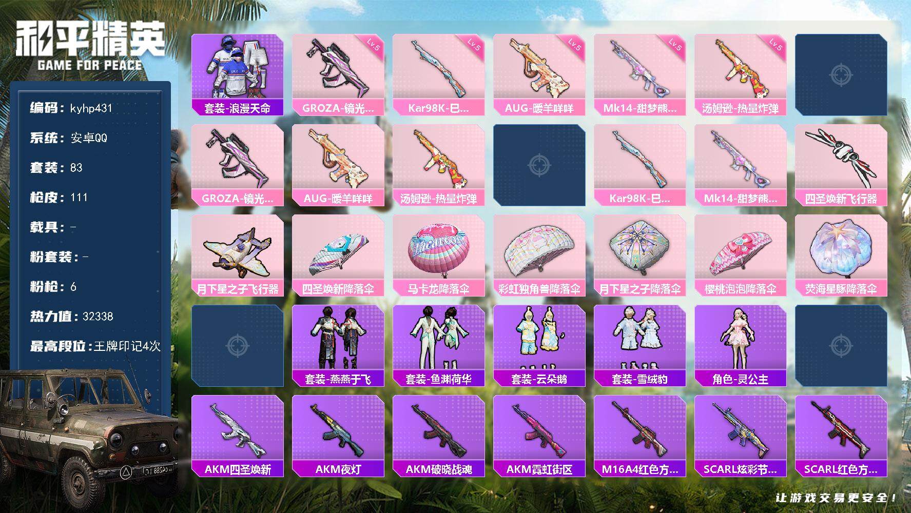 [17484359]安卓 手Q-0粉装-6特效枪-0载具-2粉色飞行器-32338热力值-4王牌印记-83套装-111枪皮 【热门品类】:套装-浪漫天命 【粉色枪皮等级】:GROZA-镜光银凌(五级),AUG-暖羊咩咩(五级),汤姆逊-热量炸弹(五级),AKS-74U-森灵之息(五级),Kar98K-巳巳如意(五级),Mk14-甜梦熊击(五级) 【粉色枪皮】:GROZA-镜光银凌,AUG-暖羊咩咩,汤姆逊-热量炸弹,AKS-74U-森灵之息,Kar98K-巳巳如意,Mk14-甜梦熊击 【粉色飞行器】:四圣焕新飞行器,月下星之子飞行器 【粉色降落伞】:四圣焕新降落伞,马卡龙降落伞,彩虹独角兽降落伞,月下星之子降落伞,樱桃泡泡降落伞,荧海星豚降落伞,炫彩糖果降落伞 【稀有套装】:套装-燕燕于飞,套装-鱼渊荷华,套装-云朵鹅,套装-雪绒豹,角色-灵公主,角色-霜刃之御 【稀有枪皮】:AKM-四圣焕新,AKM-夜灯,AKM-破晓战魂,AKM-霓虹街区,M16A4-红色方程式,SCAR-L-炫彩节奏,SCAR-L-红色方程式,M416-夜灯,M416-红色方程式,M416-蓝色火焰,GROZA-生命誓言,GROZA-马卡龙,GROZA-黑色刀锋,AUG-耀粉歌者,QBZ-原初圣火,QBZ-彩虹符号,M762-牛气冲天,M762-诡娃娃,M762-云朵鹅,AC-VAL-天降萌叽,UZI-众神之王,UZI-啾咪啾咪,UZI-天降萌叽,UZI-红色方程式,UMP45-生命誓言,UMP45-绒宝小鹅,Vector-彩虹符号,Vector-生命誓言,Vector-黑色刀锋,汤姆逊-勇闯险境,汤姆逊-天降萌叽,汤姆逊-耀粉歌者,MP5K-繁花小夜曲,Kar98K-勇闯险境,Kar98K-彩虹符号,SKS-勇闯险境,SKS-夜灯,SKS-炫彩节奏,VSS-黑色刀锋,Mini14-原初圣火,Mini14-炫彩节奏,Mini14-生命誓言,Mini14-金鼠迎春,SLR-四圣焕新,MK20-H-樱桃泡泡,SVD-云朵鹅,SVD-冷漠罗丽,S686-生命誓言,S1897-勇闯险境,S1897-荧海星豚,S12K-破晓战魂,S12K-夜灯,SPAS-12-云朵鹅,M249-四圣焕新,DP-28-原初圣火,DP-28-彩虹符号,MG3-幻世战舞者,P18C-原初圣火,沙漠之鹰-云朵鹅,大砍刀-云朵鹅 【其他套装】:套