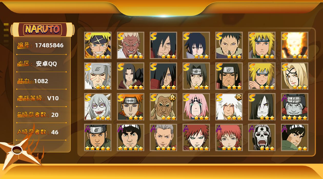 【S级忍者】:波风水门「秽土转生」(3星),千手扉间「秽土转生」(3星),千手柱间「秽土转生」(3星),宇智波鼬「秽土转生」(3星),宇智波斑「秽土转生」(3星),宇智波斑「秽土转生·解」(3星),春野樱「忍界大战」(3星),宇智波带土「忍界大战」(3星),艾「忍界大战」(3星),宇智波鼬「须佐能乎」(3星),艾「三代目雷影」(3星),自来也「舞之豪杰」(3星),大蛇丸(3星),纲手「百豪」(3星),波风水门(3星),药师兜「仙人模式」(3星),漩涡鸣人「九喇嘛连结」(3星),佩恩「天道」(3星),宇智波佐助「永恒万花筒」(3星),漩涡鸣人·宇智波佐助(3星)