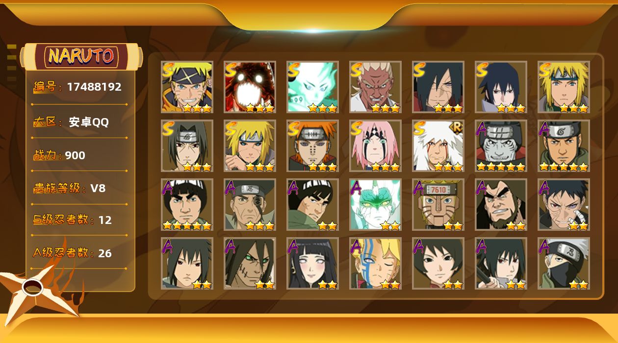 [17488192]12S级忍者数-26A级忍者数 【S级忍者】:波风水门「秽土转生」(3星),宇智波斑「秽土转生·解」(3星),春野樱「忍界大战」(3星),艾「忍界大战」(3星),宇智波鼬「须佐能乎」(3星),自来也「舞之豪杰」(3星),波风水门(3星),佩恩「天道」(3星),宇智波佐助「永恒万花筒」(3星),大筒木舍人「最终章」(3星),漩涡鸣人「暴怒·第六尾」(3星),漩涡鸣人·宇智波佐助(3星) 【A级忍者】:迪达拉(2星),飞段(2星),飞段「死司凭血」(2星),干柿鬼鲛(5星),漩涡博人「桃式显现」(2星),机械鸣人「初始形态」(2星),迈特凯(5星),旗木卡卡西「忍界大战」(2星),我爱罗「疾风传」(2星),蝎(2星),小南「神驹佑将」(2星),角都「秽土转生」(2星),猿飞阿斯玛(5星),猿飞阿斯玛「秽土转生」(2星),宇智波鼬(2星),宇智波佐助「须佐能乎」(2星),日向雏田「最终章」(2星),宇智波带土「漂泊浪客」(2星),黑土「博人传」(2星),秋道丁次「忍界大战」(2星),千代「近松十人卫」(2星),神农「羁绊」(2星),土台「忍界大战」(3星),宇智波泉奈(2星),巳月「仙人模式」(2星),迈特凯「青春爆炸」(2星)