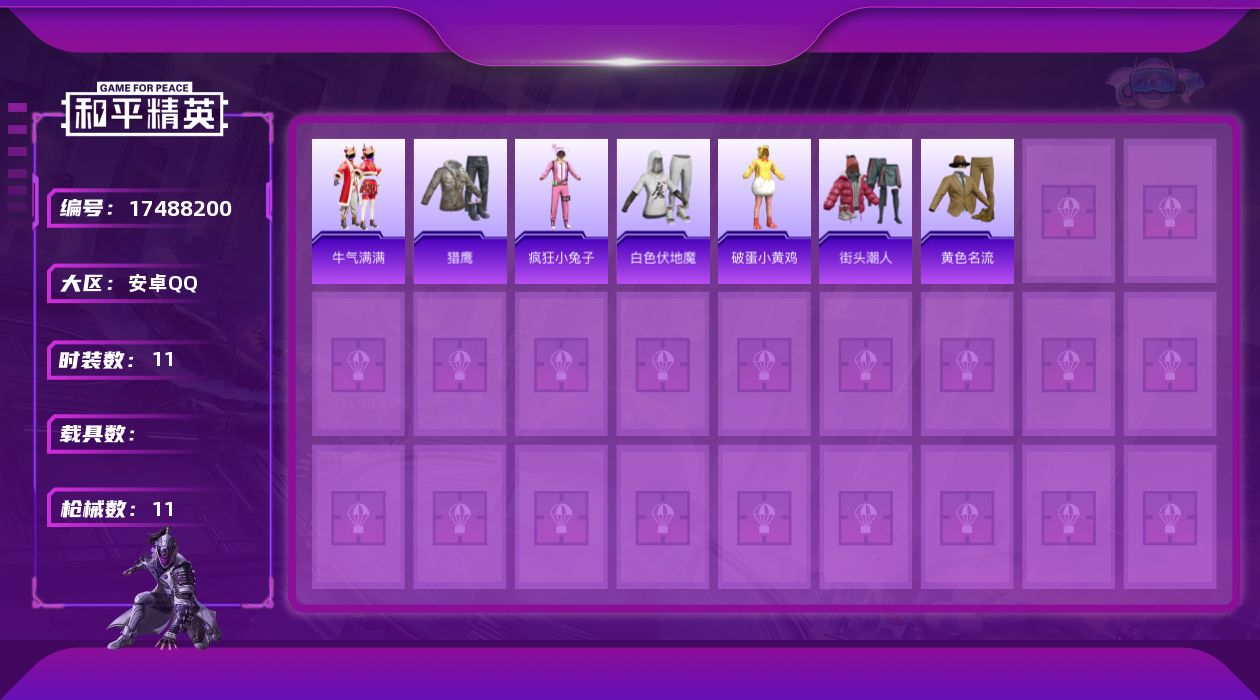 [17488200]安卓 手Q-0粉装-2特效枪-0载具-0粉色飞行器-3209热力值-1王牌印记-11套装-11枪皮