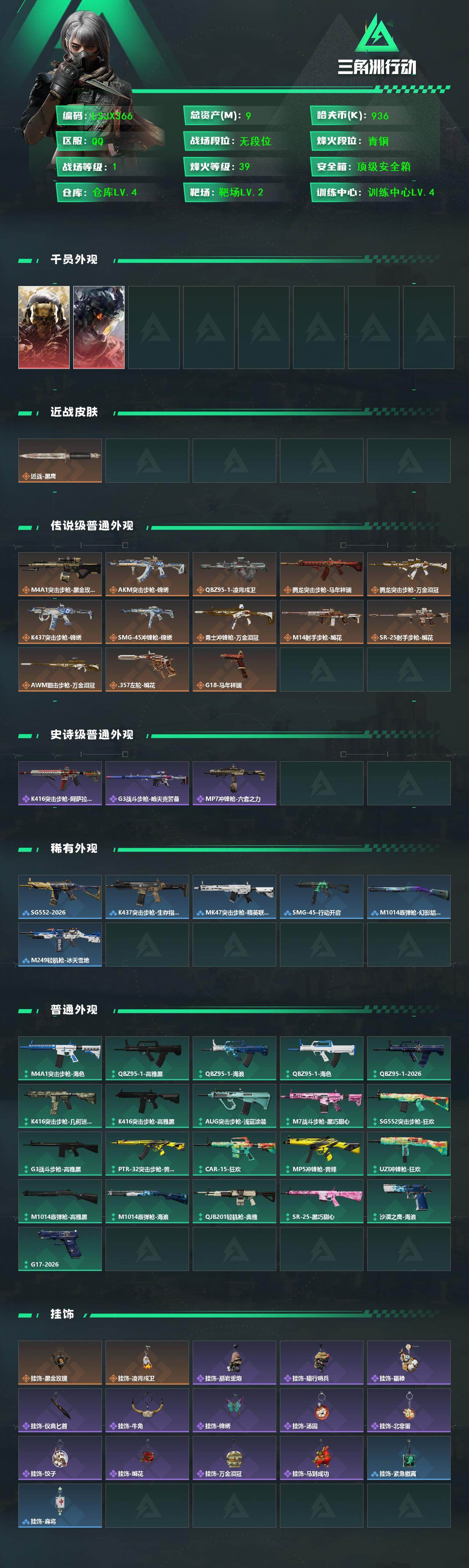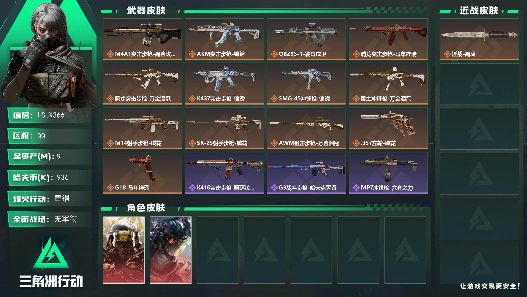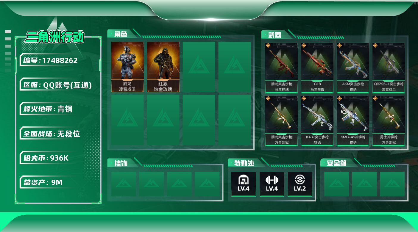 [17488262]【特价出售/店主推荐】9m总资产-936k哈伏币-39烽火等级-青铜-1战场等级-无军衔 【干员外观】:红狼-蚀金玫瑰,威龙-凌霄戍卫 【近战皮肤】:近战-黑鹰 【传说外观】:M4A1突击步枪-蚀金玫瑰,AKM突击步枪-锦绣,QBZ95-1突击步枪-凌霄戍卫,腾龙突击步枪-马年祥瑞,腾龙突击步枪-万金泪冠,K437突击步枪-锦绣,SMG-45冲锋枪-锦绣,勇士冲锋枪-万金泪冠,M14射手步枪-缄花,SR-25射手步枪-缄花,AWM狙击步枪-万金泪冠,.357左轮-缄花,G18-马年祥瑞 【史诗外观】:K416突击步枪-阿萨拉特攻,G3战斗步枪-哈夫克警备,MP7冲锋枪-六套之力 【稀有外观】:SG552突击步枪-2026,K437突击步枪-生存指令,MK47突击步枪-精英联盟,SMG-45冲锋枪-行动开启,M1014霰弹枪-幻影结构,M249轻机枪-冰天雪地 【普通外观】:M4A1突击步枪-海色,QBZ95-1突击步枪-高雅黑,QBZ95-1突击步枪-海浪,QBZ95-1突击步枪-海色,QBZ95-1突击步枪-2026,K416突击步枪-几何迷彩,K416突击步枪-高雅黑,AUG突击步枪-浅蓝涂装,M7战斗步枪-黑巧甜心,SG552突击步枪-狂欢,G3战斗步枪-高雅黑,PTR-32突击步枪-黄蜂,CAR-15突击步枪-狂欢,MP5冲锋枪-黄蜂,UZI冲锋枪-狂欢,M1014霰弹枪-高雅黑,M1014霰弹枪-海浪,QJB201轻机枪-典雅,SR-25射手步枪-黑巧甜心,沙漠之鹰-海浪,G17-2026 【挂饰】:挂饰-蚀金玫瑰,挂饰-凌霄戍卫,挂饰-崩岩重炮*3,挂饰-暗行哨兵*6,挂饰-福禄,挂饰-仪典匕首,挂饰-牛角,挂饰-锦绣,挂饰-汤圆,挂饰-北非蛋,挂饰-饺子,挂饰-缄花,挂饰-万金泪冠,挂饰-马到成功,挂饰-紧急撤离*21,挂饰-麻将*2