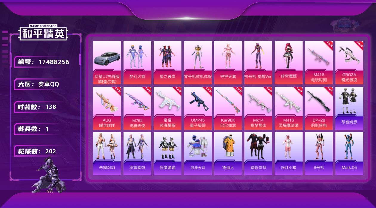 [17488256]【特价出售/店主推荐】安卓 手Q-6粉装-11特效枪-1载具-3粉色飞行器-56175热力值-7王牌印记-138套装-202枪皮