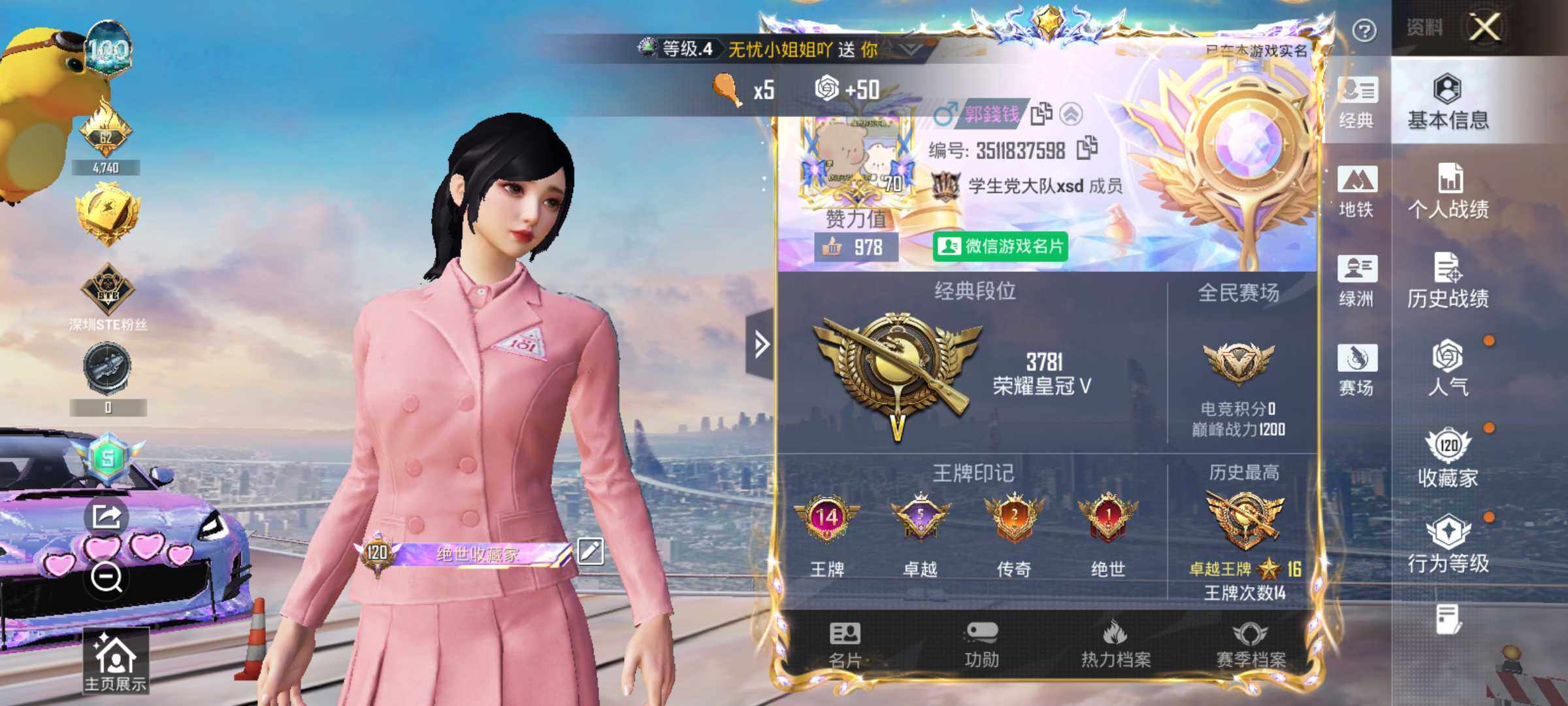 [17488274]绝世印记1 /老101 /AUG-星梦奇缘(九级)/Mk14-盛世惊鸿(九级)/M416-女娲灵识(九级)/布加迪威龙(星云粉)(六级) 安卓 微信-5神装-88粉装-34特效枪-31载具-38粉色飞行器-300267热力值-14王牌印记-380套装-506枪皮