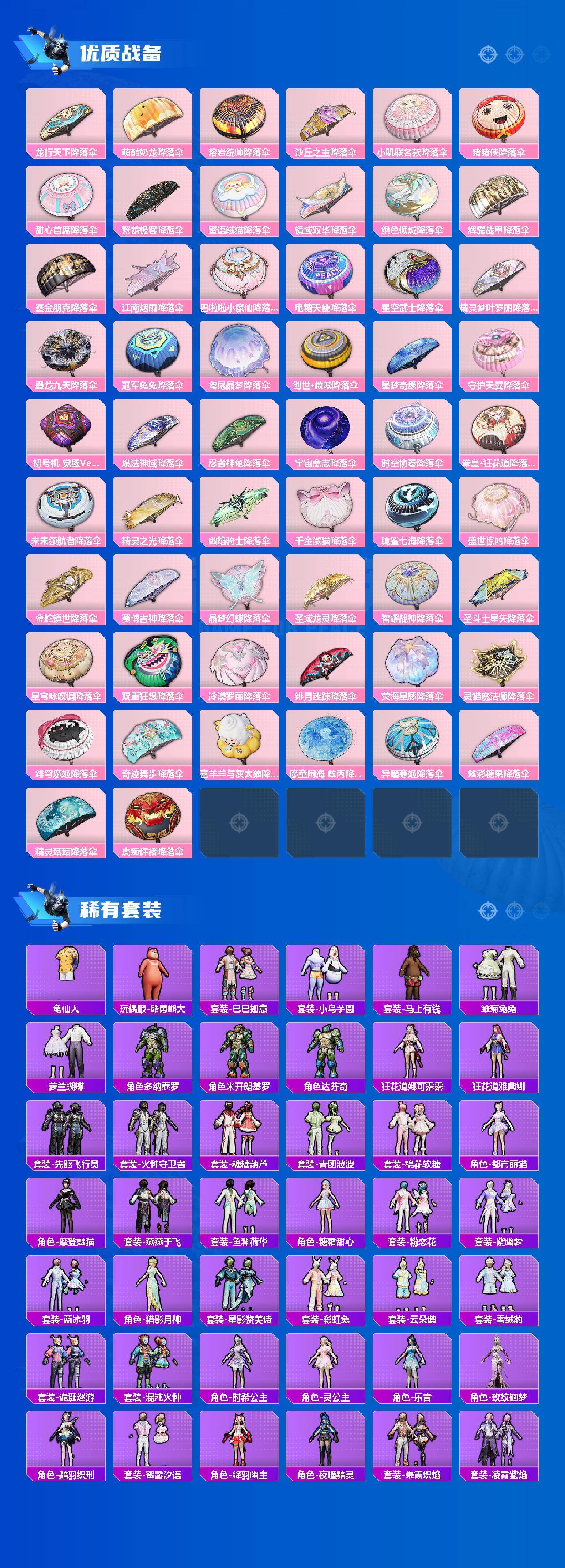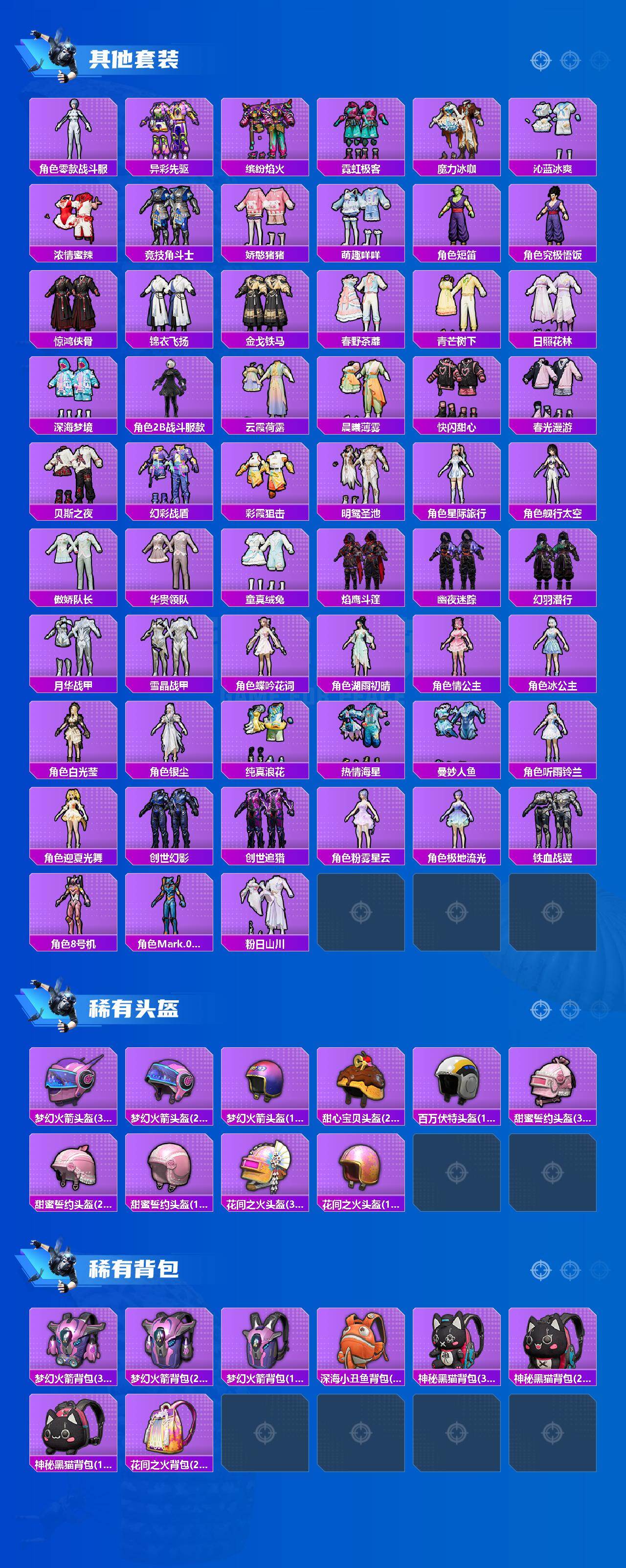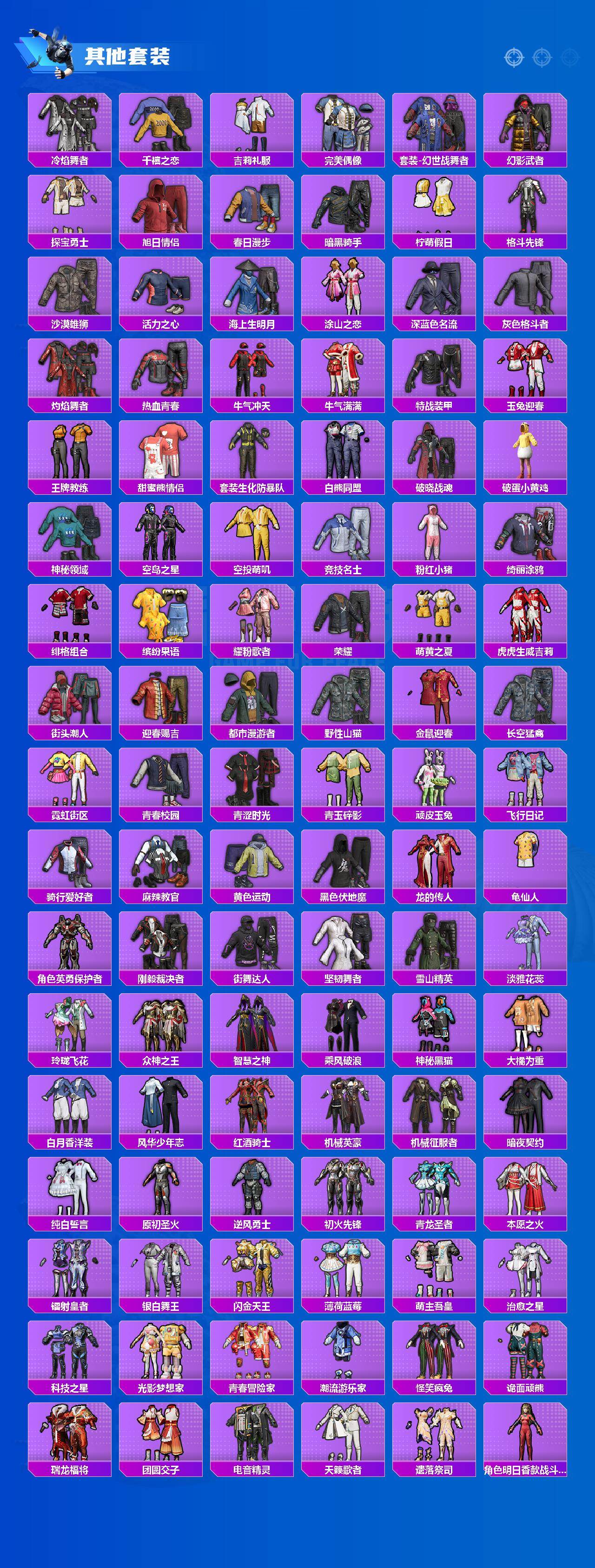 【粉色套装】:粉装-天使彩虹糖,粉装-蝶舞迷情,粉装-梦幻火箭,粉装-缤纷油彩,粉装-放客神游,粉装-彗云及圣,粉装-新星烈龙,粉装-炙焰赤龙,粉装-飓风飞鹰,角色-洛天依,角色-初号机款机体服,粉装-暗夜鎏金,角色-白勺歌姬,角色-呆萌星弥,角色-小可学妹,角色-水仙星,粉装-巨渊蟹踪,粉装-天幕蝎影,粉装-双星鱼跃,粉装-勇猛狮王,粉装-射星猎手,粉装-无畏白羊,粉装-银瓶流水,粉装-双面双生,粉装-天衡星秤,粉装-神隐金牛,粉装-室女星神,粉装-牧神之羯,角色-万古烈焰,粉装-莲影清波,粉装-彩装战姬,粉装-暖暖奶龙,粉装-憨憨奶龙,粉装-傲傲奶龙,角色-熔岩统帅,角色-冰炎战车,角色-紫钛骑兵,角色-小叽联名款,粉装-甜心首席,粉装-繁龙极客,粉装-蜜语绒猫,角色-绝色倾城,粉装-辉耀战甲,粉装-鎏金朋克,角色-烟云彩露,角色-严莉莉,角色-小蓝,角色-美雪,角色-美琪,角色