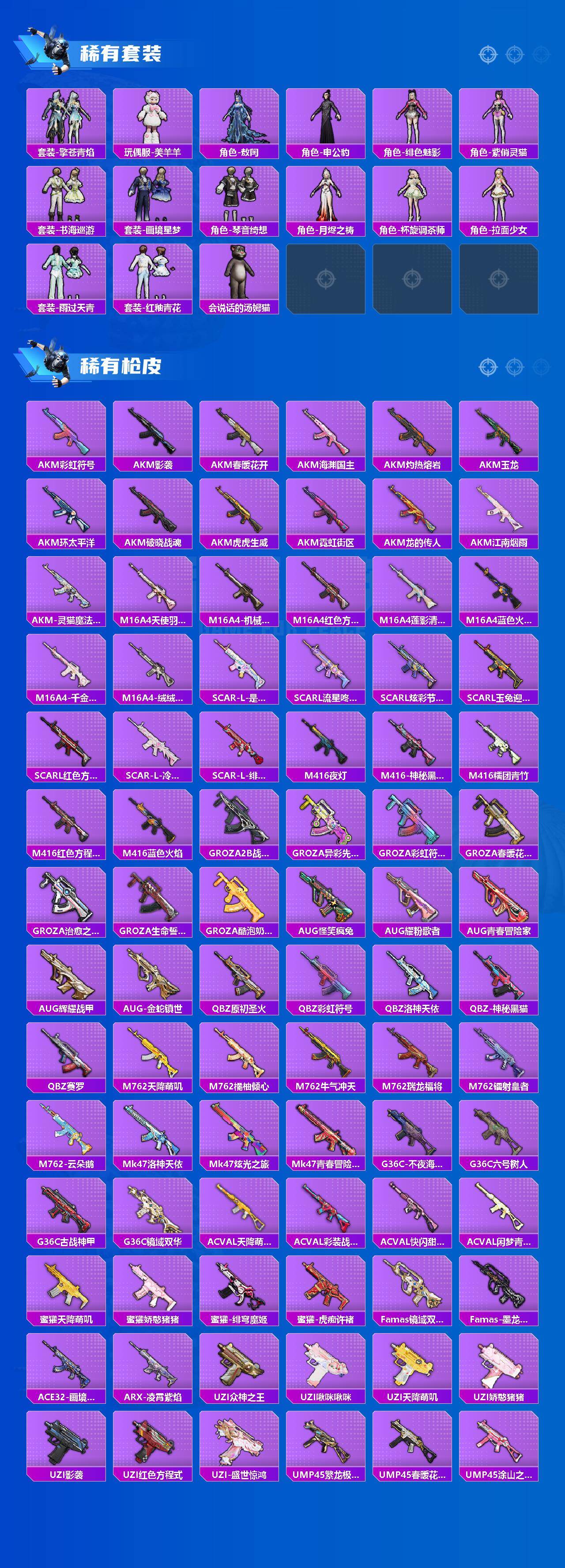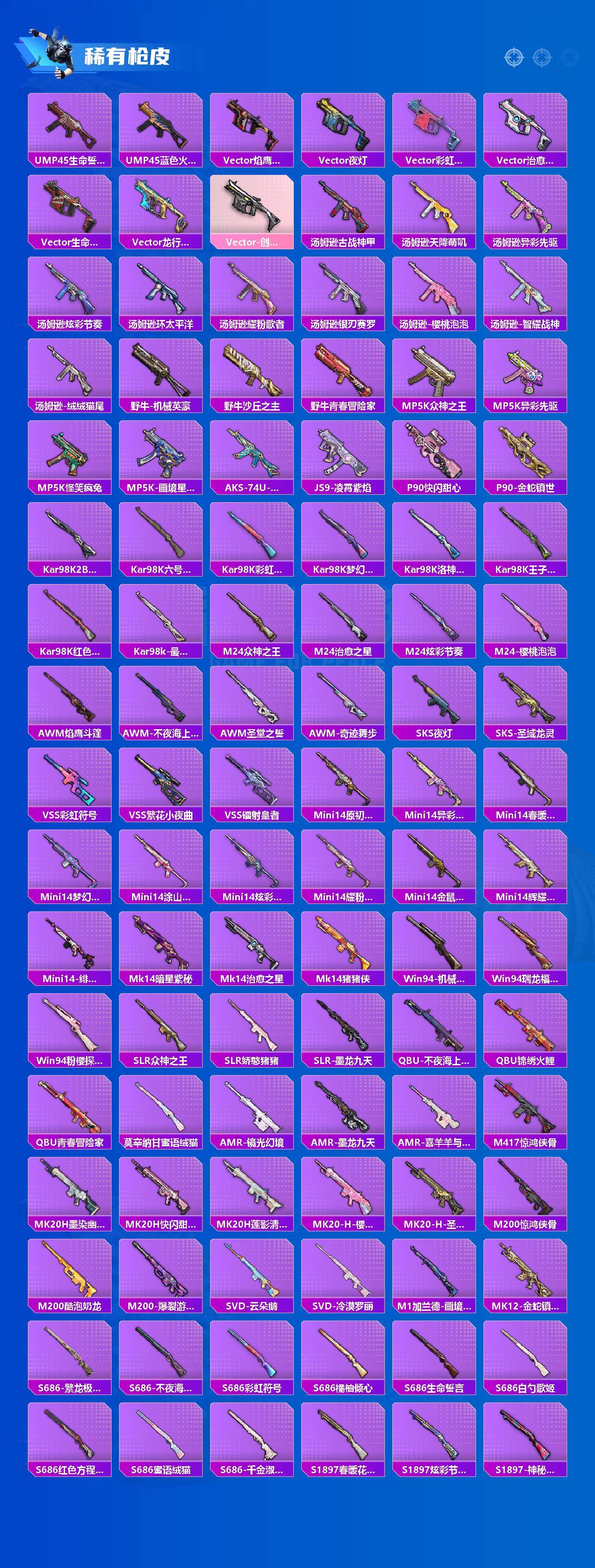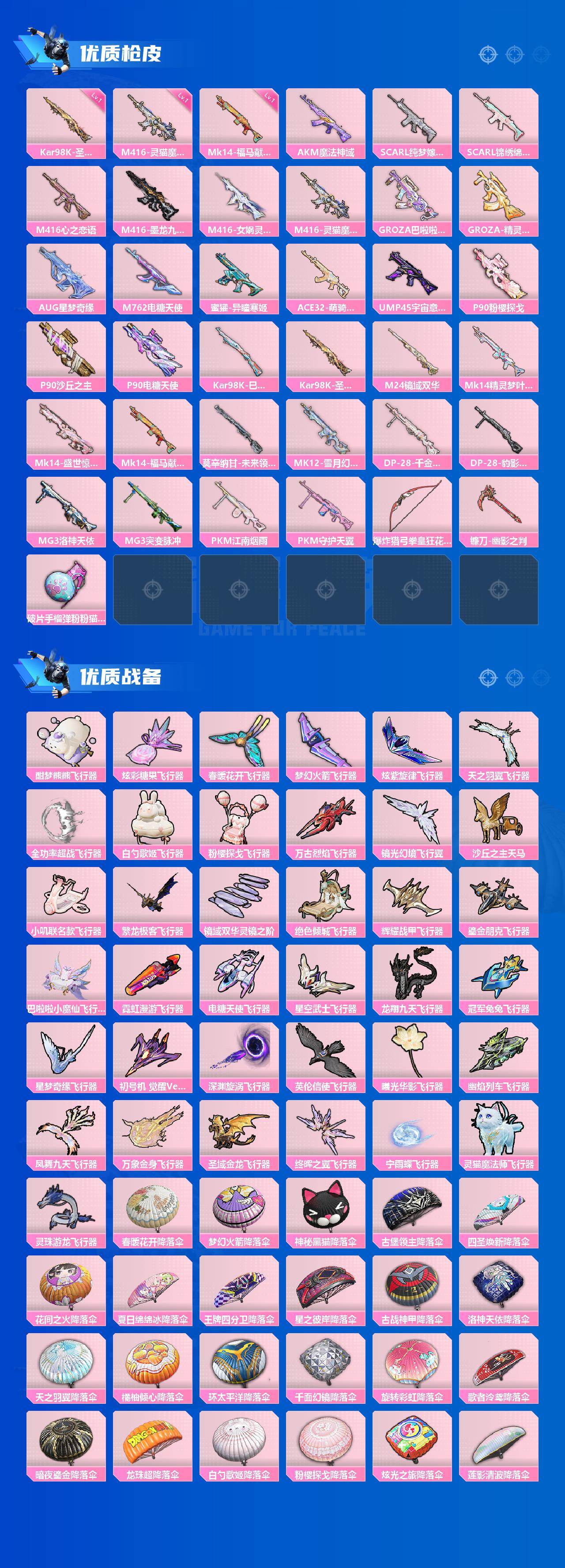AKM-魔法神域,SCAR-L-纯梦嫁纱,SCAR-L-锦绣绵绵,M416-心之恋语,M416-墨龙九天,M416-女娲灵识,GROZA-巴啦啦小魔仙,GROZA-精灵之光,AUG-星梦奇缘,M762-电糖天使,UMP45-宇宙意志,P90-粉樱探戈,P90-沙丘之主,P90-电糖天使,Kar98K-巳巳如意,Kar98K-圣域龙灵,M24-镜域双华,Mk14-精灵梦叶罗丽,Mk14-盛世惊鸿,莫辛纳甘-未来领航者,MK12-雪月幻音,DP-28-千金淑猫,MG3-洛神天依,MG3-突变脉冲,PKM-江南烟雨,PKM-守护天翼,爆炸猎弓-拳皇·狂花道,破片手榴弹-粉粉猫爪