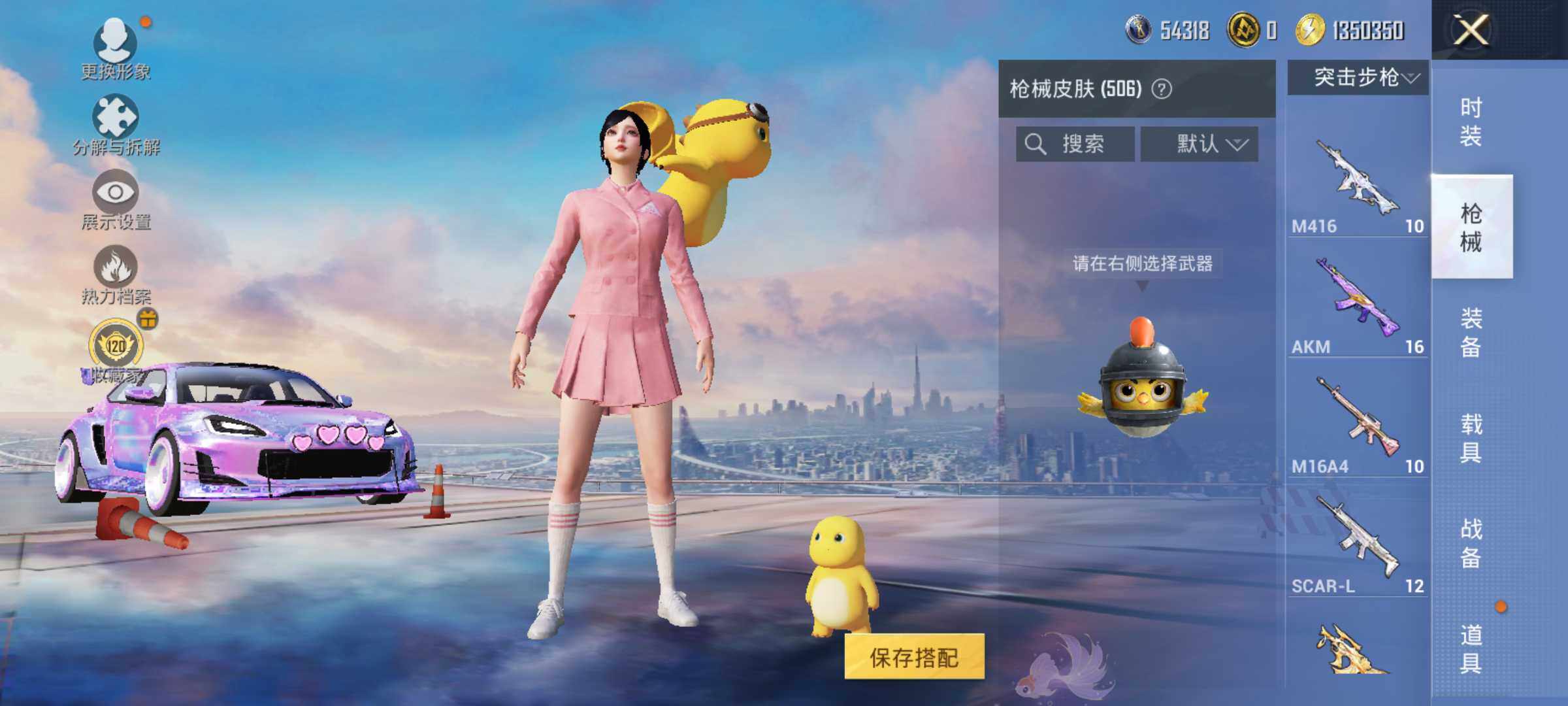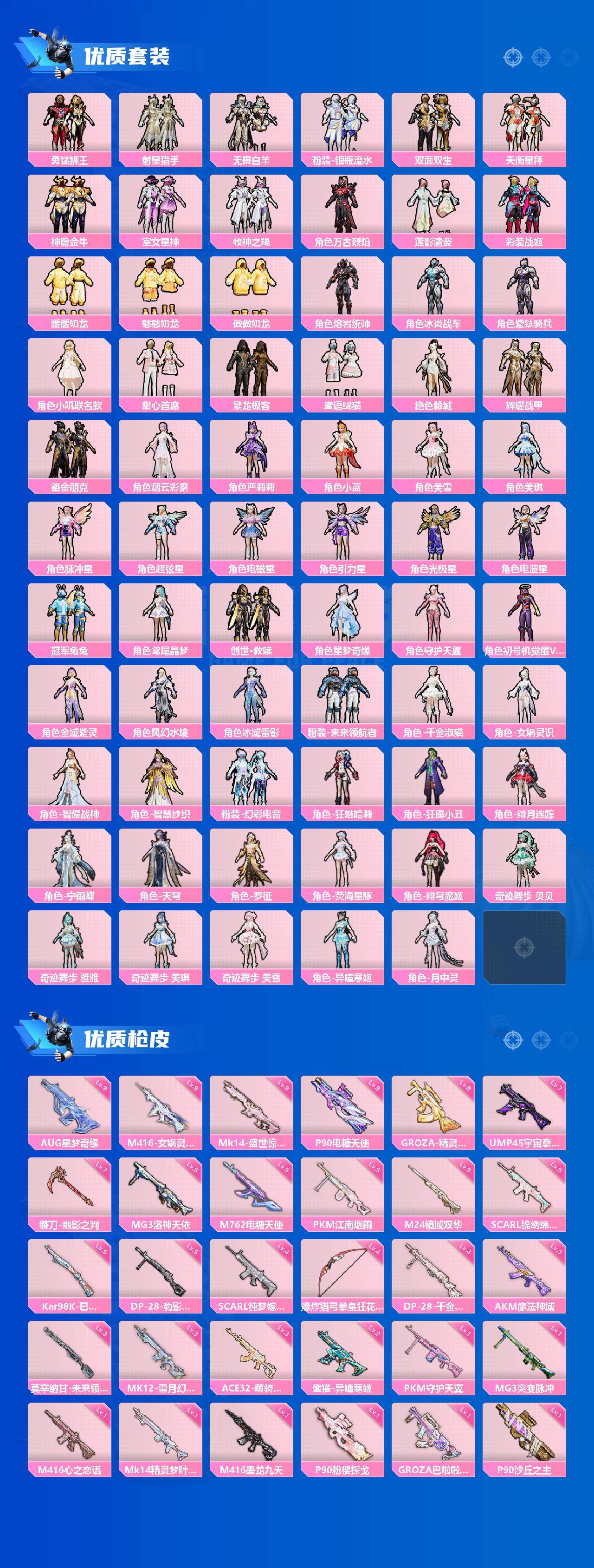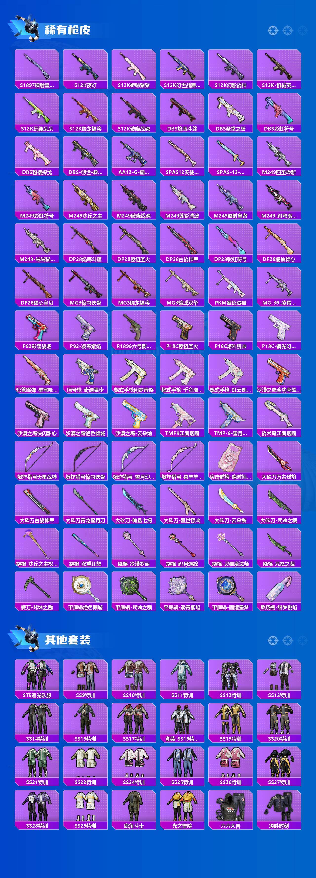 AKM-魔法神域,SCAR-L-纯梦嫁纱,SCAR-L-锦绣绵绵,M416-心之恋语,M416-墨龙九天,M416-女娲灵识,GROZA-巴啦啦小魔仙,GROZA-精灵之光,AUG-星梦奇缘,M762-电糖天使,UMP45-宇宙意志,P90-粉樱探戈,P90-沙丘之主,P90-电糖天使,Kar98K-巳巳如意,Kar98K-圣域龙灵,M24-镜域双华,Mk14-精灵梦叶罗丽,Mk14-盛世惊鸿,莫辛纳甘-未来领航者,MK12-雪月幻音,DP-28-千金淑猫,MG3-洛神天依,MG3-突变脉冲,PKM-江南烟雨,PKM-守护天翼,爆炸猎弓-拳皇·狂花道,破片手榴弹-粉粉猫爪