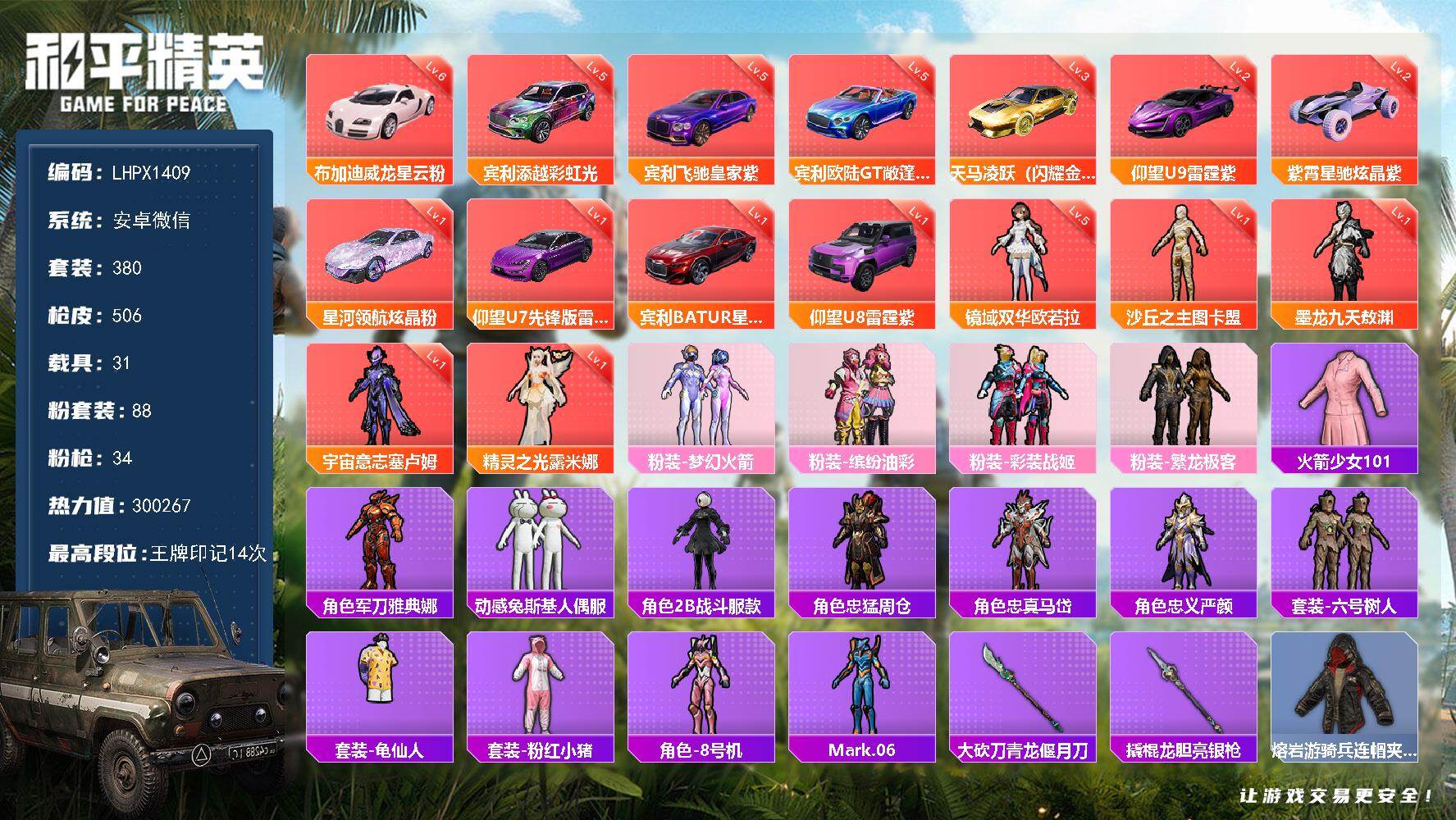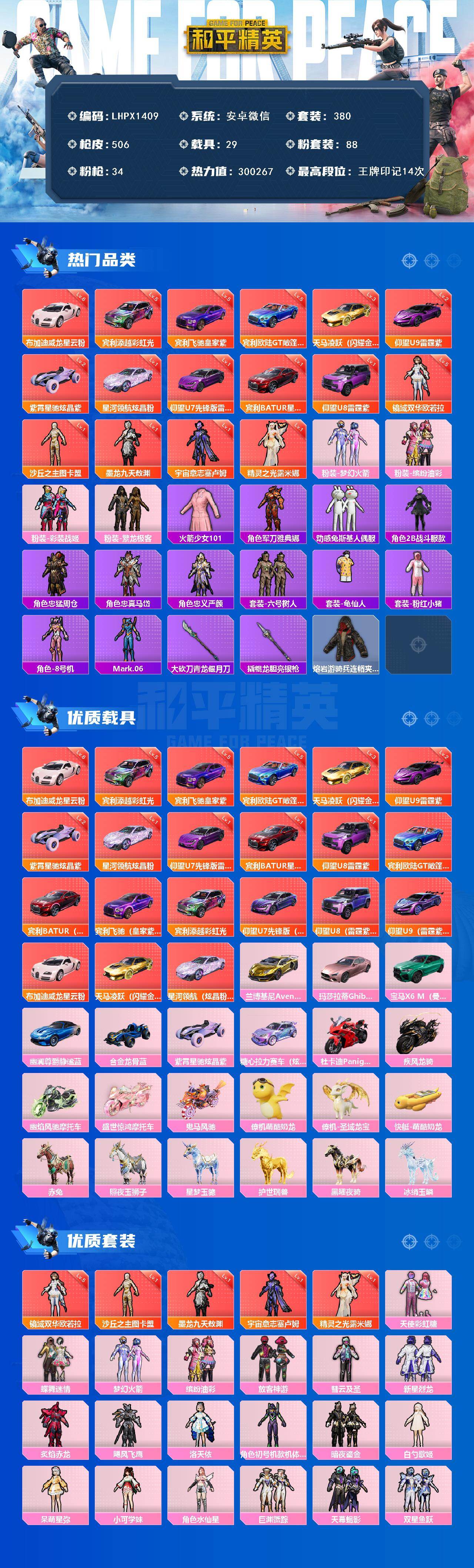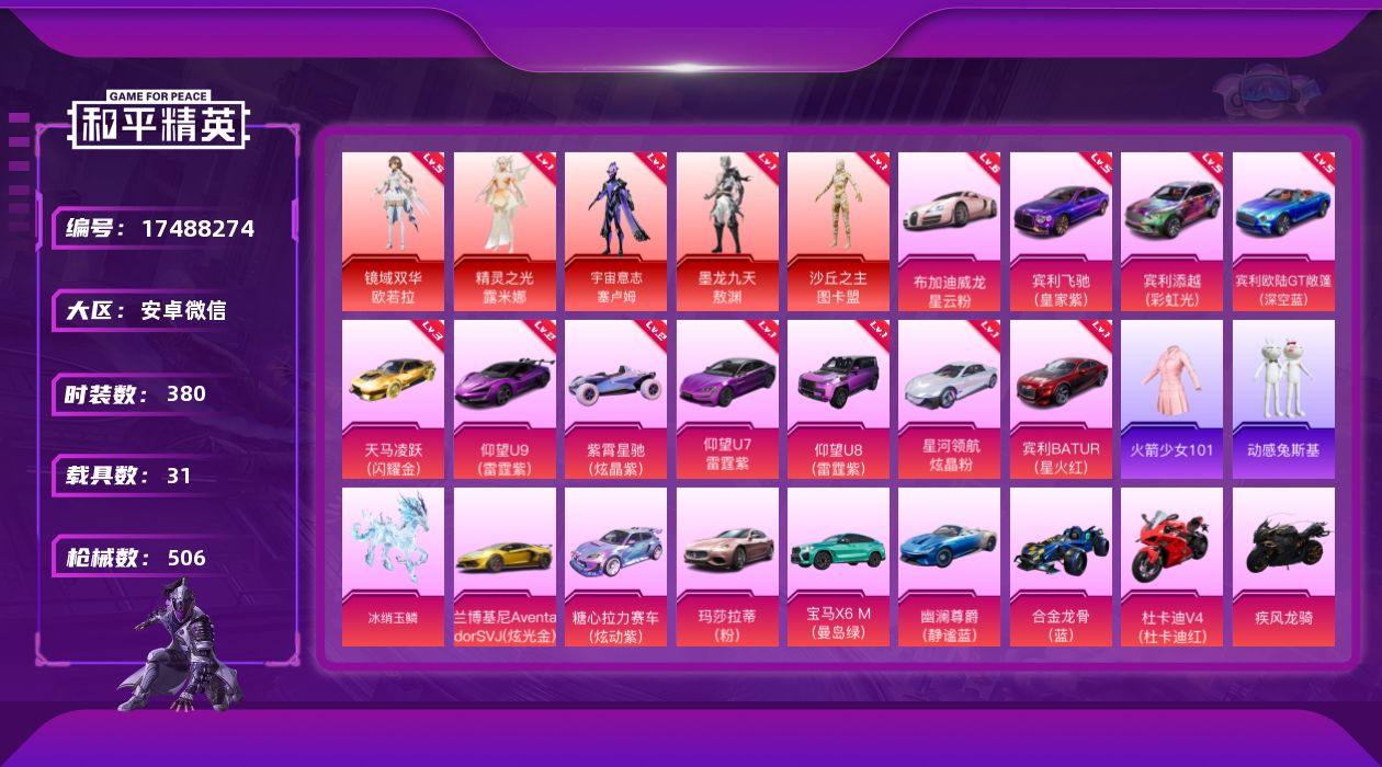 [17488274]绝世印记1 /老101 /AUG-星梦奇缘(九级)/Mk14-盛世惊鸿(九级)/M416-女娲灵识(九级)/布加迪威龙(星云粉)(六级) 安卓 微信-5神装-88粉装-34特效枪-31载具-38粉色飞行器-300267热力值-14王牌印记-380套装-506枪皮 【红色载具】:宾利添越(彩虹光)(五级),宾利BATUR(星火红)(一级),宾利飞驰(皇家紫)(五级),宾利欧陆GT敞篷(深空蓝)(五级),布加迪威龙(星云粉)(六级),仰望U8(雷霆紫)(一级),仰望U7(雷霆紫)(一级),仰望U9(雷霆紫)(二级),紫霄星驰(炫晶紫)(二级),星河领航(炫晶粉)(一级),天马凌跃(闪耀金)(三级) 【红色神装等级】:精灵之光-露米娜(一级),宇宙意志-塞卢姆(一级),墨龙九天-敖渊(一级),镜域双华-欧若拉(五级),沙丘之主-图卡盟(一级) 【红色角色神装】:精灵之光-露米娜,宇宙意志-塞卢姆,墨龙九天-敖渊,镜域双华-欧若拉,沙丘之主-图卡盟 【热门品类】:粉装-梦幻火箭,粉装-缤纷油彩,粉装-彩装战姬,粉装-繁龙极客,套装-火箭少女101,角色-军刀雅典娜,套装-动感兔斯基人偶服,角色-2B战斗服款,角色-忠猛周仓,角色-忠真马岱,角色-忠义严颜,套装-六号树人,套装-龟仙人,套装-粉红小猪,角色-8号机,角色-Mark.06,大砍刀-青龙偃月刀,撬棍-龙胆亮银枪,熔岩游骑兵连帽夹克 【粉色套装】:粉装-天使彩虹糖,粉装-蝶舞迷情,粉装-梦幻火箭,粉装-缤纷油彩,粉装-放客神游,粉装-彗云及圣,粉装-新星烈龙,粉装-炙焰赤龙,粉装-飓风飞鹰,角色-洛天依,角色-初号机款机体服,粉装-暗夜鎏金,角色-白勺歌姬,角色-呆萌星弥,角色-小可学妹,角色-水仙星,粉装-巨渊蟹踪,粉装-天幕蝎影,粉装-双星鱼跃,粉装-勇猛狮王,粉装-射星猎手,粉装-无畏白羊,粉装-银瓶流水,粉装-双面双生,粉装-天衡星秤,粉装-神隐金牛,粉装-室女星神,粉装-牧神之羯,角色-万古烈焰,粉装-莲影清波,粉装-彩装战姬,粉装-暖暖奶龙,粉装-憨憨奶龙,粉装-傲傲奶龙,角色-熔岩统帅,角色-冰炎战车,角色-紫钛骑兵,角色-小叽联名款,粉装-甜心首席,粉装-繁龙极客,粉装-蜜语绒猫,角色-绝色倾城,粉装-辉耀战甲,粉装-鎏金朋克,角色-烟云彩露,角色-严莉莉,角色-小蓝,角色-美雪,角色-美琪,角色