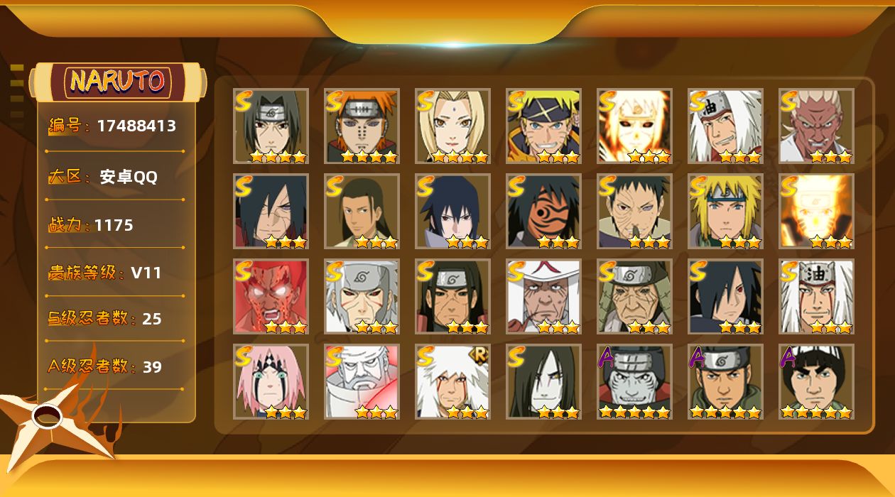 [17488413]25S级忍者数-39A级忍者数 【S级忍者】:猿飞日斩「秽土转生」(3星),千手扉间「秽土转生」(3星),千手柱间「秽土转生」(3星),宇智波斑「秽土转生·解」(3星),春野樱「忍界大战」(3星),宇智波带土「忍界大战」(3星),艾「忍界大战」(3星),宇智波鼬「须佐能乎」(4星),宇智波斑「木叶创立」(3星),千手柱间「木叶创立」(3星),自来也(3星),自来也「舞之豪杰」(3星),大蛇丸(3星),自来也「传说中的三忍」(3星),纲手(4星),猿飞日斩(3星),波风水门(3星),神秘面具男「红夜之刃」(3星),漩涡鸣人「九喇嘛连结」(3星),迈特凯「死门」(3星),佩恩「天道」(4星),宇智波佐助「永恒万花筒」(3星),大筒木金式(3星),波风水门「九喇嘛连结」(3星),漩涡鸣人·宇智波佐助(3星) 【A级忍者】:艾「青年」(2星),长门「青年」(2星),波风水门「青年」(2星),达鲁伊「博人传」(2星),迪达拉(2星),奇拉比(2星),飞段(3星),飞段「死司凭血」(3星),干柿鬼鲛(5星),漩涡博人「桃式显现」(2星),迈特凯(5星),旗木卡卡西「幻之真容」(2星),桃地再不斩「漂泊武士」(2星),桃地再不斩「秽土转生」(2星),我爱罗「疾风传」(3星),我爱罗「忍界大战」(2星),蝎(4星),蝎「绯流琥」(2星),小南(2星),小南「漂泊浪客」(2星),猿飞阿斯玛(5星),宇智波鼬(2星),宇智波佐助「须佐能乎」(2星),宇智波佐助「疾风传咒印」(2星),宇智波佐助「万花筒写轮眼」(2星),日向宁次「忍界大战」(3星),日向雏田「最终章」(2星),长十郎「六代目水影」(2星),佩恩·六道「漂泊浪客」(2星),李洛克「忍界大战」(2星),春野樱「百豪」(2星),秋道丁次「忍界大战」(2星),千代「近松十人卫」(2星),土台「忍界大战」(2星),不缘(2星),不风(2星),宇智波泉奈(2星),大野木「侠隐江湖」(2星),迈特凯「青春爆炸」(2星)
