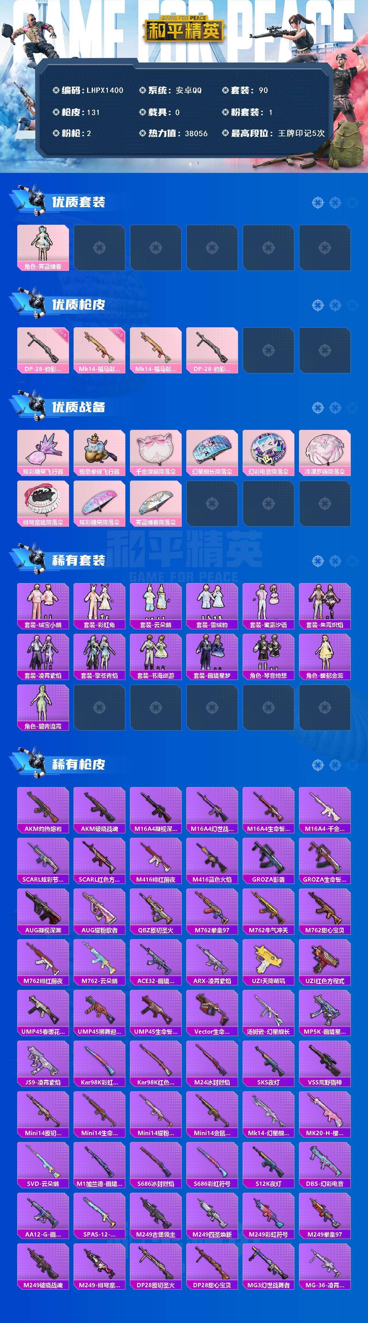 - [16331381]【特价出售/店主推荐】苹果 手Q-12粉装-7特效枪-3载具-6粉色飞行器-101674热力值-17王牌印记-218套装-314枪皮 【热门品类】:角色-军刀雅典娜,套装-龟仙人,套装-粉红小猪,角色-8号机,角色-Mark.06 【粉色套装】:粉装-新星烈龙,粉装-彩虹甜喵,粉装-暗夜鎏金,粉装-飒粉甜心,粉装-莲影清波,粉装-镜光幻境,角色-小蓝,角色-美琪,套装-创世·救赎,粉装-幻影飞狐,角色-冷漠罗丽,角色-罗征 【粉色枪皮等级】:SCAR-L-锦绣绵绵(五级),M416-风花雪月(七级),M416-电玩时刻(五级),AUG-圣斗士星矢(七级),Kar98K-巳巳如意(五级),Kar98K-圣域龙灵(三级),DP-28-豹影疾电(五级) 【粉色载具】:玛莎拉蒂Quattroporte(夜幕蓝),保时捷918 Spyder(沉静蓝),保时捷Cayenne(橄榄绿) 【粉色枪皮】:SCAR-L-锦绣绵绵,M416-风花雪月,M416-电玩时刻,AUG-圣斗士星矢,Kar98K-巳巳如意,Kar98K-圣域龙灵,DP-28-豹影疾电 【粉色飞行器】:太空嘟嘟飞行器,镜域双华-灵镜之阶,龙翔九天飞行器,深渊漩涡飞行器,雀灵庇佑飞行器 【粉色降落伞】:星之彼岸降落伞,暗夜玫瑰降落伞,垂柳戏鸭降落伞,飒粉甜心降落伞,未来歌姬降落伞,炫光之旅降落伞,莲影清波降落伞,镜光幻境降落伞,圣堂之誓降落伞,精灵梦叶罗丽降落伞,墨龙九天降落伞,初号机 觉醒Ver.降落伞,金丰海韵降落伞,鬼刀降落伞,圣域龙灵降落伞,星穹咏叹调降落伞,幻彩电音降落伞,炫彩糖果降落伞 【稀有套装】:套装-龟仙人,套装-巳巳如意,套装-小鸟芋圆,套装-炫彩糖果,套装-雏菊兔兔,套装-萝兰蝴蝶,角色-狂花道·雅典娜,套装-糖糖葫芦,套装-青团波波,套装-棉花软糖,角色-俏兔智灵,套装-燕燕于飞,套装-鱼渊荷华,套装-樱梦幻音,套装-粉恋花,套装-紫幽梦,套装-蓝冰羽,角色-幽澜祭司,套装-星影赞美诗,套装-极速光影,套装-彩虹兔,套装-云朵鹅,套装-雪绒豹,套装-蓝海鲸歌,套装-朱霞炽焰,套装-凌霄紫焰,套装-擎苍青焰,角色-绯色魅影 【稀有枪皮】:AUG-冰晶雪宝,AKM-彩虹符号,AKM-影袭,AKM-星兔领航员,AKM-破晓战魂,AKM-萌趣颜团子,AKM-虎虎生威,AKM-霓虹街区,AKM-龙的传