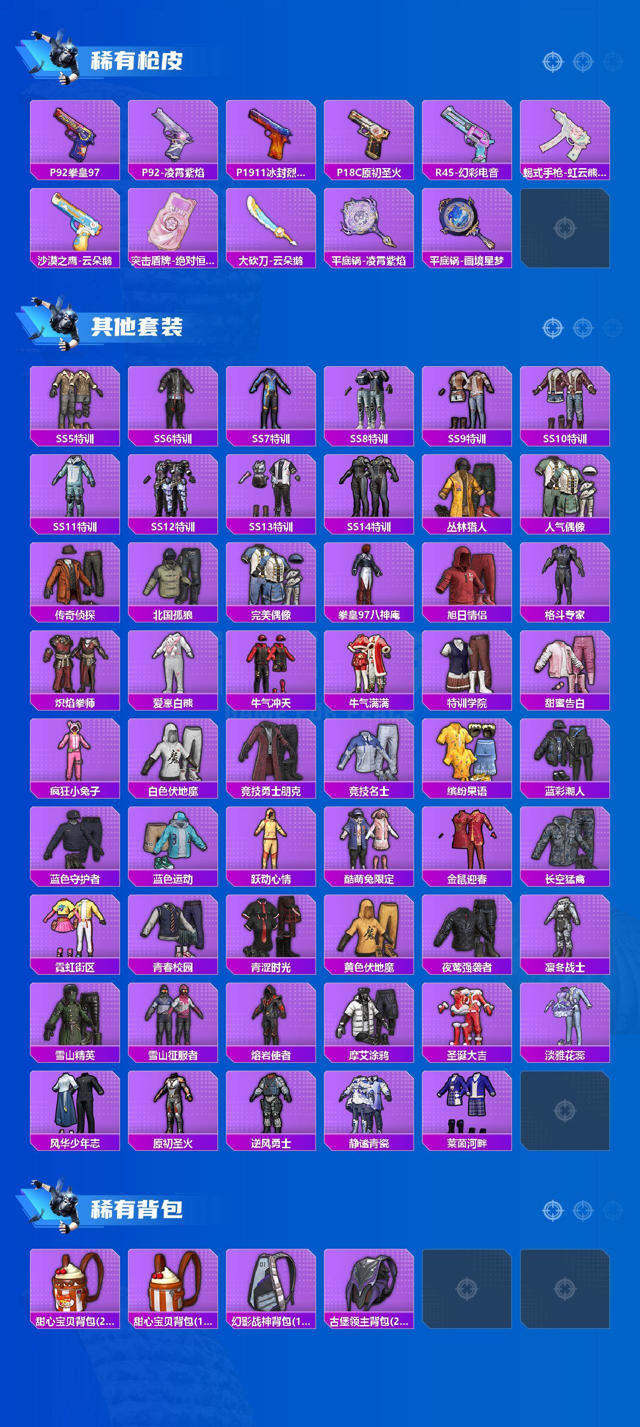 - PX_2100871-??/枪械6/装备407/载具5/战备244/王牌印记19/热力值119975/二级M416-五爪金龙/一级M416-心之恋语/七级M416-至情至圣/四级汤姆逊-怪笑疯兔/一级Kar98K-未来歌姬/四级Kar98K-巳巳如意/特斯拉R水滴蓝/阿斯顿马丁S红色/玛莎拉蒂粉色/玛莎拉蒂蓝色/鬼马风驰/幻影战神/粉装-深渊皇后/天使彩虹糖/水曜玄武/梦幻火箭/PEL轰鸣竞梦者/