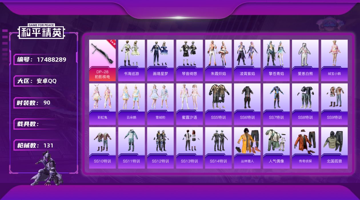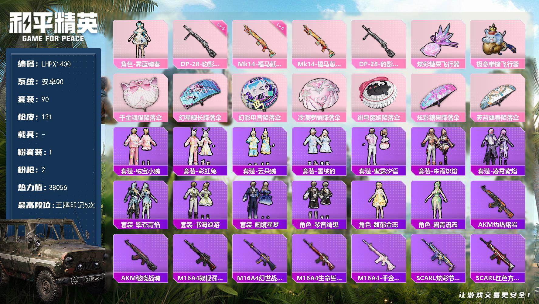 [17488289]【特价出售/店主推荐】 安卓 手Q-1粉装-2特效枪-2粉色飞行器-3.8w热力值-5王牌印记-90套装-131枪皮【粉色套装】:角色-霁蓝缠春【粉色枪皮等级】:Mk14-福马献瑞(五级),DP-28-豹影疾电(五级)【粉色飞行器】:炫彩糖果飞行器,极意拳锋飞行器