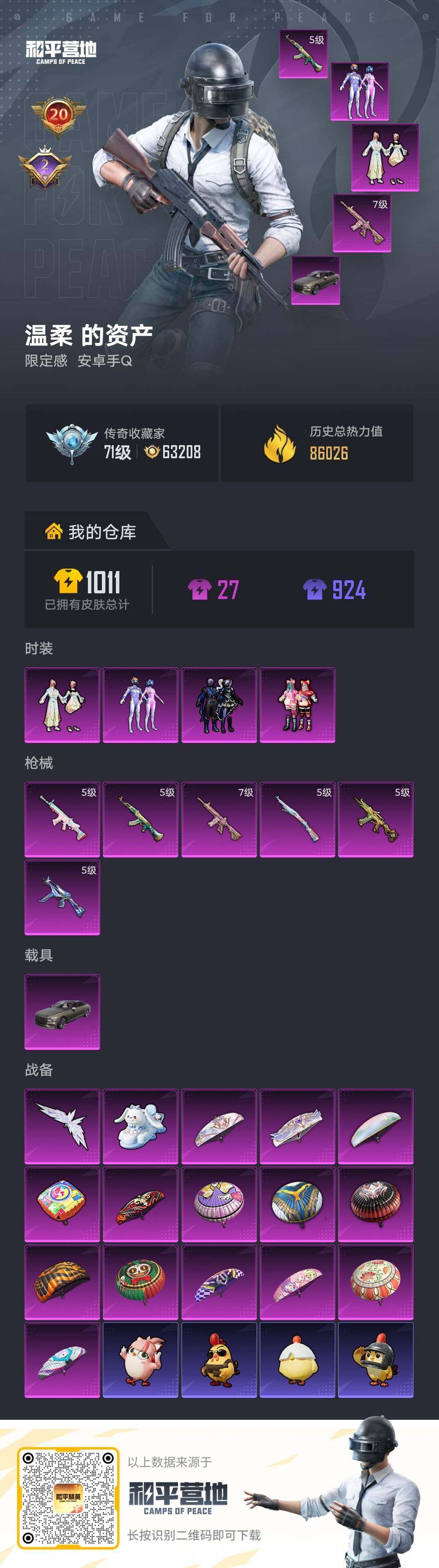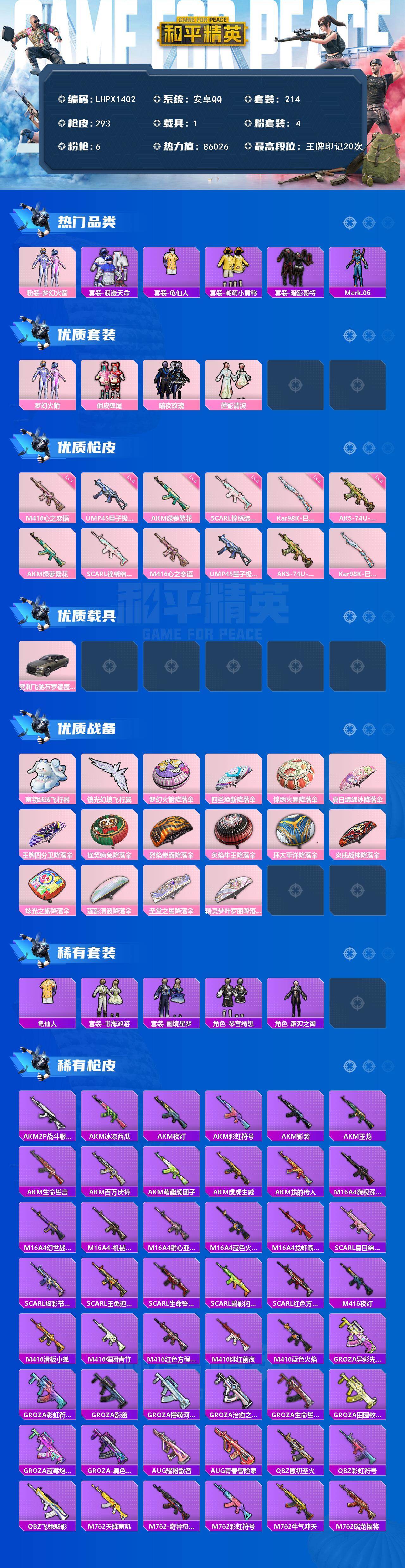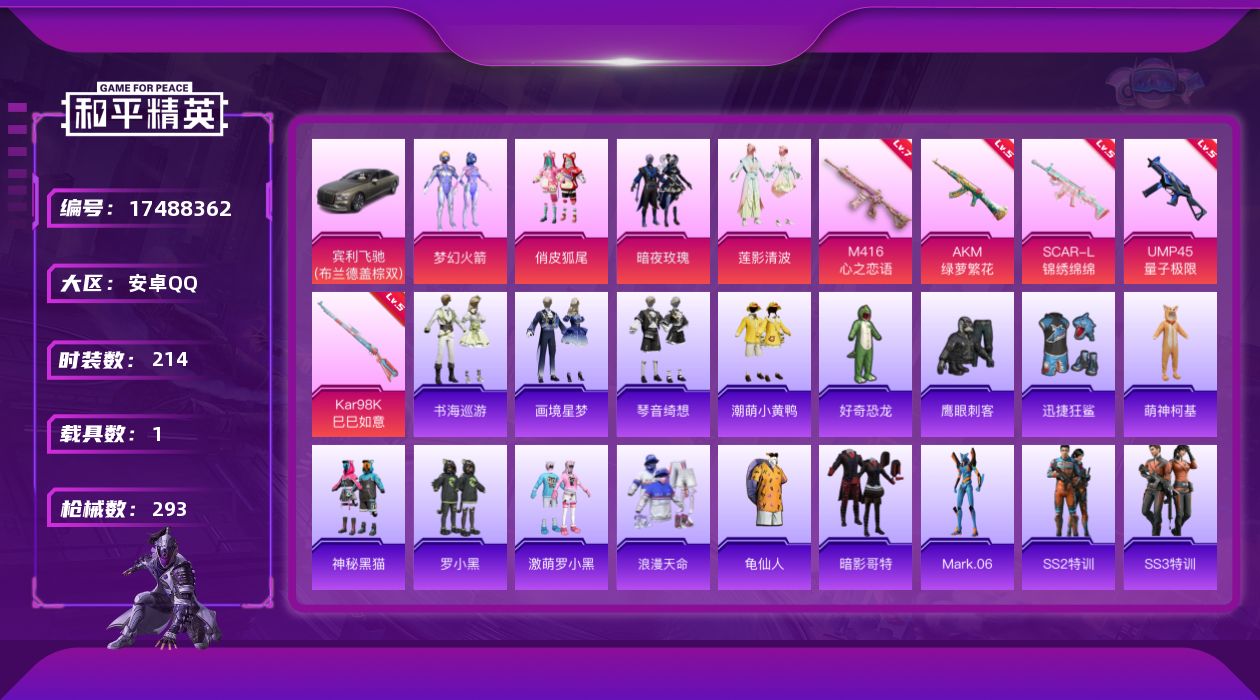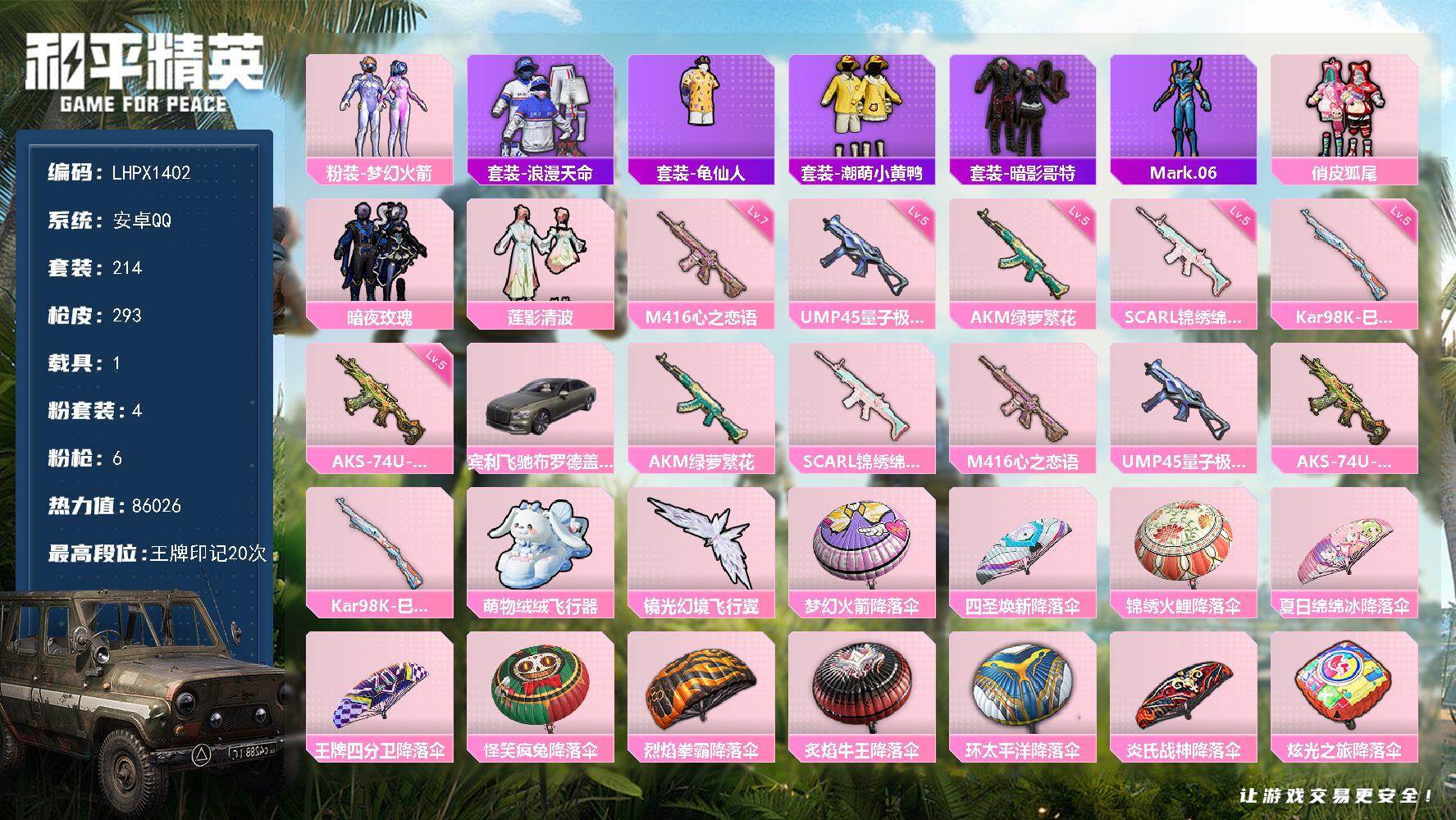 [17488362]可二次【特价出售/店主推荐】 安卓 手Q-4粉装-6特效枪-1载具-2粉色飞行器-8.6w热力值-20王牌印记-214套装-293枪皮【热门品类】:粉装-梦幻火箭,套装-浪漫天命,套装-龟仙人,套装-潮萌小黄鸭,套装-暗影哥特,角色-Mark.06【粉色套装】:粉装-梦幻火箭,粉装-俏皮狐尾,粉装-暗夜玫瑰,粉装-莲影清波【粉色枪皮等级】:AKM-绿萝繁花(五级),SCAR-L-锦绣绵绵(五级),M416-心之恋语(七级),UMP45-量子极限(五级),AKS-74U-森灵之息(五级),Kar98K-巳巳如意(五级)【粉色载具】:宾利飞驰(布罗德盖棕双色)【粉色飞行器】:萌物绒绒飞行器,镜光幻境飞行翼