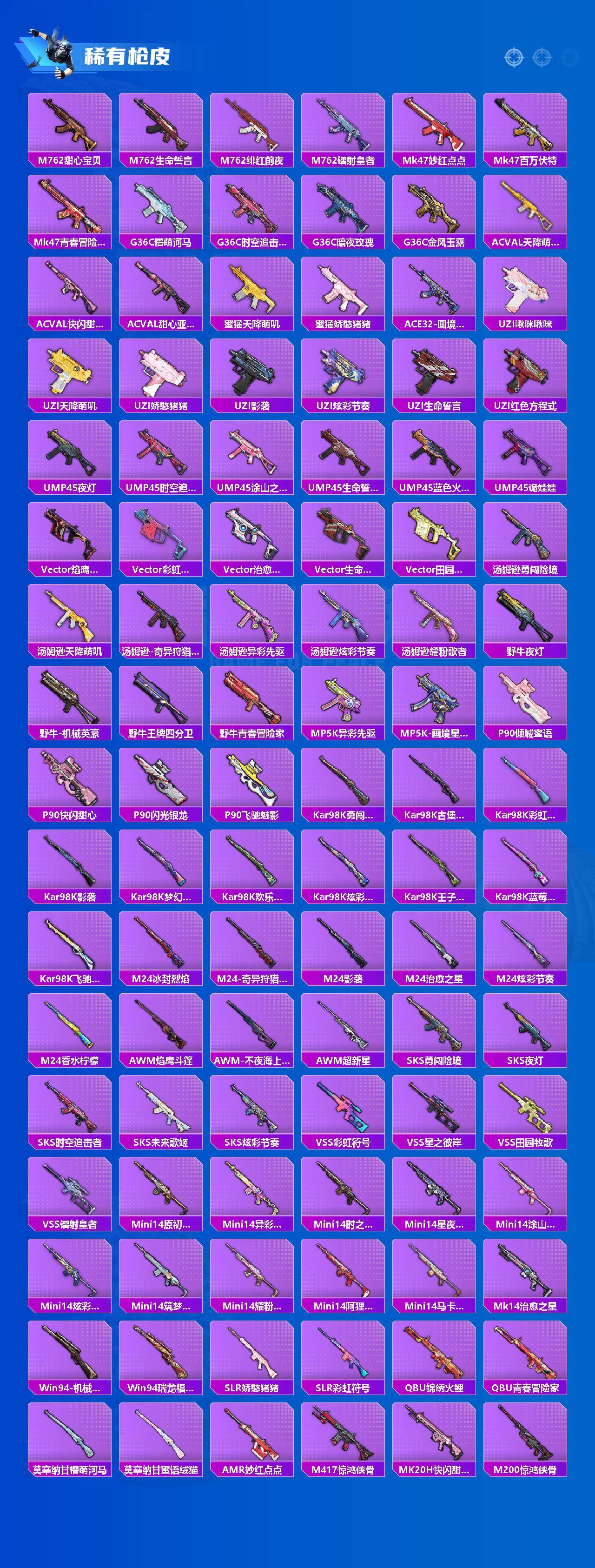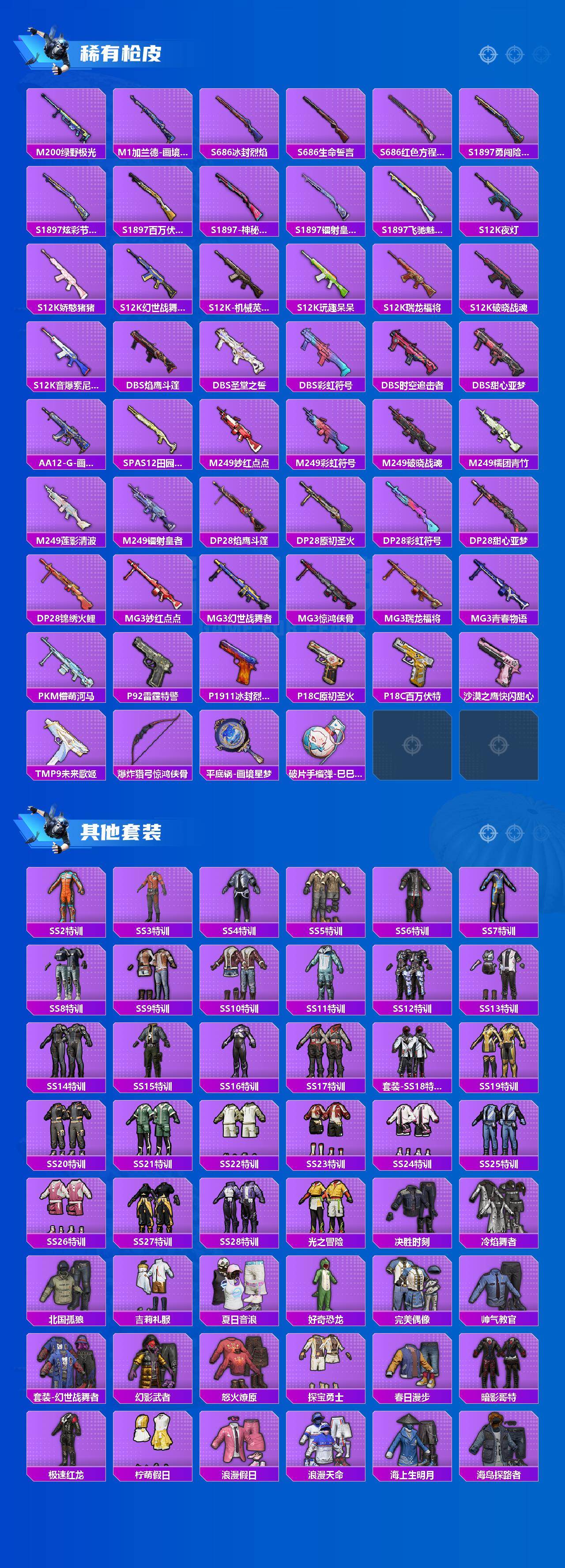 AKM-百万伏特,M762-奇异狩猎者,M762-瑞龙福将,Kar98K-古堡领主,M24-香水柠檬,M24-奇异狩猎者