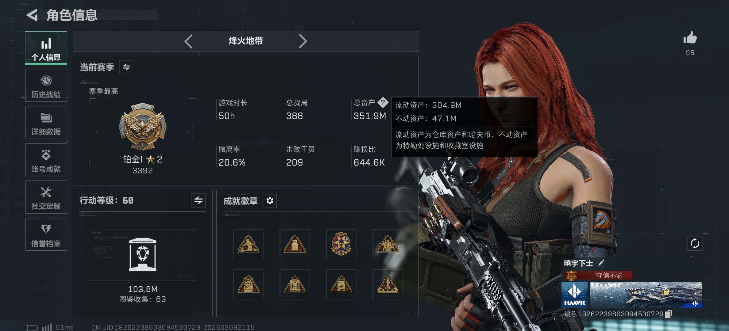 [17488380]350m总资产-107974k哈伏币-60烽火等级-铂金-50战场等级-尉官