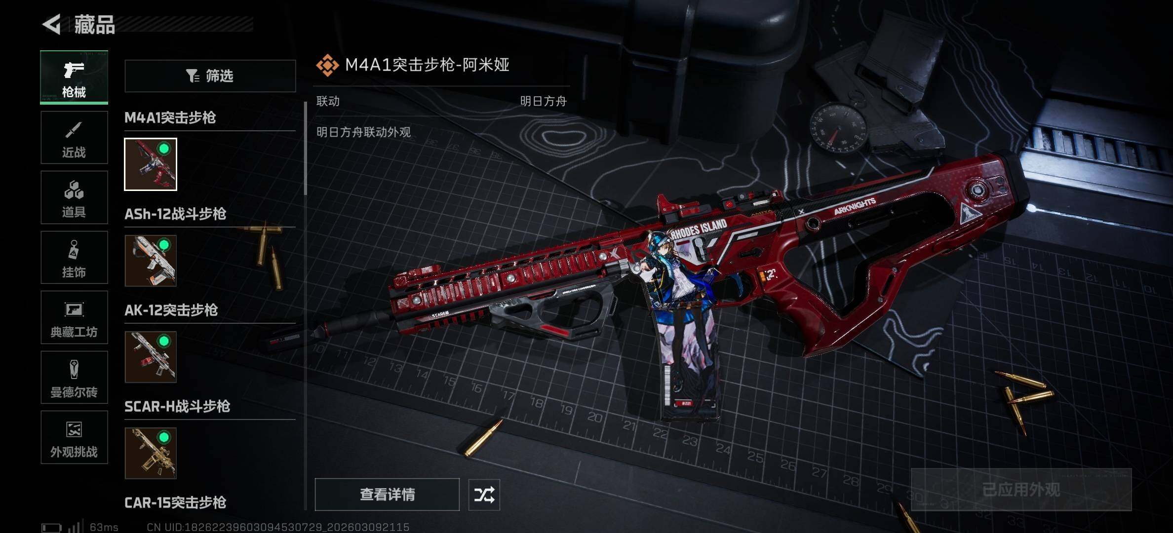 【传说外观】:M4A1突击步枪-阿米娅,ASh-12战斗步枪-鹅鸭杀,AK-12突击步枪-特斯拉线圈,SCAR-H战斗步枪-启航,CAR-15突击步枪-阿米娅,腾龙突击步枪-捞点薯条,腾龙突击步枪-马年祥瑞,KC17突击步枪-电锯惊魂,UZI冲锋枪-特斯拉线圈,SR-3M紧凑突击步枪-特斯拉线圈,勇士冲锋枪-能天使-午夜邮差,QCQ171冲锋枪-鹅鸭杀,PKM通用机枪-荼蘼,QJB201轻机枪-鹅鸭杀,M14射手步枪-缄花,SKS射手步枪-骑士,SR-25射手步枪-缄花,AWM狙击步枪-捞点薯条,.357左轮-缄花,G18-马年祥瑞,93R-捞点薯条,复合弓-黑·天际线