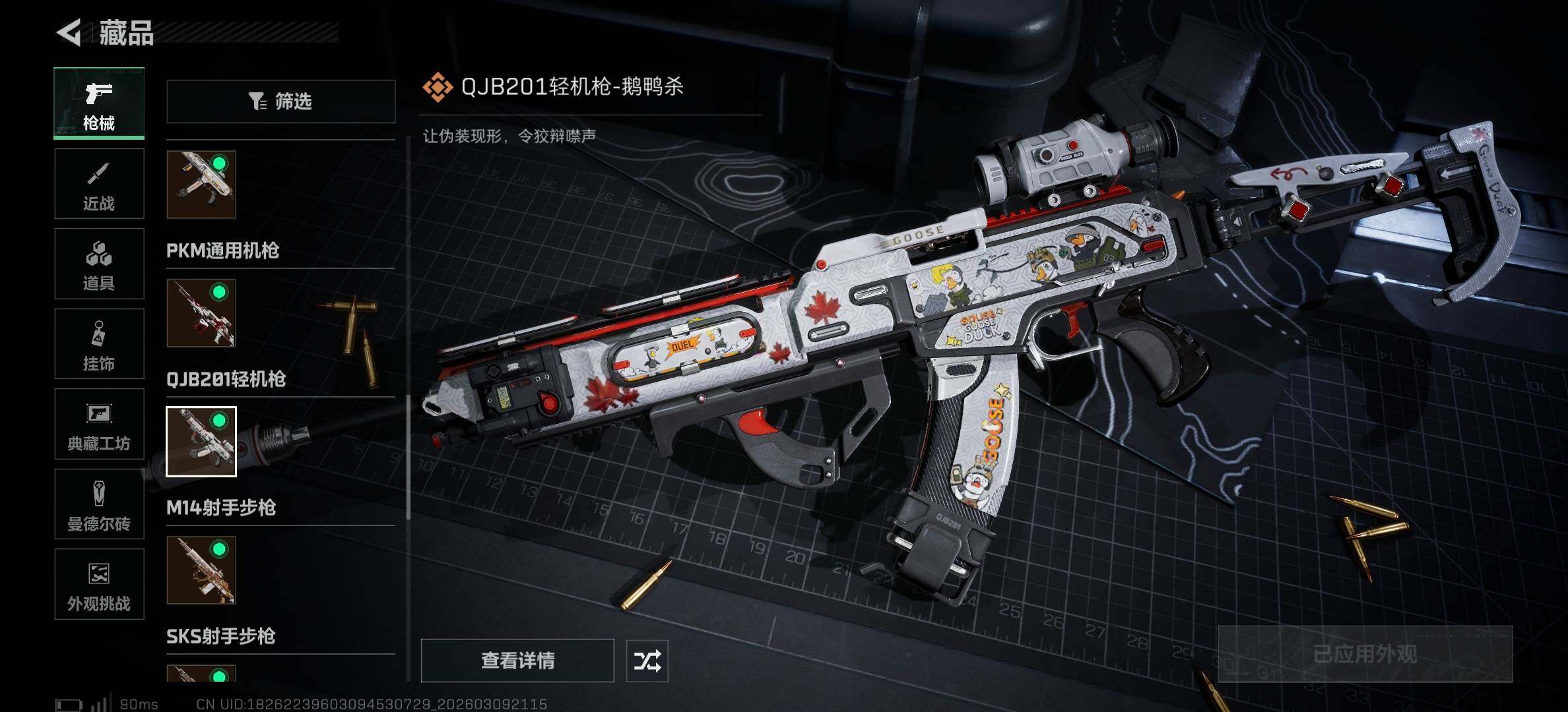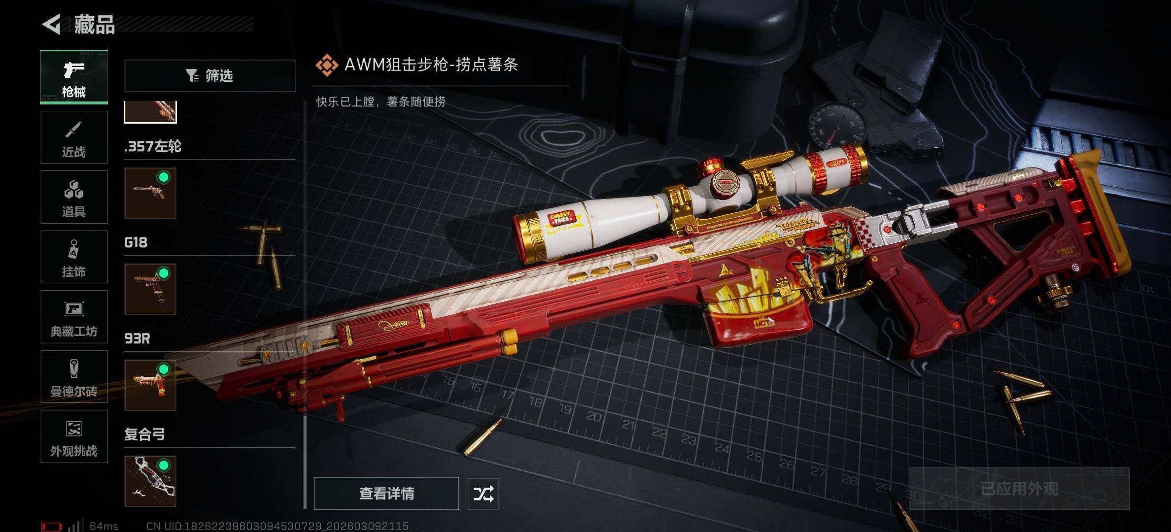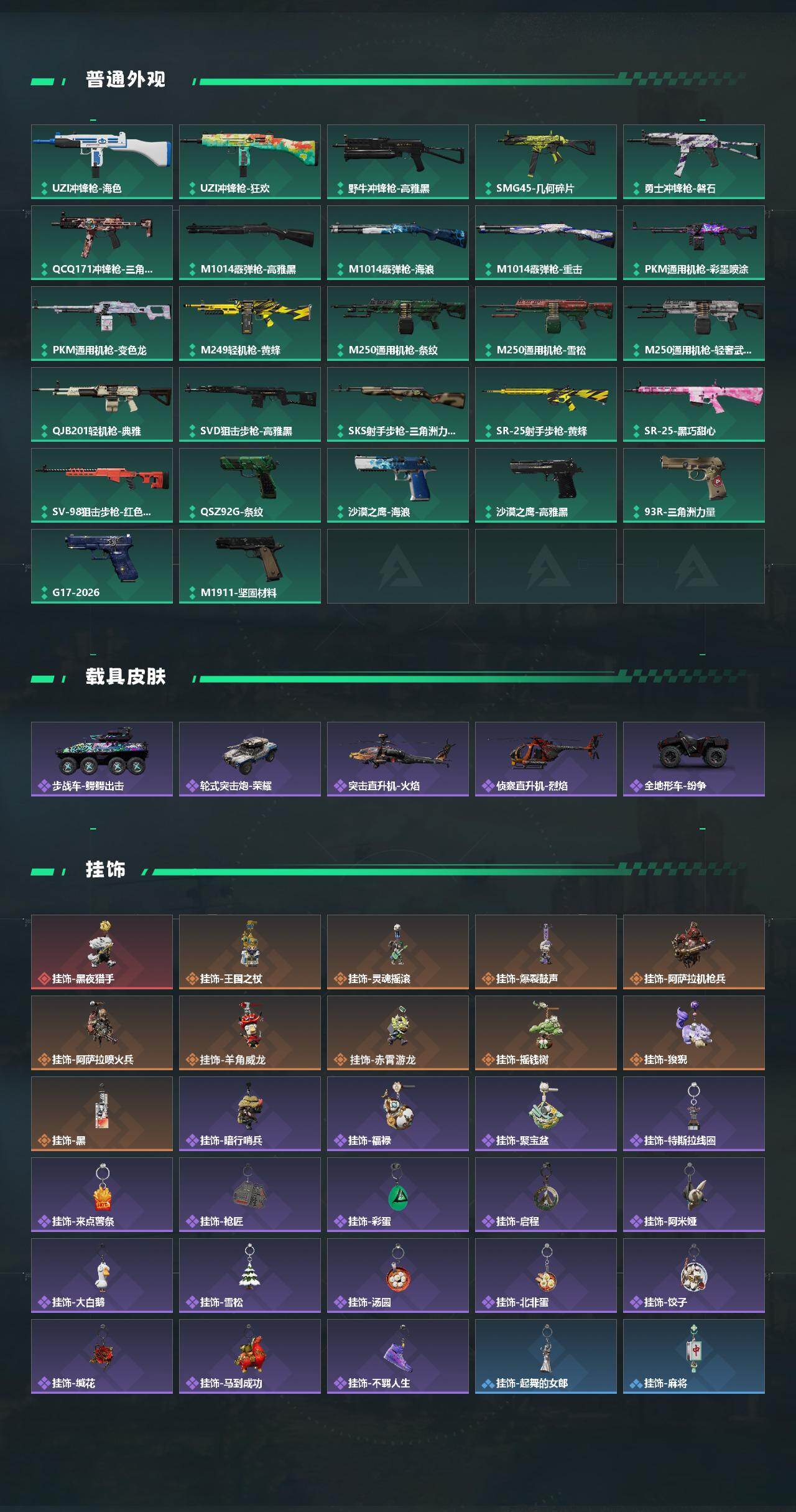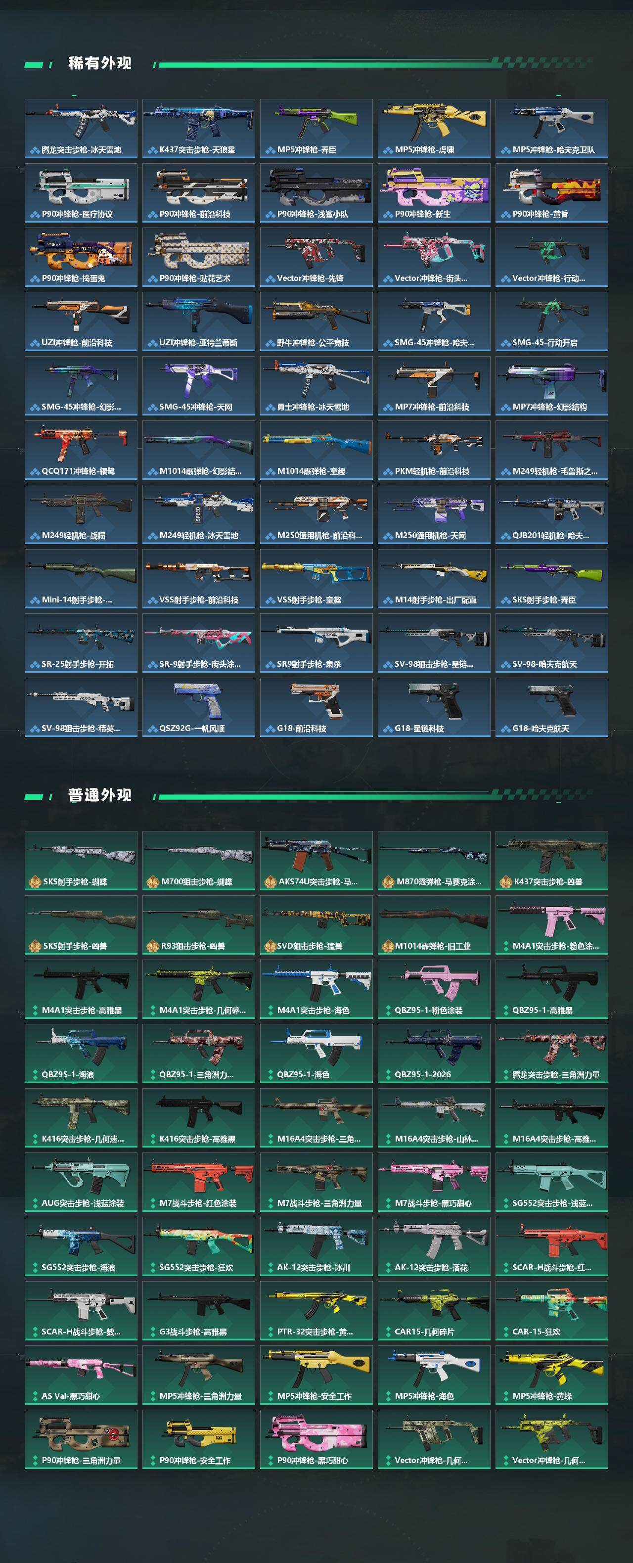 【史诗外观】:AKM突击步枪-林中猎手,QBZ95-1突击步枪-曙光,K416突击步枪-冬日风情,K416突击步枪-缄默情歌,M16A4突击步枪-竞赛选手,AUG突击步枪-蝮蛇,M7战斗步枪-禁卫,SG552突击步枪-哈夫克警备,SCAR-H战斗步枪-囚徒,G3战斗步枪-哈夫克警备,PTR-32突击步枪-工业狂潮,腾龙突击步枪-猎鳄行动,MP5冲锋枪-深海恐惧,MP5冲锋枪-战术竞备,MP5冲锋枪-竞技风,P90冲锋枪-暗影猎手,P90冲锋枪-紧急戒备,Vector冲锋枪-阿萨拉文明,Vector冲锋枪-猎鳄行动,SMG-45冲锋枪-阿萨拉特攻,SR-3M紧凑突击步枪-战术竞备,勇士冲锋枪-深海恐惧,勇士冲锋枪-工业狂潮,MP7冲锋枪-六套之力,M1014霰弹枪-林中猎手,S12K霰弹枪-曙光,PKM通用机枪-蝮蛇,PKM通用机枪-阿萨拉特攻,M250通用机枪-囚徒,QJB201轻机枪-炽焰,QJB201轻机枪-Old Habits,SVD狙击步枪-阿萨拉工艺,SVD狙击步枪-暗夜猎手,M14射手步枪-工业狂潮,SV-98狙击步枪-林中猎手,SV-98狙击步枪-囚徒,R93狙击步枪-竞赛选手,M700狙击步枪-竞技风,M700狙击步枪-蝮蛇,M700狙击步枪-哈夫克警备,.357左轮-幸运时刻,沙漠之鹰-曙光