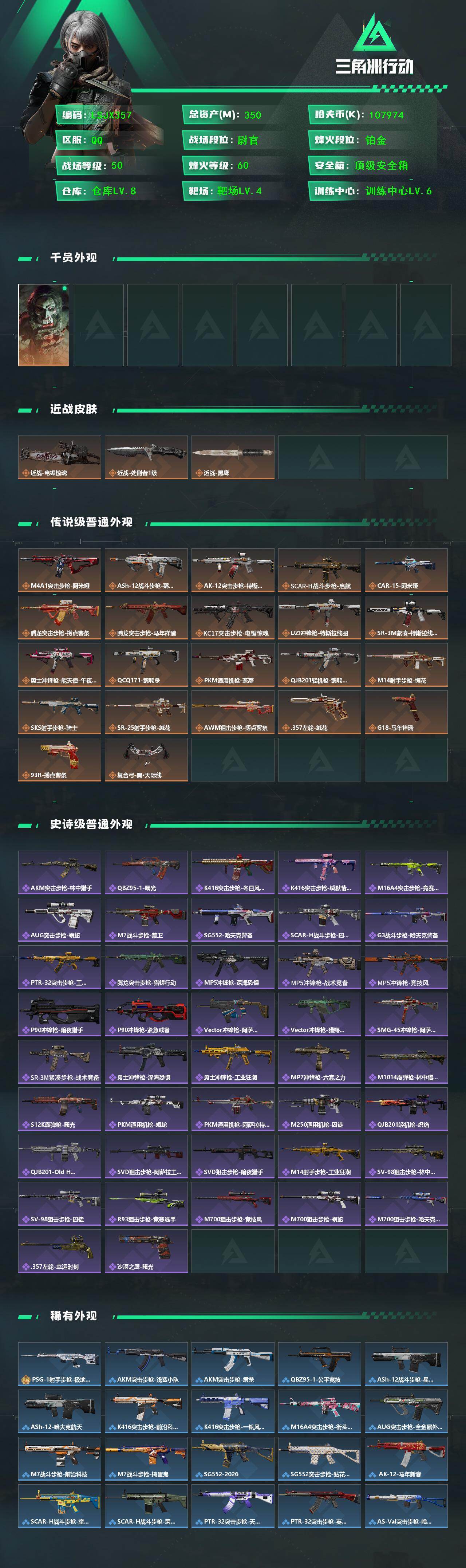 [17488380]350m总资产-107974k哈伏币-60烽火等级-铂金-50战场等级-尉官 【干员外观】:红狼-电锯惊魂 【近战皮肤】:近战-电锯惊魂,近战-处刑者1级,近战-黑鹰 【传说外观】:M4A1突击步枪-阿米娅,ASh-12战斗步枪-鹅鸭杀,AK-12突击步枪-特斯拉线圈,SCAR-H战斗步枪-启航,CAR-15突击步枪-阿米娅,腾龙突击步枪-捞点薯条,腾龙突击步枪-马年祥瑞,KC17突击步枪-电锯惊魂,UZI冲锋枪-特斯拉线圈,SR-3M紧凑突击步枪-特斯拉线圈,勇士冲锋枪-能天使-午夜邮差,QCQ171冲锋枪-鹅鸭杀,PKM通用机枪-荼蘼,QJB201轻机枪-鹅鸭杀,M14射手步枪-缄花,SKS射手步枪-骑士,SR-25射手步枪-缄花,AWM狙击步枪-捞点薯条,.357左轮-缄花,G18-马年祥瑞,93R-捞点薯条,复合弓-黑·天际线 【史诗外观】:AKM突击步枪-林中猎手,QBZ95-1突击步枪-曙光,K416突击步枪-冬日风情,K416突击步枪-缄默情歌,M16A4突击步枪-竞赛选手,AUG突击步枪-蝮蛇,M7战斗步枪-禁卫,SG552突击步枪-哈夫克警备,SCAR-H战斗步枪-囚徒,G3战斗步枪-哈夫克警备,PTR-32突击步枪-工业狂潮,腾龙突击步枪-猎鳄行动,MP5冲锋枪-深海恐惧,MP5冲锋枪-战术竞备,MP5冲锋枪-竞技风,P90冲锋枪-暗影猎手,P90冲锋枪-紧急戒备,Vector冲锋枪-阿萨拉文明,Vector冲锋枪-猎鳄行动,SMG-45冲锋枪-阿萨拉特攻,SR-3M紧凑突击步枪-战术竞备,勇士冲锋枪-深海恐惧,勇士冲锋枪-工业狂潮,MP7冲锋枪-六套之力,M1014霰弹枪-林中猎手,S12K霰弹枪-曙光,PKM通用机枪-蝮蛇,PKM通用机枪-阿萨拉特攻,M250通用机枪-囚徒,QJB201轻机枪-炽焰,QJB201轻机枪-Old Habits,SVD狙击步枪-阿萨拉工艺,SVD狙击步枪-暗夜猎手,M14射手步枪-工业狂潮,SV-98狙击步枪-林中猎手,SV-98狙击步枪-囚徒,R93狙击步枪-竞赛选手,M700狙击步枪-竞技风,M700狙击步枪-蝮蛇,M700狙击步枪-哈夫克警备,.357左轮-幸运时刻,沙漠之鹰-曙光 【稀有外观】:PSG-1射手步枪-极地勘察队,AKM突击步枪-浅鲨小队,AKM突击步枪-肃杀,QBZ95-1突击步枪-公平竞