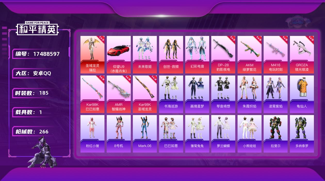 [17488597]【特价出售/店主推荐】 安卓 手Q-1神装-3粉装-9特效枪-1载具-3粉色飞行器-8.5w热力值-7王牌印记-185套装-266枪皮【红色神装等级】:圣域龙灵-瑞拉(三级)【热门品类】:套装-龟仙人,套装-粉红小猪,角色-8号机,角色-Mark.06【粉色套装】:粉装-未来歌姬,套装-创世·救赎,粉装-幻彩电音【粉色枪皮等级】:AKM-绿萝繁花(五级),M416-电玩时刻(五级),GROZA-镜光银凌(五级),AKS-74U-森灵之息(五级),Kar98K-巳巳如意(五级),Kar98K-圣域龙灵(三级),Mk14-福马献瑞(五级),AMR-智耀战神(五级),DP-28-豹影疾电(五级)【粉色载具】:仰望U9(赤霞丹朱)【粉色飞行器】:炫彩糖果飞行器,圣域金龙飞行器,暮色之舞飞行器