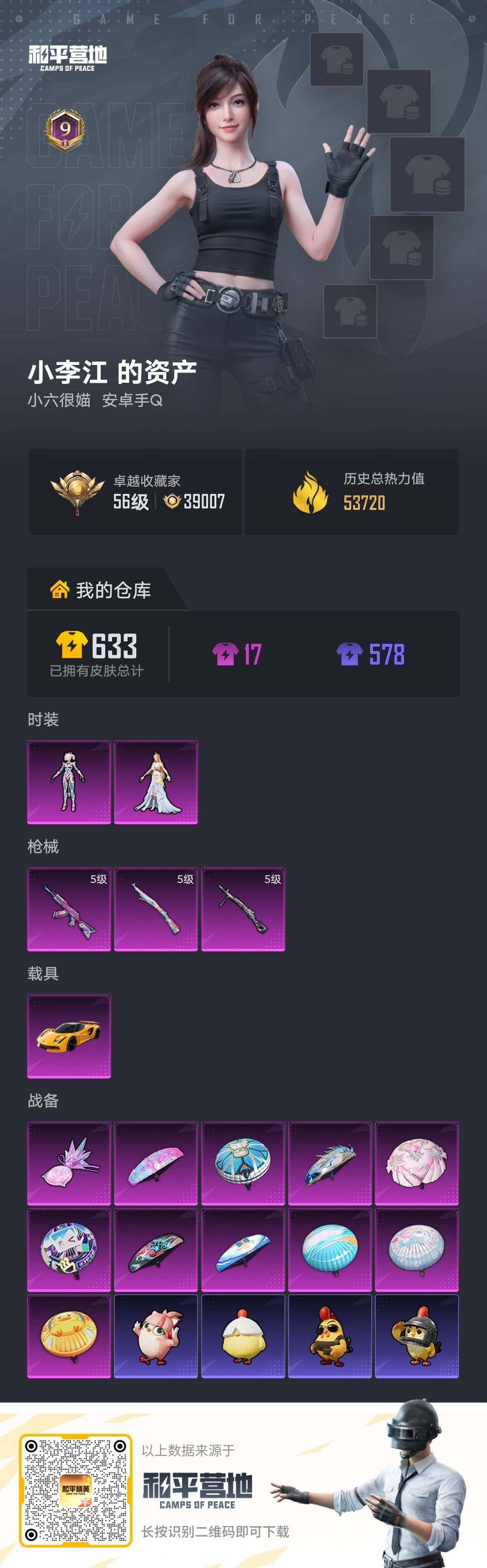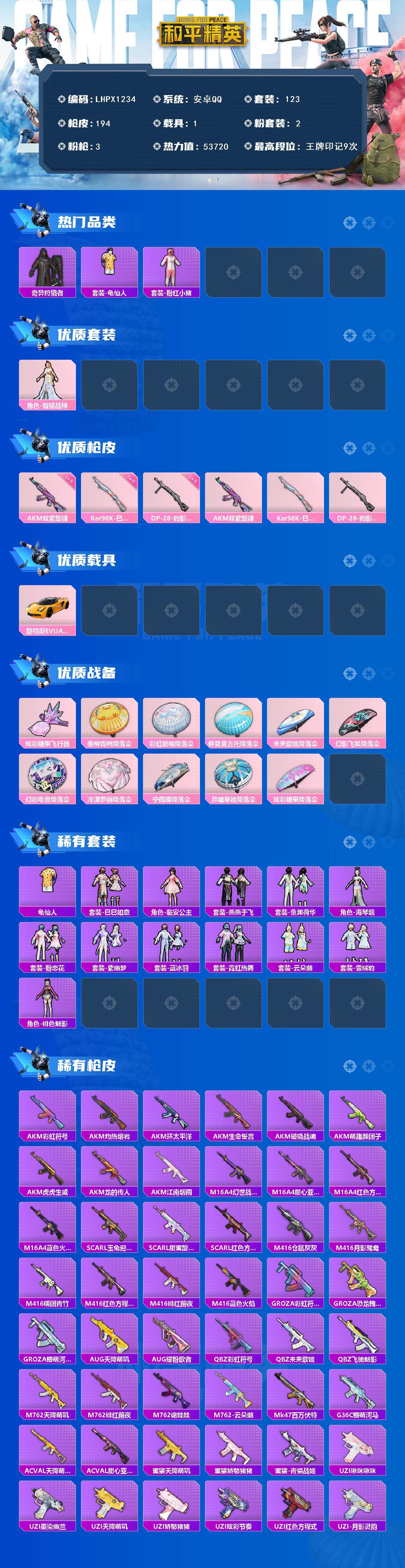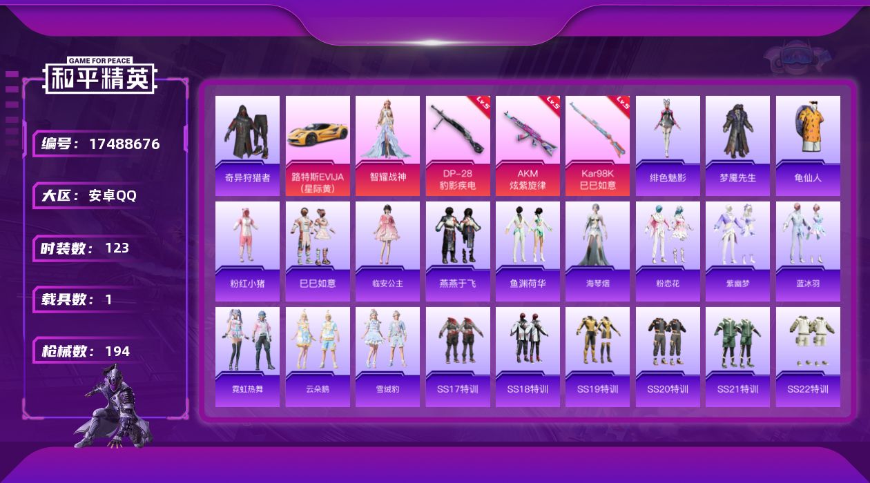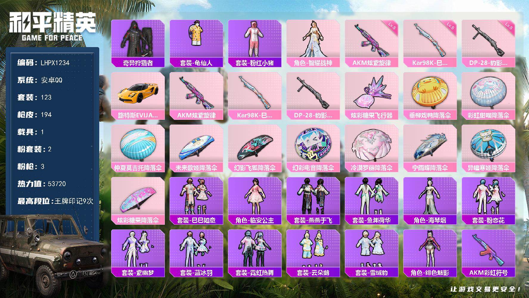 [17488676]可二次【特价出售/店主推荐】 安卓 手Q-2粉装-3特效枪-1载具-1粉色飞行器-5.3w热力值-9王牌印记-123套装-194枪皮【热门品类】:套装-奇异狩猎者,套装-龟仙人,套装-粉红小猪【粉色套装】:角色-智耀战神【粉色枪皮等级】:AKM-炫紫旋律(五级),Kar98K-巳巳如意(五级),DP-28-豹影疾电(五级)【粉色载具】:路特斯EVIJA(星际黄)【粉色飞行器】:炫彩糖果飞行器