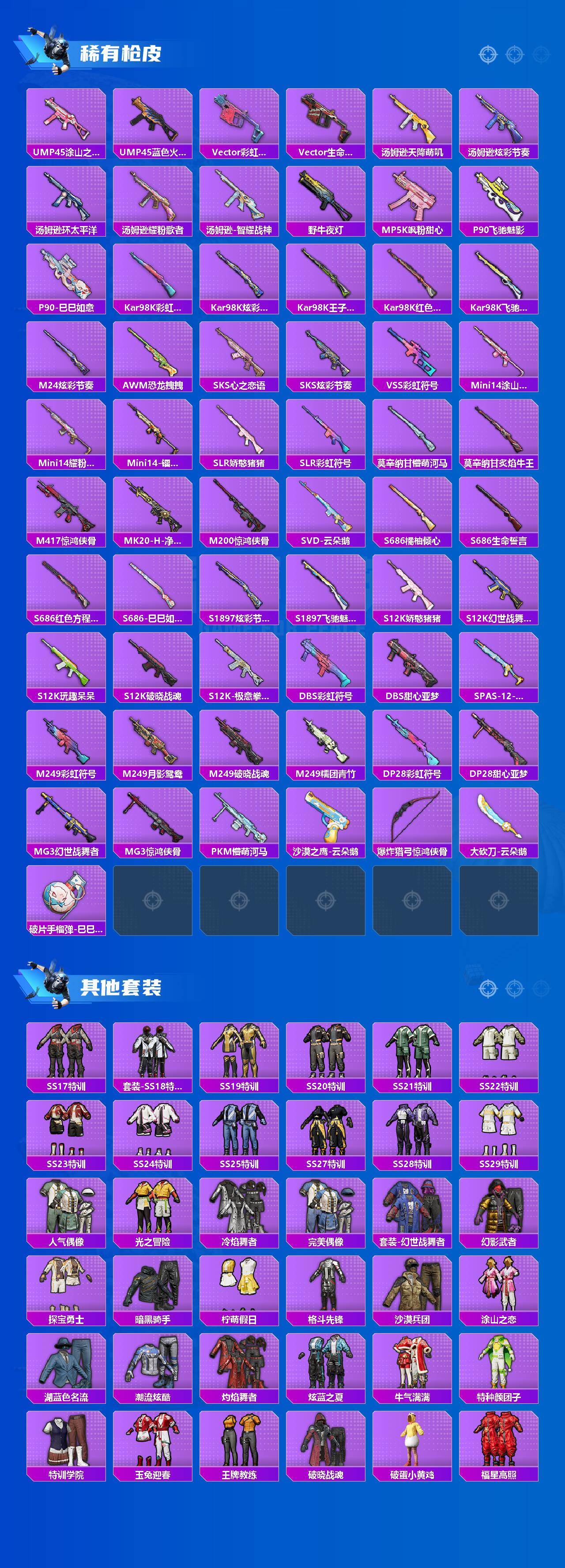 - PX_2101580-??/枪械3/装备194/载具4/战备114/王牌印记7/热力值57161/七级M416-五爪金龙/五级Kar98K-巳巳如意/七级MG3-炙焰牛王/特斯拉R水滴蓝/路特斯EV黄色/路特斯EL蓝色/玛莎拉蒂Q蓝色/蝶舞迷情/梦幻火箭/草莓生巧/银龙傲海/粉装-暗夜玫瑰/粉装-幻影飞狐/套装-燕燕于飞/套装-鱼渊荷华/套装-紫幽梦/套装-蓝冰羽/套装-云朵鹅/套装-雪绒豹/角色