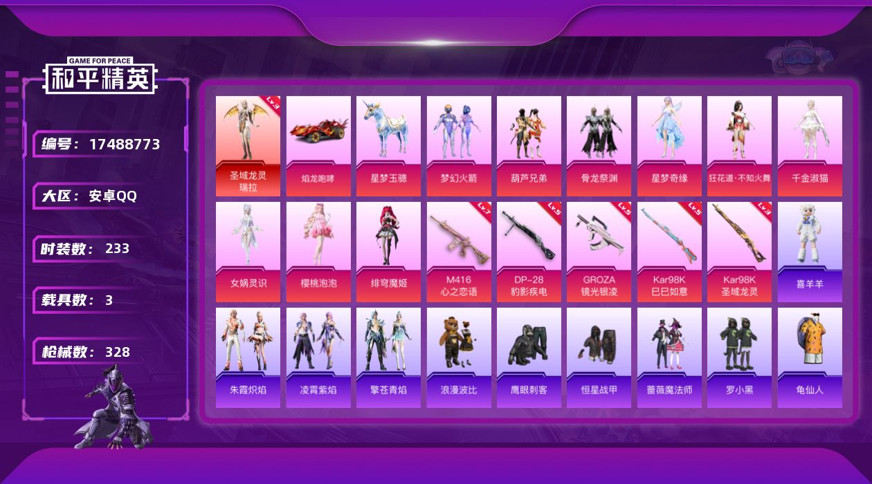 [17488773]【特价出售/店主推荐】 安卓 手Q-1神装-10粉装-6特效枪-3载具-3粉色飞行器-10.7w热力值-11王牌印记-233套装-328枪皮【红色神装等级】:圣域龙灵-瑞拉(三级)【热门品类】:粉装-梦幻火箭,套装-龟仙人,套装-浪漫波比,熔岩游骑兵连帽夹克【粉色套装】:粉装-梦幻火箭,粉装-葫芦兄弟,粉装-骨龙祭渊,角色-星梦奇缘,角色-狂花道·不知火舞,角色-千金淑猫,角色-女娲灵识,角色-樱桃泡泡,角色-绯穹魔姬【粉色枪皮等级】:M416-心之恋语(七级),GROZA-镜光银凌(五级),Kar98K-巳巳如意(五级),Kar98K-圣域龙灵(三级),Mk14-福马献瑞(二级),DP-28-豹影疾电(五级)【粉色载具】:焰龙咆哮,僚机-圣域龙宝,星梦玉骢【粉色飞行器】:炫彩糖果飞行器,星梦奇缘飞行器,圣域金龙飞行器