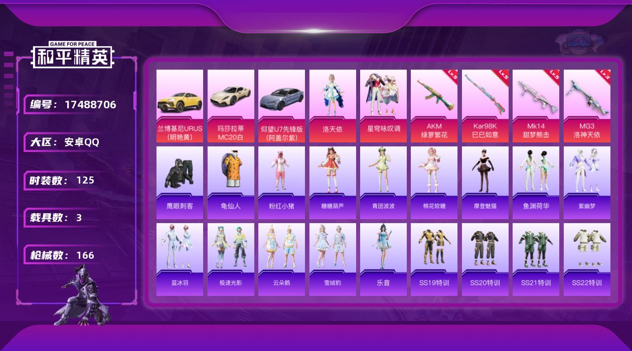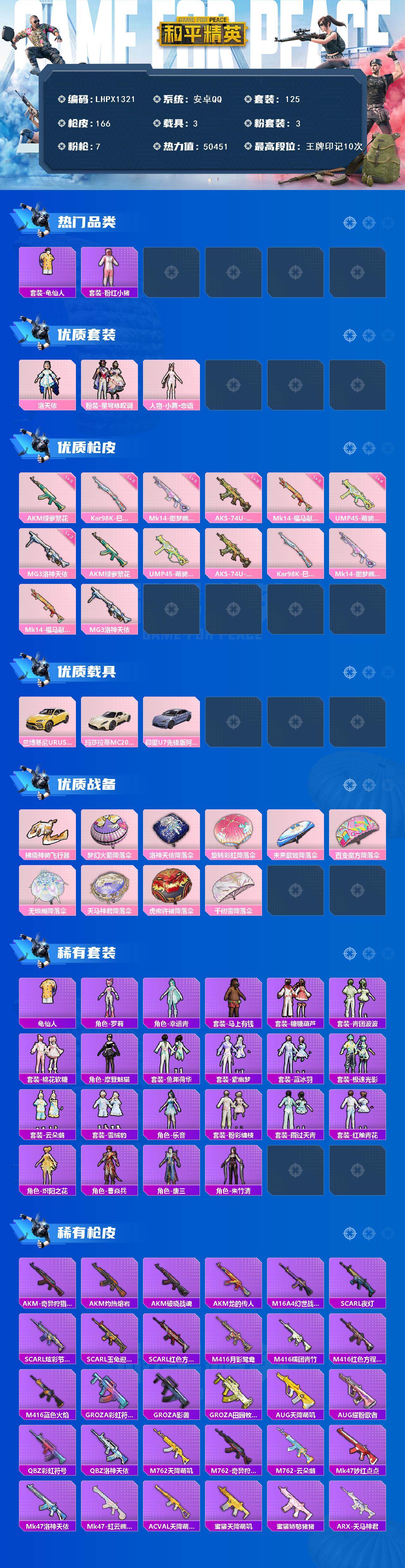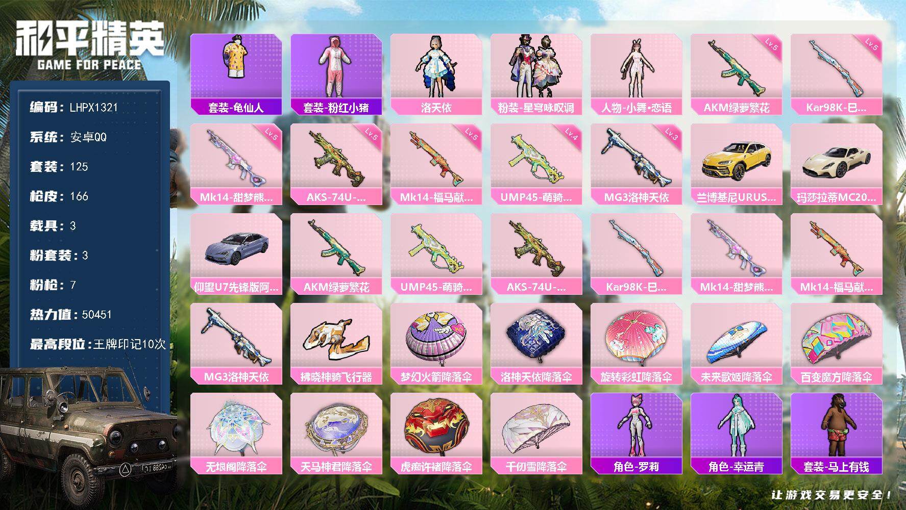 [17488706]可二次【特价出售/店主推荐】 安卓 手Q-3粉装-7特效枪-3载具-1粉色飞行器-5w热力值-10王牌印记-125套装-166枪皮【热门品类】:套装-龟仙人,套装-粉红小猪【粉色套装】:角色-洛天依,粉装-星穹咏叹调,人物-小舞·恋语【粉色枪皮等级】:AKM-绿萝繁花(五级),UMP45-萌骑冒险(四级),AKS-74U-森灵之息(五级),Kar98K-巳巳如意(五级),Mk14-甜梦熊击(五级),Mk14-福马献瑞(五级),MG3-洛神天依(三级)【粉色载具】:兰博基尼URUS(明艳黄),玛莎拉蒂MC20(星石白),仰望U7(阿盖尔紫)【粉色飞行器】:拂晓神骑飞行器