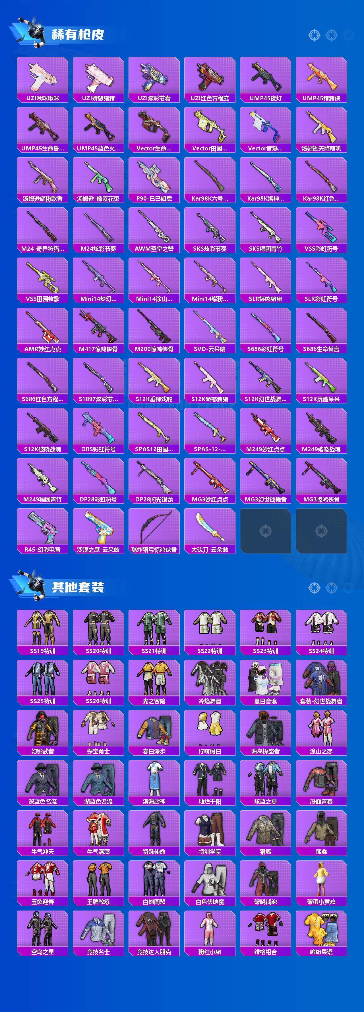 - [17509774]安卓 手Q-2粉装-6特效枪-0载具-1粉色飞行器-40621热力值-5王牌印记-106套装-151枪皮 【热门品类】:套装-龟仙人,套装-粉红小猪 【粉色套装】:角色-烟云彩露,角色-绯穹魔姬 【粉色枪皮等级】:AKS-74U-森灵之息(五级),Kar98K-巳巳如意(五级),Mk14-甜梦熊击(五级),Mk14-福马献瑞(五级),DP-28-豹影疾电(五级),PKM-江南烟雨(七级) 【粉色枪皮】:AKS-74U-森灵之息,Kar98K-巳巳如意,Mk14-甜梦熊击,Mk14-福马献瑞,DP-28-豹影疾电,PKM-江南烟雨 【粉色飞行器】:炫彩糖果飞行器 【粉色降落伞】:绝对恒星降落伞,幻影战神降落伞,神秘黑猫降落伞,江南烟雨降落伞,精灵梦叶罗丽降落伞,荧海星豚降落伞,炫彩糖果降落伞 【稀有套装】:套装-龟仙人,套装-超能元气,角色-甜心蒙太奇,套装-雪国风尚,套装-炫彩糖果,套装-马上来财,套装-粉恋花,套装-紫幽梦,套装-蓝冰羽,角色-猎影月神,套装-星渊小夜曲,套装-霓虹热舞,套装-彩虹兔,套装-云朵鹅,套装-雪绒豹,套装-书海巡游,套装-画境星梦,套装-琴音绮想,套装-雨过天青,套装-红釉青花 【稀有枪皮】:AUG-冰晶雪宝,AKM-江南烟雨,AKM-龙的传人,M16A4-幻世战舞者,SCAR-L-夜灯,SCAR-L-炫彩节奏,M416-糯团青竹,AUG-天降萌叽,AUG-幻影战神,AUG-魔法学院,AUG-绝对恒星,QBZ-彩虹符号,QBZ-神秘黑猫,M762-彩虹符号,M762-云朵鹅,M762-登顶巅峰,AC-VAL-天降萌叽,蜜獾-天降萌叽,ACE32-画境星梦,UZI-天降萌叽,UZI-幻影战神,UMP45-夜灯,UMP45-生命誓言,Vector-焰鹰斗篷,汤姆逊-天降萌叽,汤姆逊-幻影战神,汤姆逊-炫彩节奏,MP5K-画境星梦,Kar98K-幻影战神,M24-炫彩节奏,AWM-焰鹰斗篷,VSS-彩虹符号,Mini14-春暖花开,Mini14-炫彩节奏,M417-惊鸿侠骨,M200-惊鸿侠骨,M200-六号稻草人,SVD-云朵鹅,M1加兰德-画境星梦,S686-生命誓言,S12K-夜灯,S12K-幻影战神,S12K-极意拳锋,DBS-焰鹰斗篷,AA12-G-画境星梦,SPAS-12-云朵鹅,M249-彩虹符号,DP-28-焰鹰斗篷,MG3