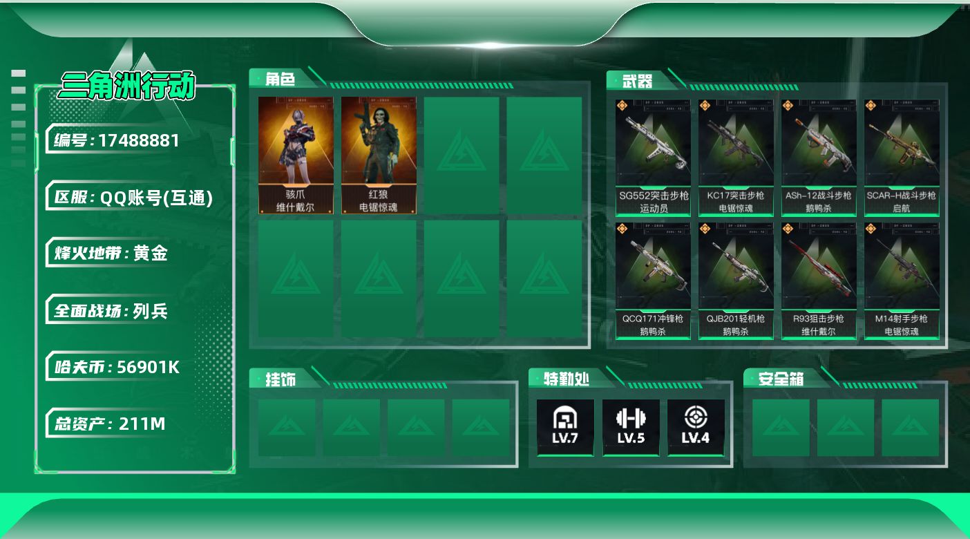[17488881]【店主推荐捡漏号!可直接换绑】56901k哈伏币-200m流动资产-60烽火等级-黄金-10战场等级-列兵 【干员外观】:骇爪-维什戴尔,红狼-电锯惊魂 【近战皮肤】:近战-黑鹰 【典藏外观】:AKS-74U突击步枪-监察 【传说级普通外观】:ASh-12战斗步枪-鹅鸭杀,SG552突击步枪-运动员,SCAR-H战斗步枪-启航,KC17突击步枪-电锯惊魂,QCQ171冲锋枪-鹅鸭杀,QJB201轻机枪-鹅鸭杀,M14射手步枪-电锯惊魂,R93狙击步枪-维什戴尔 【史诗级普通外观】:AUG突击步枪-蝮蛇,SCAR-H战斗步枪-囚徒,G3战斗步枪-流沙送葬,AS Val突击步枪-百步穿杨,MP5冲锋枪-战术竞备,Vector冲锋枪-异域战争,PKM通用机枪-蝮蛇,M250通用机枪-囚徒,M700狙击步枪-哈夫克警备 【稀有级普通外观】:ASh-12战斗步枪-繁盛,AUG突击步枪-指挥官,M7战斗步枪-捣蛋鬼,腾龙突击步枪-冰天雪地,MP5冲锋枪-弄臣,MP5冲锋枪-哈夫克卫队,P90冲锋枪-黄昏,UZI冲锋枪-精英联盟,UZI冲锋枪-亚特兰蒂斯,SMG-45-行动开启,SMG-45冲锋枪-幻影结构,勇士冲锋枪-主宰,勇士冲锋枪-冰天雪地,M1014霰弹枪-幻影结构,Mini-14射手步枪-荣耀列队,SKS射手步枪-弄臣,SV-98狙击步枪-星链科技,SV-98狙击步枪-哈夫克航天,SV-98狙击步枪-精英联盟,G18-星链科技,G18-哈夫克航天 【普通级普通外观】:M4A1突击步枪-粉色涂装,M4A1突击步枪-高雅黑,QBZ95-1突击步枪-海浪,QBZ95-1突击步枪-三角洲力量,QBZ95-1突击步枪-海色,K416突击步枪-几何迷彩,K416突击步枪-高雅黑,M16A4突击步枪-高雅黑,AUG突击步枪-浅蓝涂装,M7战斗步枪-红色涂装,SG552突击步枪-浅蓝涂装,SG552突击步枪-海浪,AK-12突击步枪-变色龙,SCAR-H战斗步枪-数码迷彩,G3战斗步枪-高雅黑,PTR-32突击步枪-黄蜂,CAR-15突击步枪-变色龙,MP5冲锋枪-黄蜂,Vector冲锋枪-几何迷彩,UZI冲锋枪-海色,野牛冲锋枪-高雅黑,SR-3M紧凑突击步枪-变色龙,M1014霰弹枪-高雅黑,M1014霰弹枪-海浪,M1014霰弹枪-变色龙,M249轻机枪-黄蜂,M250通用机