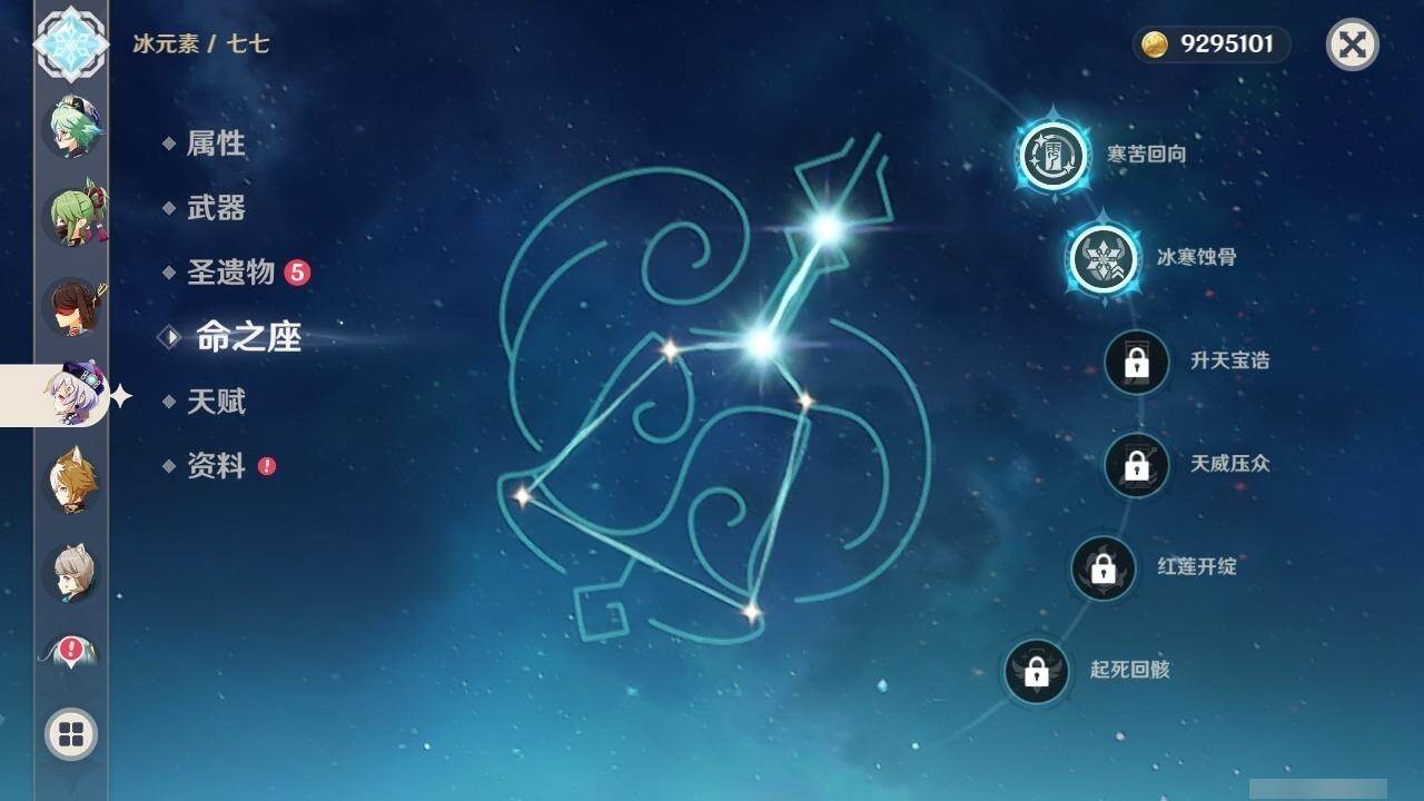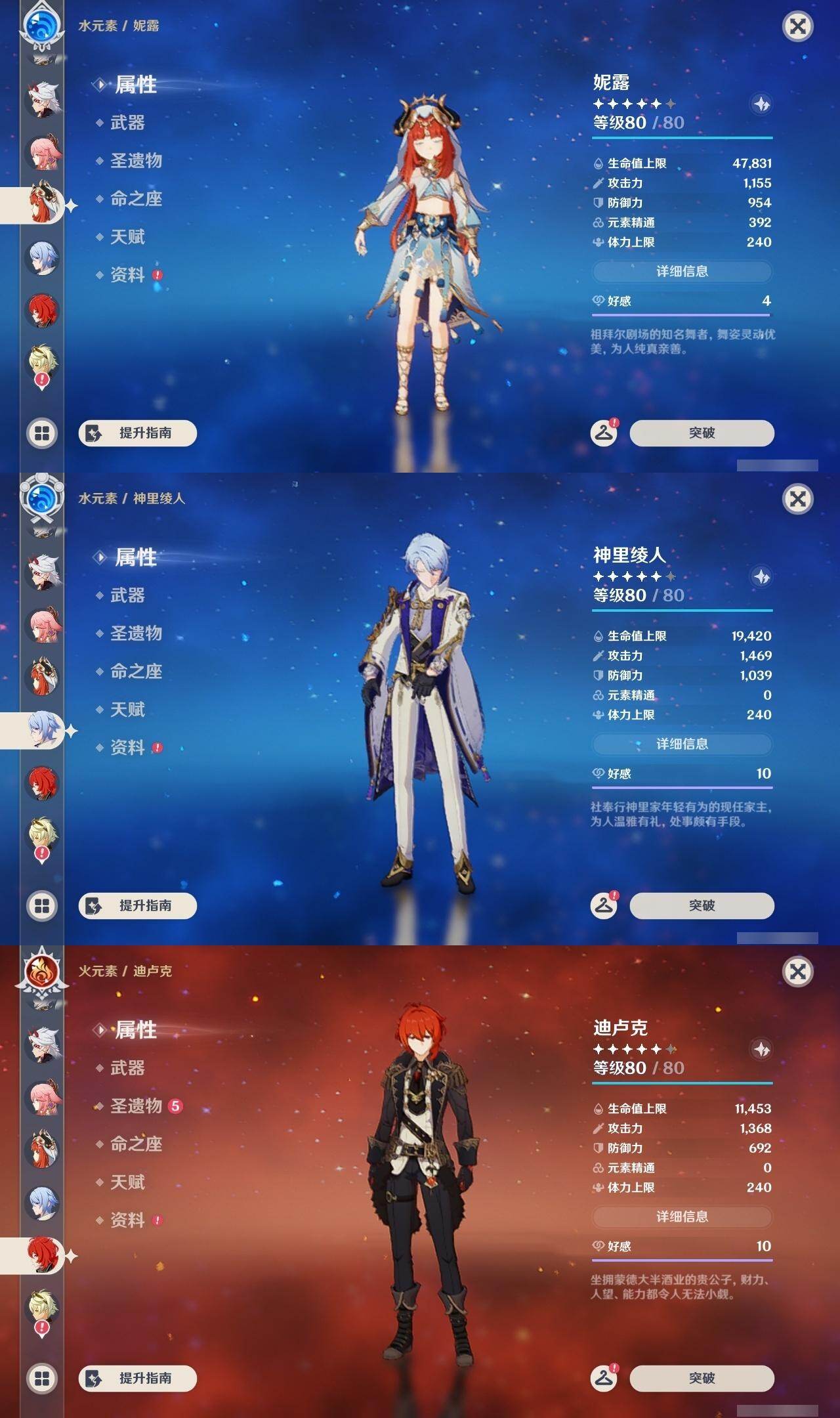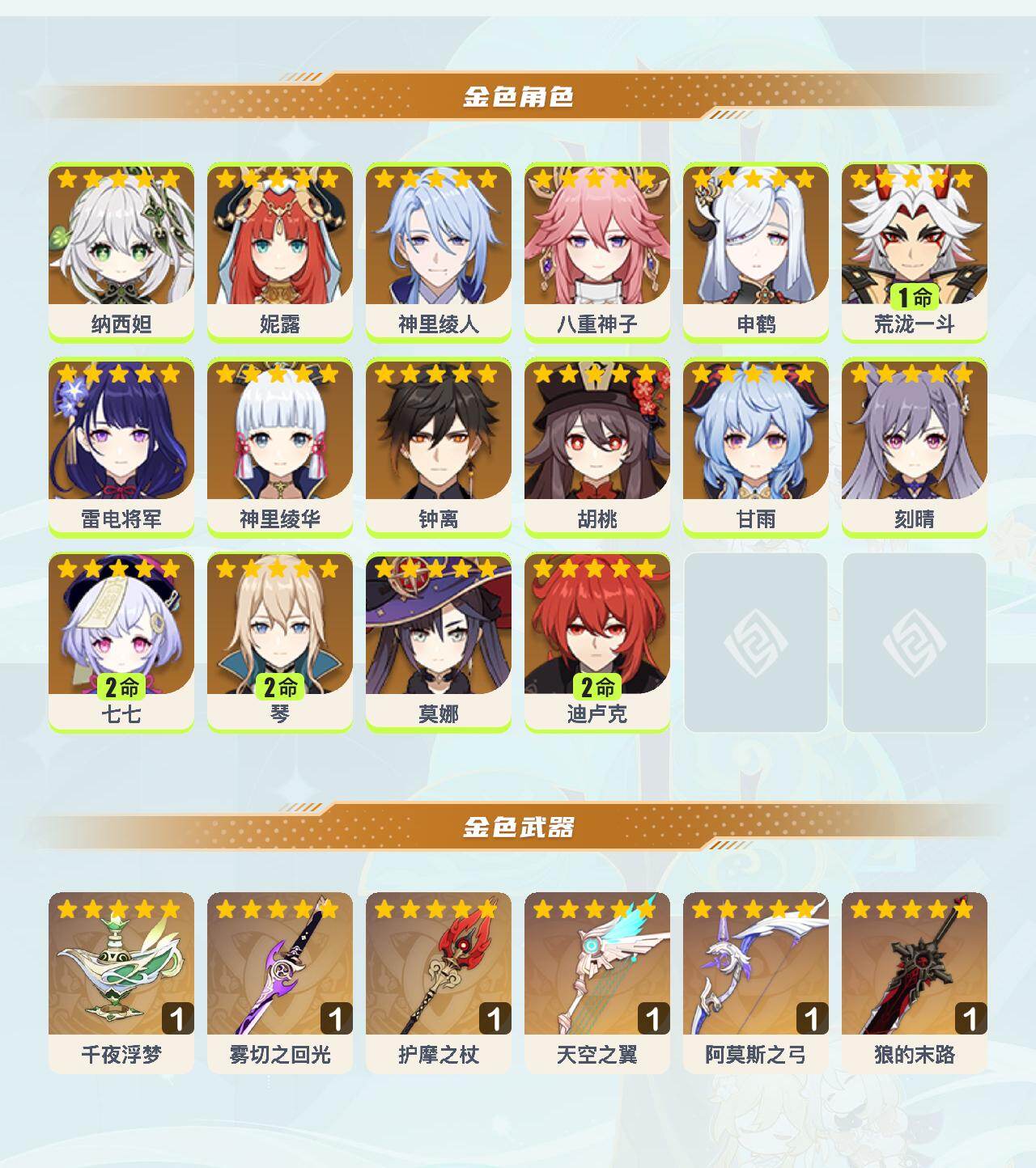 0命纳西妲,0命妮露,0命神里绫人,0命八重神子,0命申鹤,1命荒泷一斗,0命雷电将军,0命神里绫华,0命钟离,0命胡桃,0命甘雨,0命刻晴,2命七七,2命琴,0命莫娜,2命迪卢克,精1千夜浮梦,精1雾切之回光,精1护摩之杖,精1天空之翼,精1阿莫斯之弓,精1狼的末路