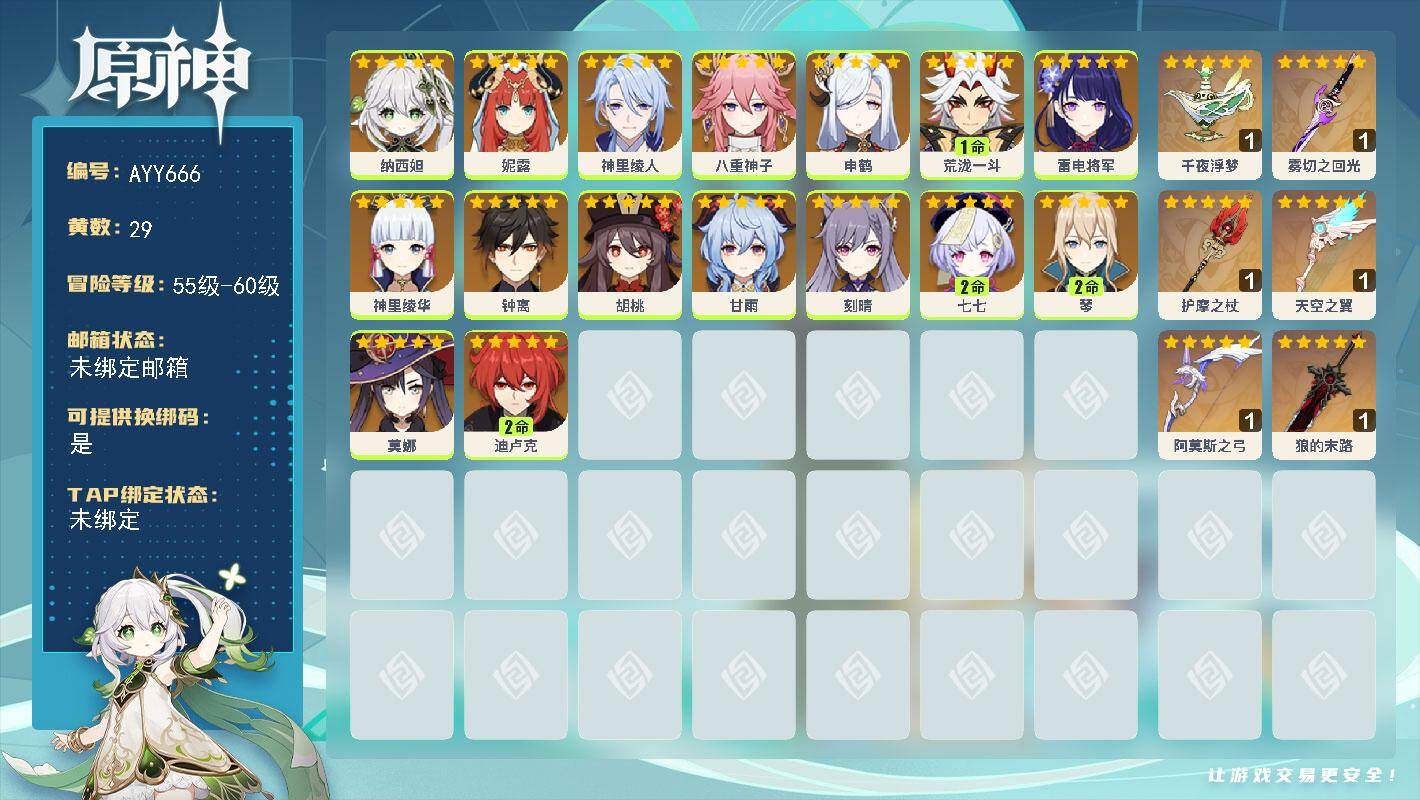 [17490765]57级/29黄/女主/16个五星角色/6个五星武器 0命纳西妲,0命妮露,0命神里绫人,0命八重神子,0命申鹤,1命荒泷一斗,0命雷电将军,0命神里绫华,0命钟离,0命胡桃,0命甘雨,0命刻晴,2命七七,2命琴,0命莫娜,2命迪卢克,精1千夜浮梦,精1雾切之回光,精1护摩之杖,精1天空之翼,精1阿莫斯之弓,精1狼的末路